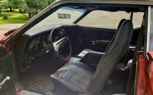 The interior is going to need restoration work, but it appears to be complete. The vinyl bucket seats have some popped seams and are dusty, but replacement covers are readily available. The dash cap has cracks and several additional gauges have been added, but the dash hasn’t been cut up. Replacement dash caps are available, as are dash trim and components. The seller notes that a previous owner replaced the driver’s side floorpan and it has held up well.