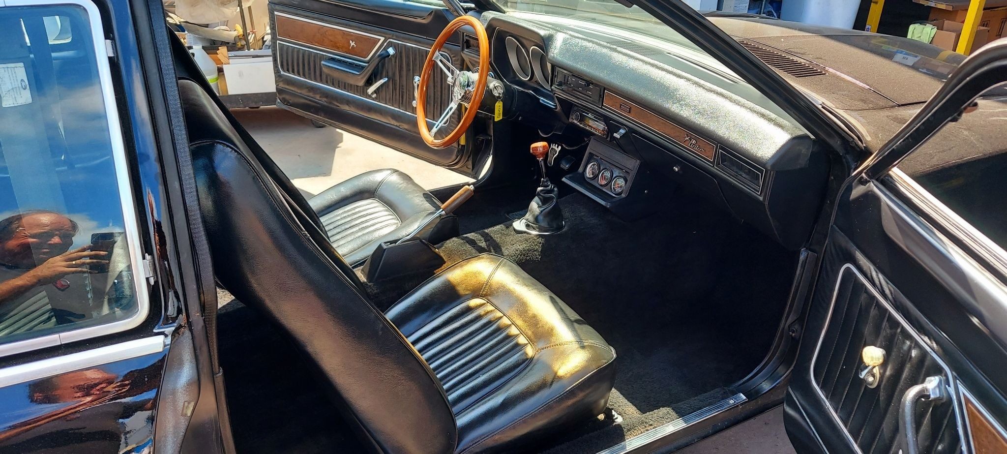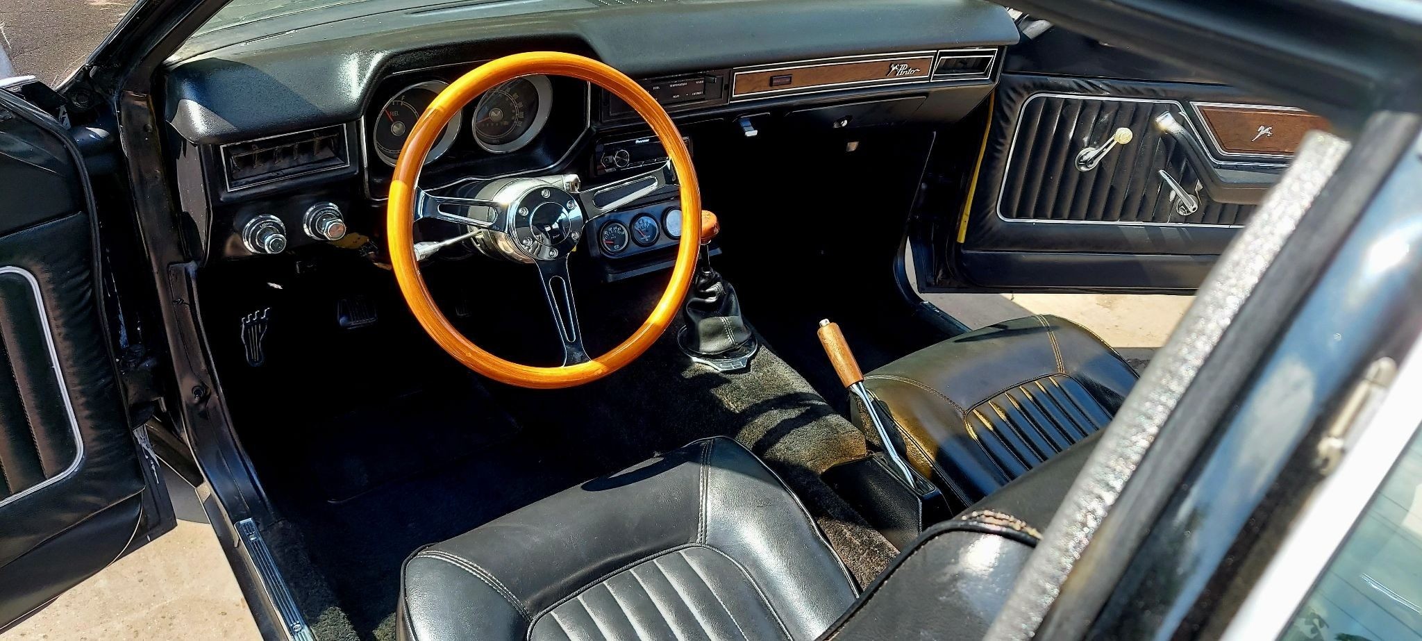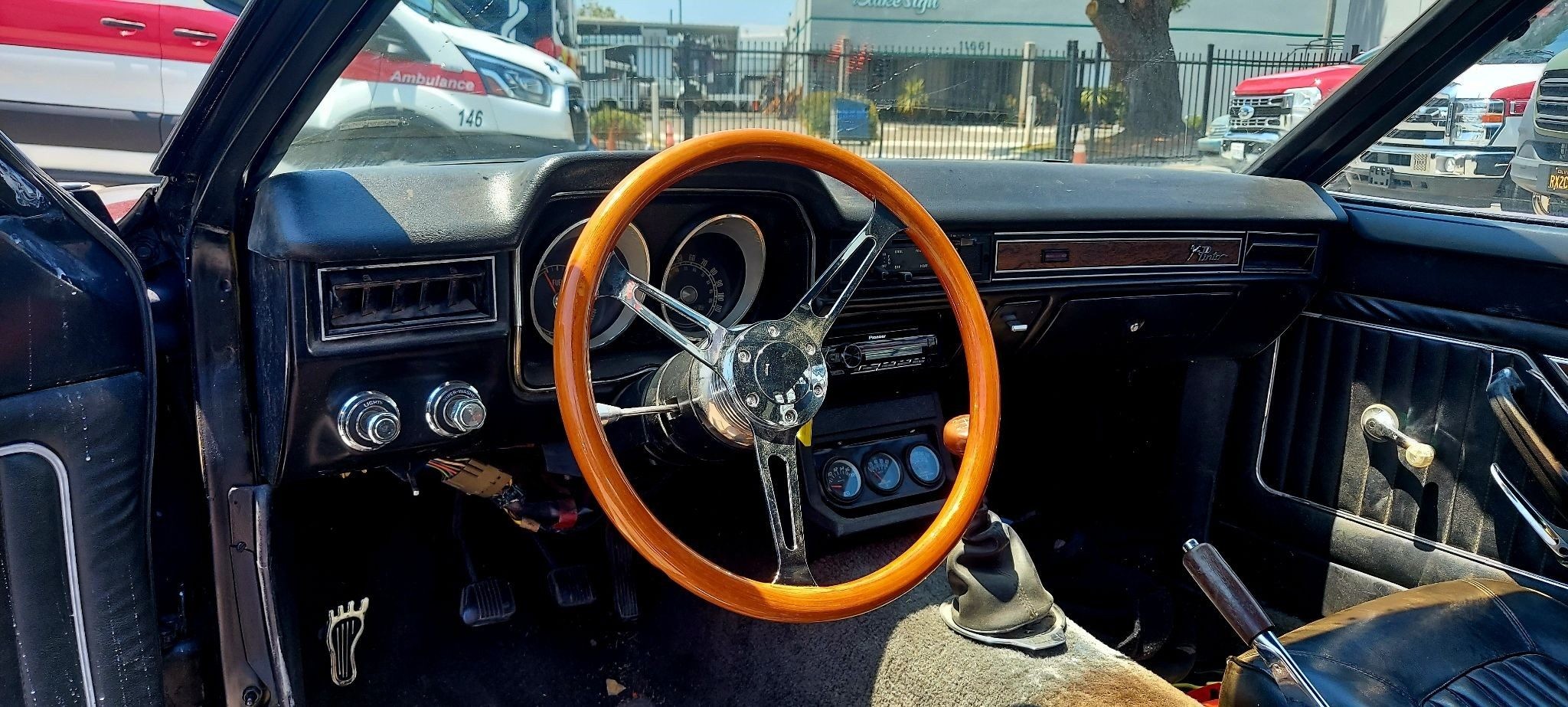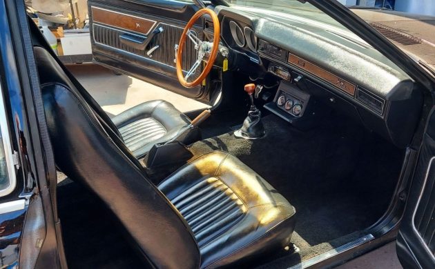 Inside, the seller describes the car as having its original deluxe factory interior, with thoughtful updates that include a Bluetooth-equipped stereo with hands-free capability, a wood steering wheel, a console gauge cluster, and a dash cap upgrade. The driver’s seat has two small areas where the stitching has come apart, but otherwise, the interior presents well for its age.