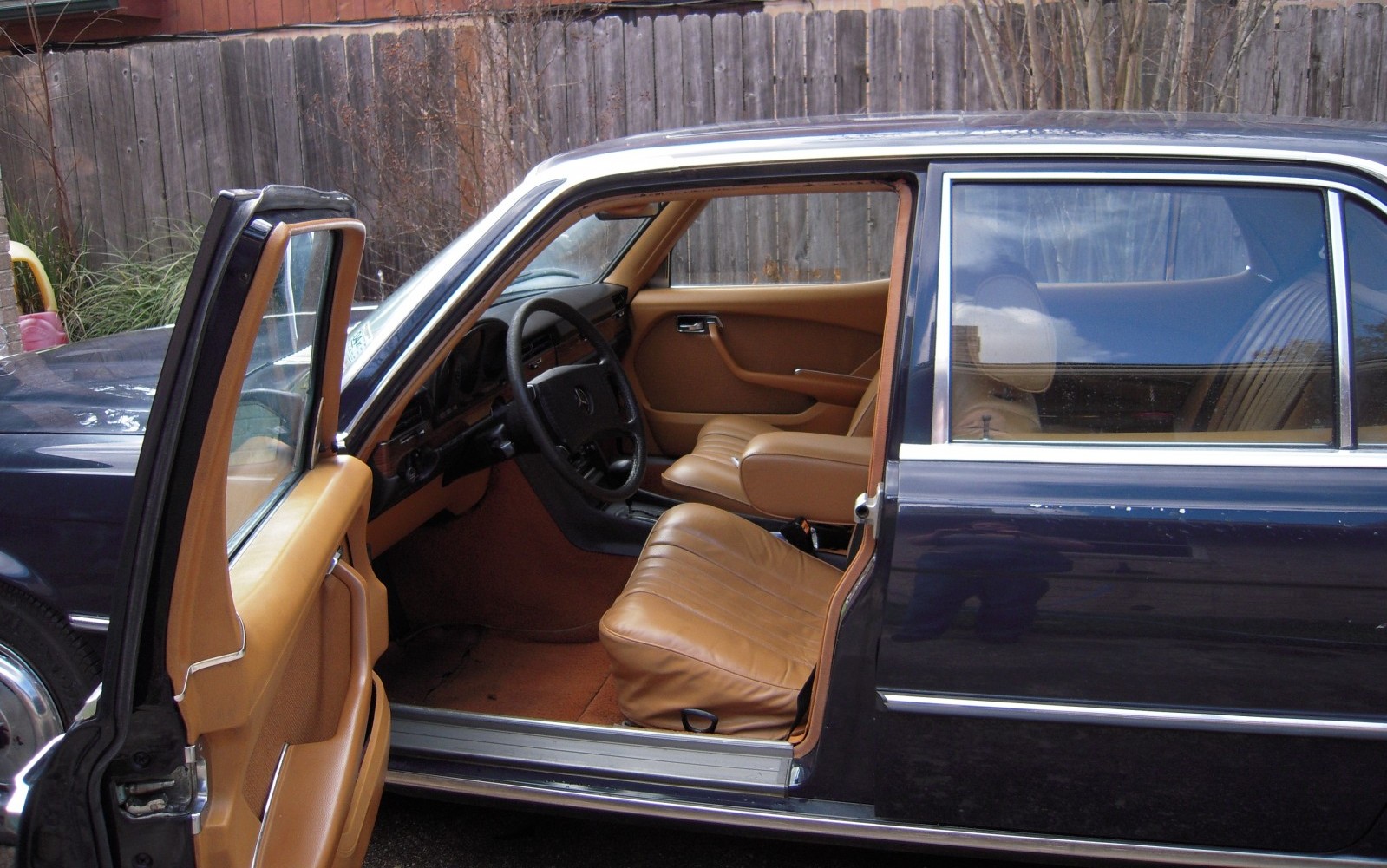 From Mason H. – Single family-owned Mercedes Benz 280S with sun roof. Stored in attached enclosed garage for 11 years, but fully functional prior to storage. Great project car! The car has dark blue original paint with original tan leather interior, manufactured in Germany and shipped to the US as far as I can tell. It has relatively low mileage and was driven in Newport Beach California for the majority of the mileage and shipped to Texas on my grandmother’s death in 2003. I can include the original bill of sale to my grandmother who flew to the factory delivery point and took ownership, then drove it across the US.