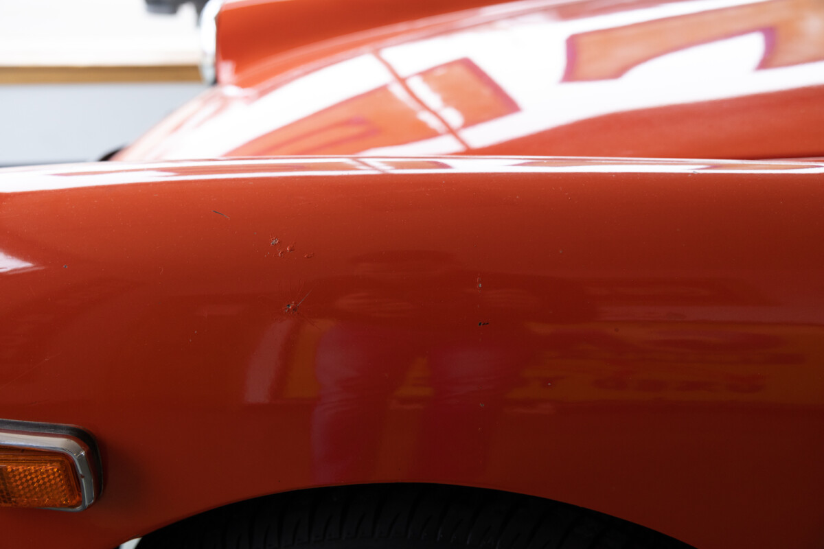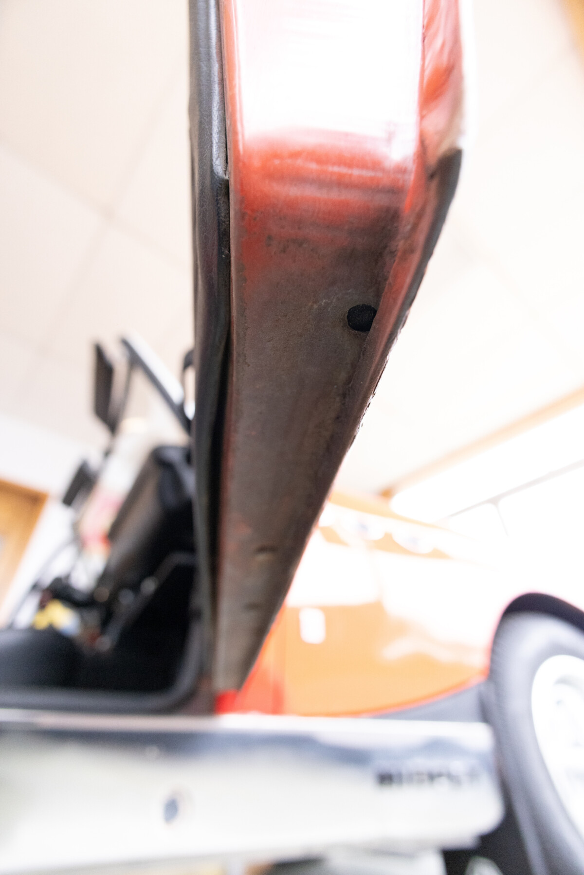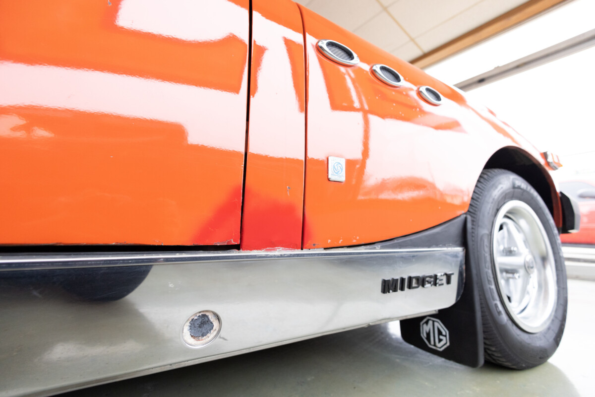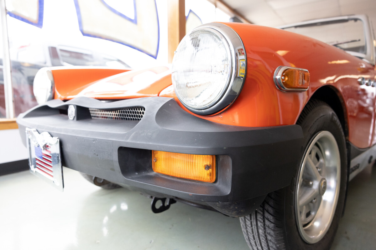 I have a 76 Midget , blaze orange or red as its called. Mine has about 40k on it sorry doesnt have those abominable side ports nor the tacked on side kick pans that look like they will fall off if you hit a pothole. Why didnt they just deal with the normal bit of rust instead of covering it up? The Wavy front bumper is most likely from someone sitting on the front bumper or something heavy on it. The bars supporting the rubber is bent, not a hard fix but it is unsightly , why didnt they even attempt to repair that? The engine appears to still have the air pump that was put on to appease the US emission mandates. Those usually are removed after a time although I did have a 75 midget that never passed emissions when I went for a sticker despite my constant repairing of the system. I still have my 76 but its been semi retired with a growing family and the purchase of a Triumph Herald convertible. The lumenition kit is the best upgrade you can do for the Lucas ignition , for years I would store mine for the winter and in spring lean into the car, pull the choke and turn the key without touching the gas pedal and it would spring to life. If anyone on here decides to purchase this, please consider getting the stick on Buick ports removed along with the tacked on running boards. Oh one more thing if you are going to paint the wheels anything other than the original silver with the black insert, go black with the chrome lugs and trim rings not just the looks like its not finished silver.