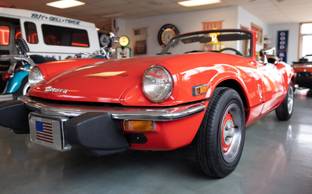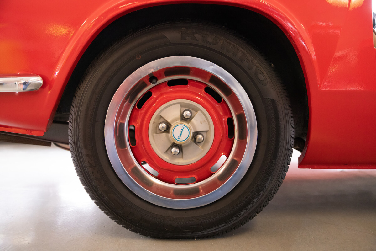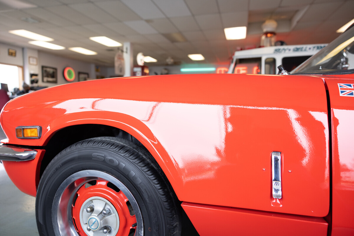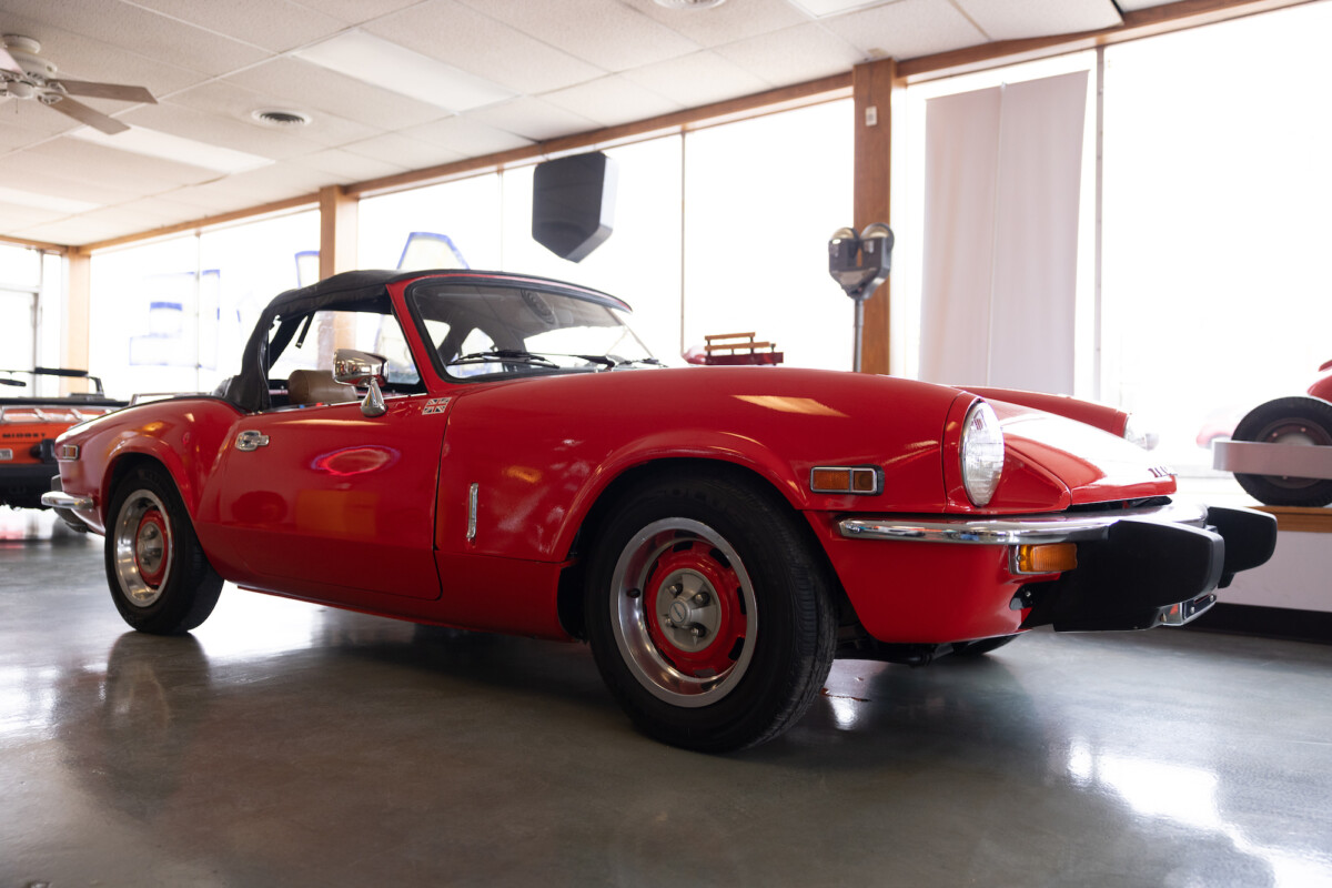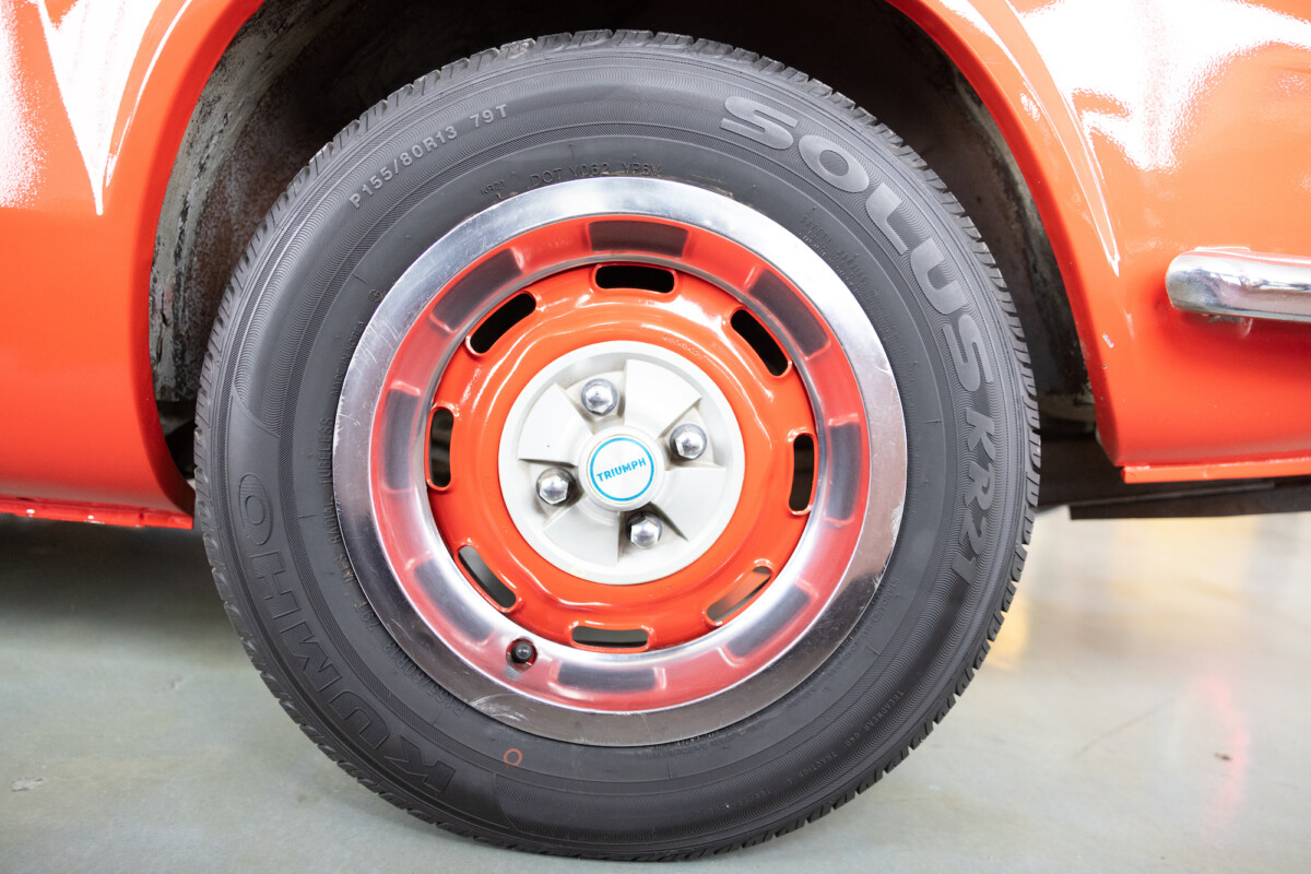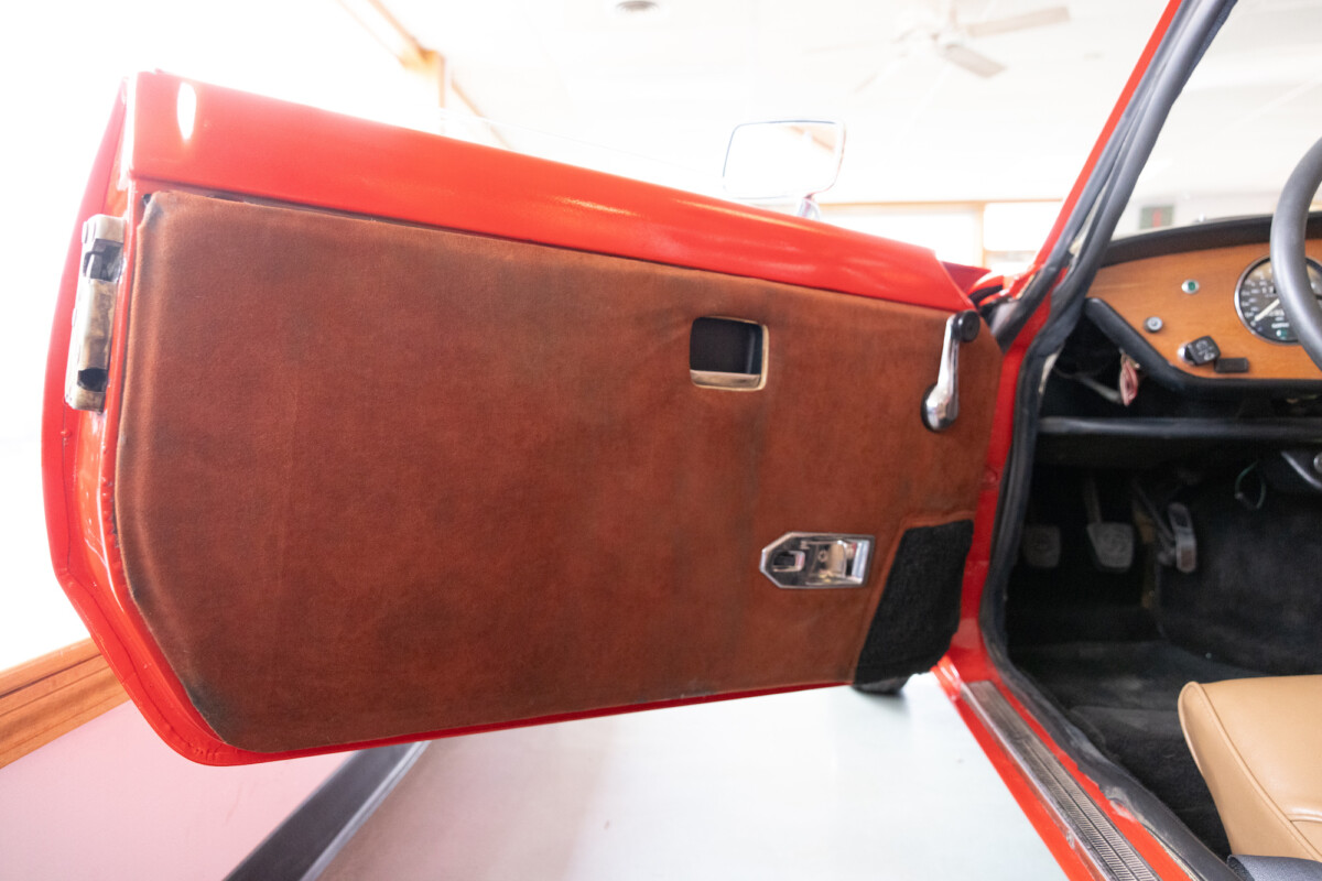 Triumph hit a sweet spot with the Spitfire’s styling, electing to perform minor cosmetic upgrades and those required by legislative changes during its long production run. It is a stereotypical British sports car, offering seating for two and a peppy little four-cylinder engine. This Triumph presents beautifully in Pimento Red. It has undergone a high-end color change, with the Tag indicating it rolled off the showroom floor wearing the less attractive Russet Brown. If you compare the two shades, the current one dramatically lifts the car’s overall appearance. The paint shines warmly, with no flaws or defects worth mentioning. The panels are straight, with consistent gaps across the entire vehicle. There is no rust, and the Black soft-top is excellent. The Spitfire sports the correct bumpers and rolls on a set of color-coded sports wheels with chrome center caps and trim rings.