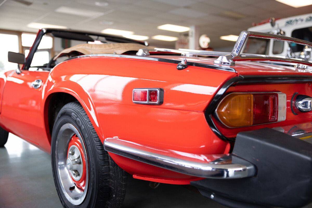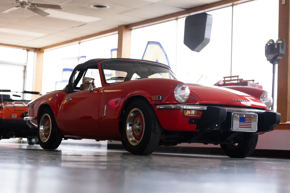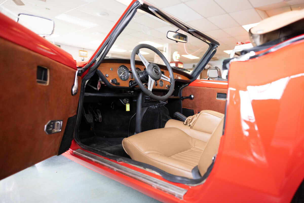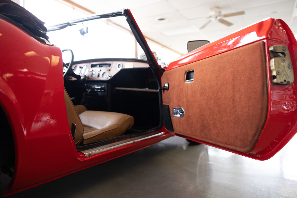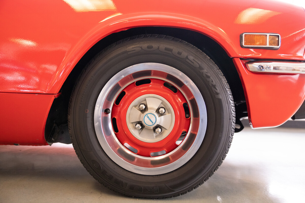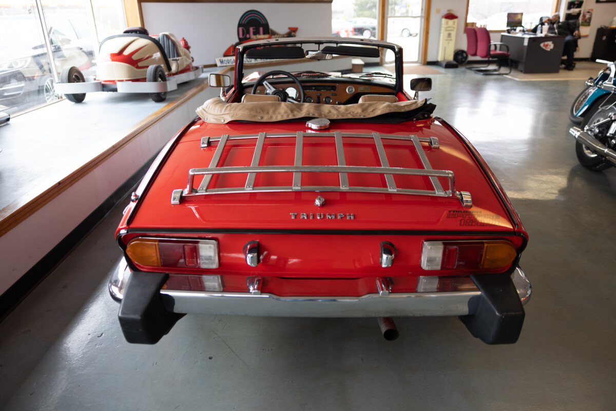 Triumph hit a sweet spot with the Spitfire’s styling, electing to perform minor cosmetic upgrades and those required by legislative changes during its long production run. It is a stereotypical British sports car, offering seating for two and a peppy little four-cylinder engine. This Triumph presents beautifully in Pimento Red. It has undergone a high-end color change, with the Tag indicating it rolled off the showroom floor wearing the less attractive Russet Brown. If you compare the two shades, the current one dramatically lifts the car’s overall appearance. The paint shines warmly, with no flaws or defects worth mentioning. The panels are straight, with consistent gaps across the entire vehicle. There is no rust, and the Black soft-top is excellent. The Spitfire sports the correct bumpers and rolls on a set of color-coded sports wheels with chrome center caps and trim rings.