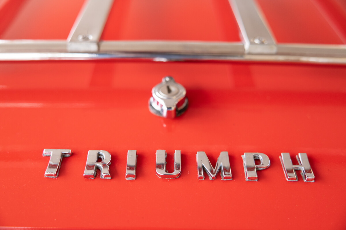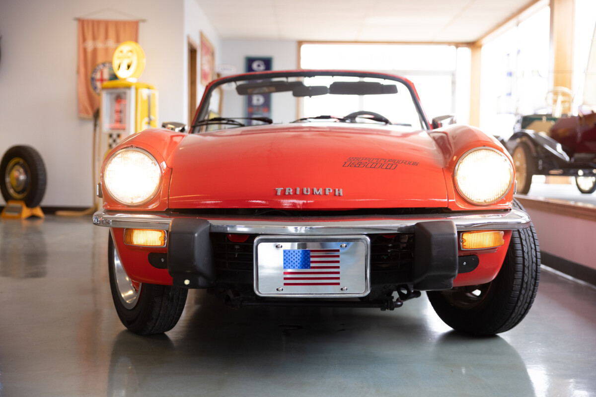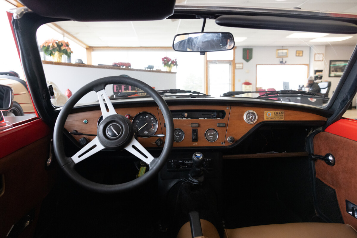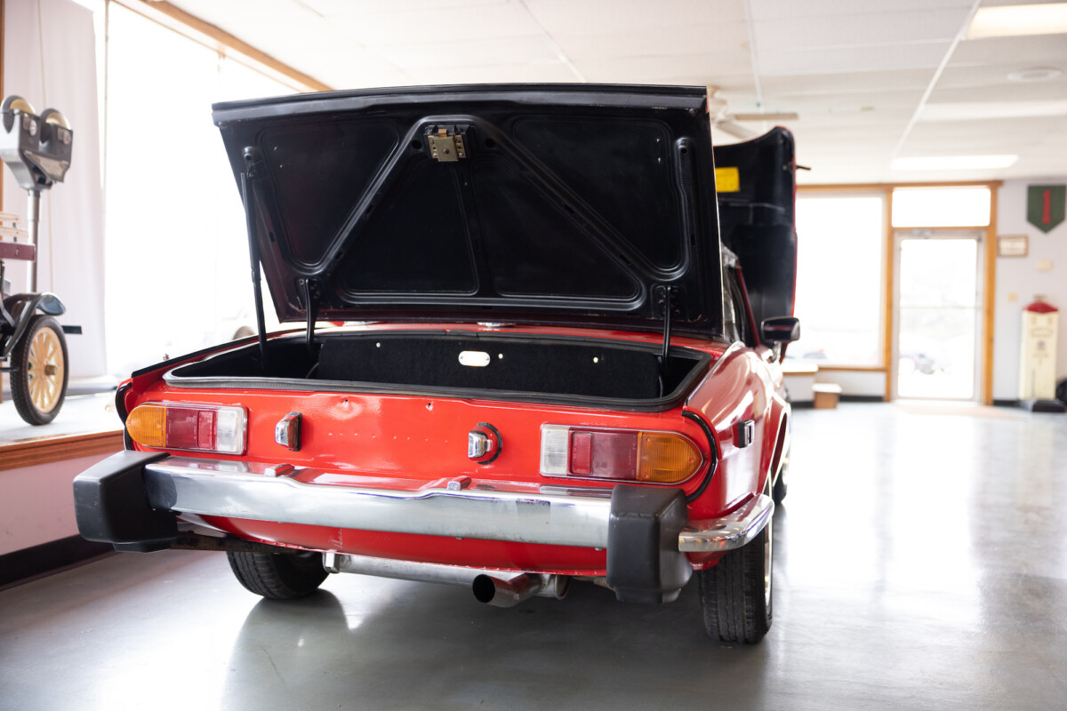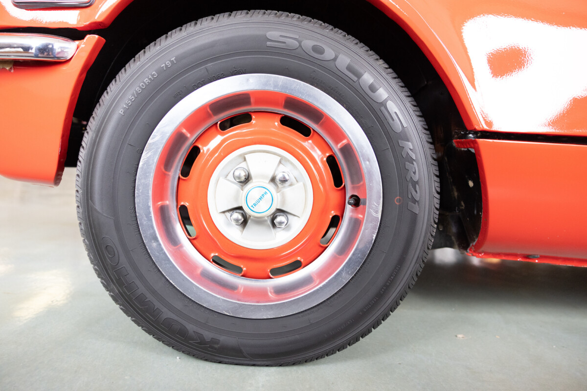 Triumph hit a sweet spot with the Spitfire’s styling, electing to perform minor cosmetic upgrades and those required by legislative changes during its long production run. It is a stereotypical British sports car, offering seating for two and a peppy little four-cylinder engine. This Triumph presents beautifully in Pimento Red. It has undergone a high-end color change, with the Tag indicating it rolled off the showroom floor wearing the less attractive Russet Brown. If you compare the two shades, the current one dramatically lifts the car’s overall appearance. The paint shines warmly, with no flaws or defects worth mentioning. The panels are straight, with consistent gaps across the entire vehicle. There is no rust, and the Black soft-top is excellent. The Spitfire sports the correct bumpers and rolls on a set of color-coded sports wheels with chrome center caps and trim rings.
