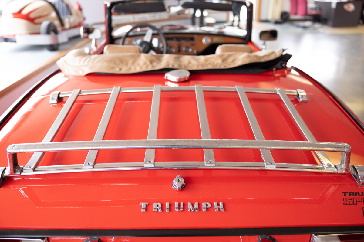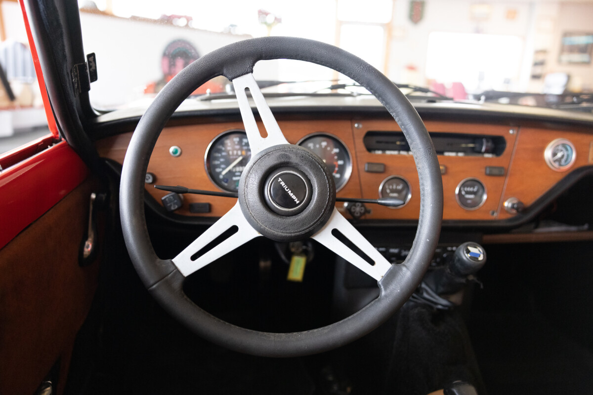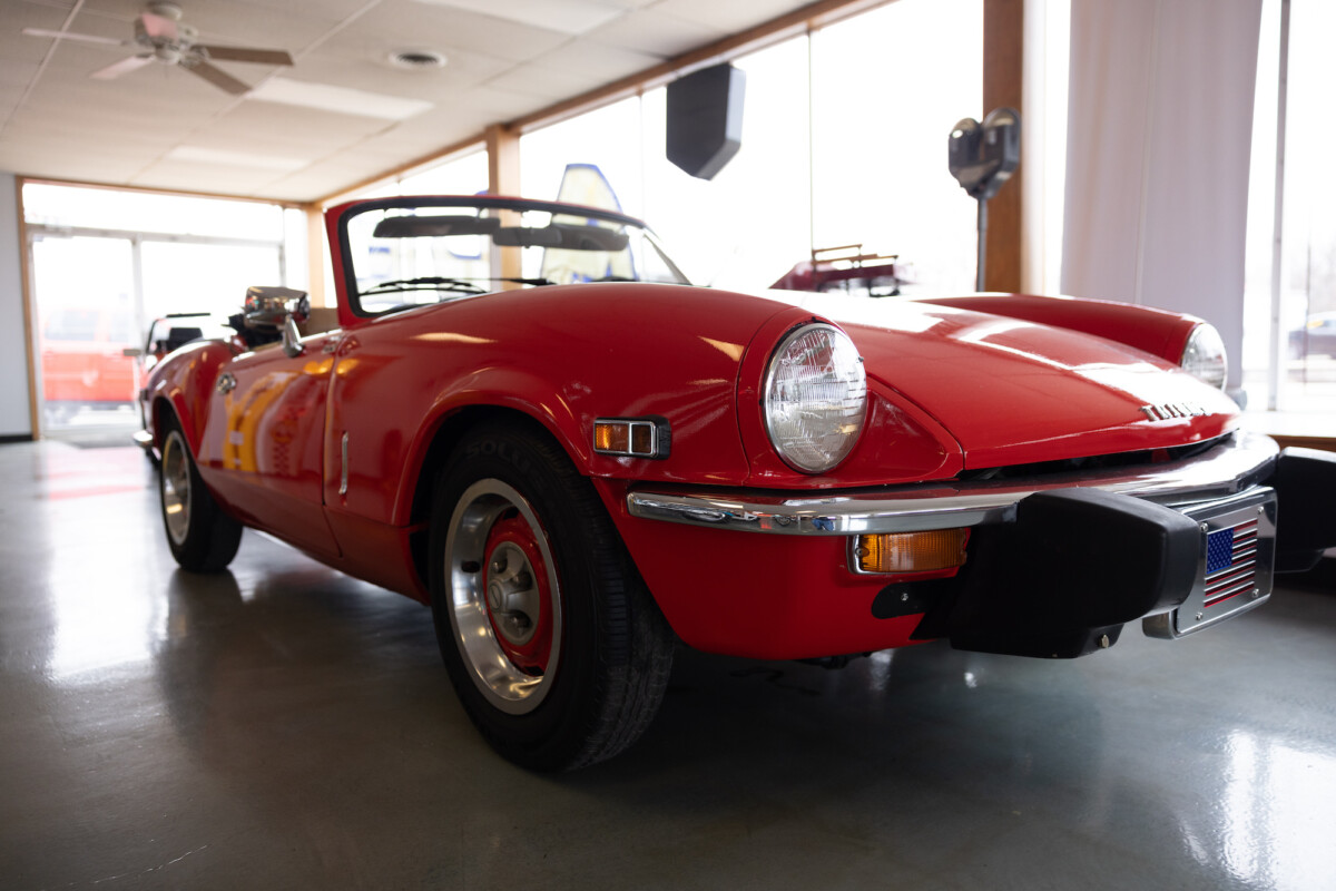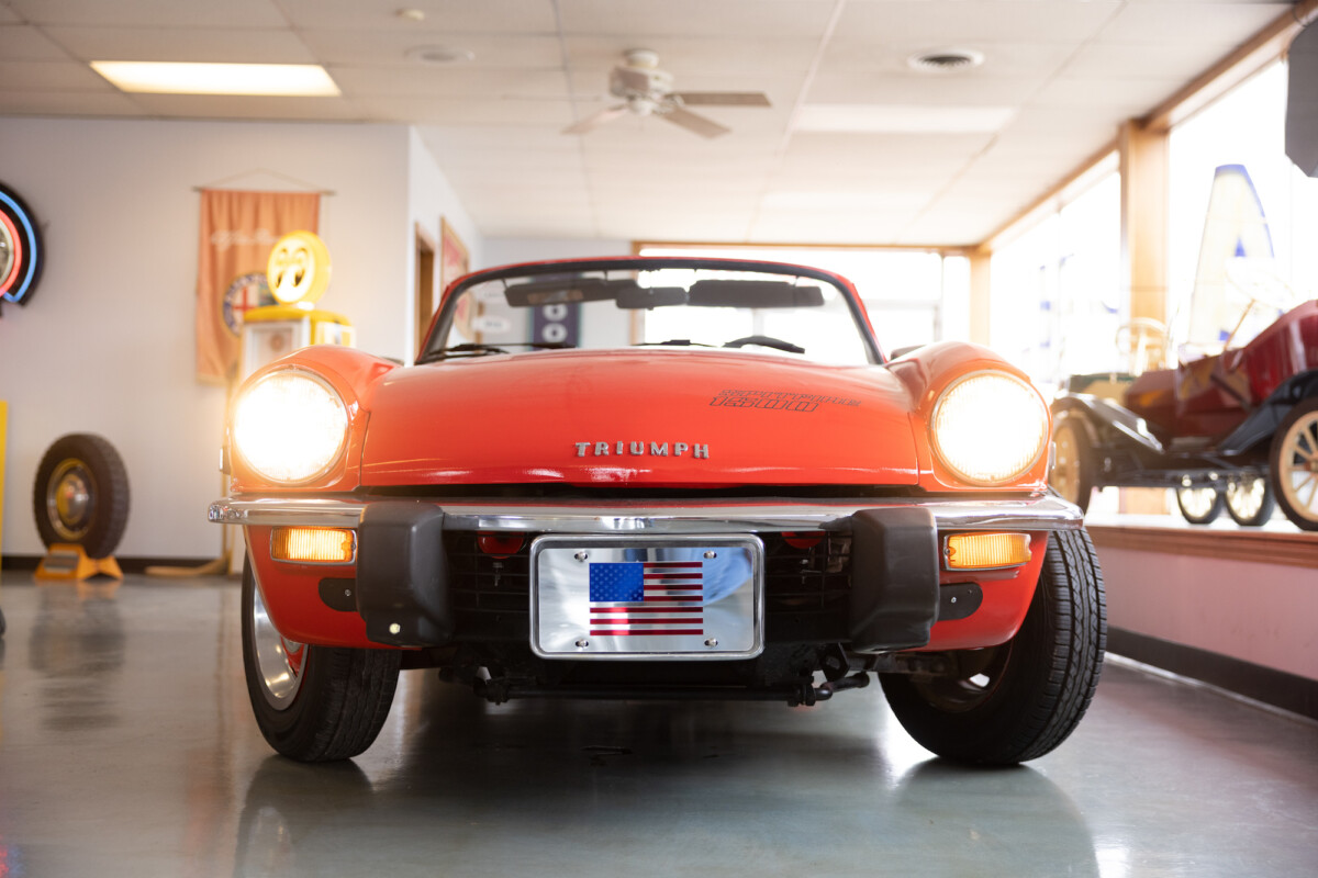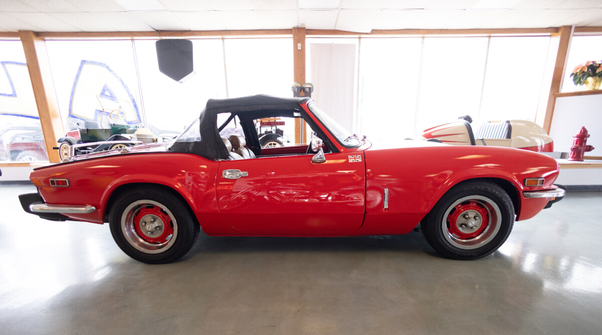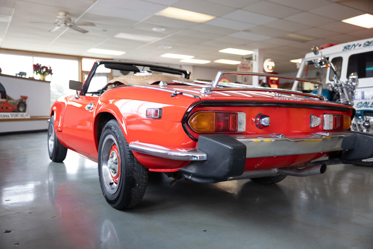 Triumph hit a sweet spot with the Spitfire’s styling, electing to perform minor cosmetic upgrades and those required by legislative changes during its long production run. It is a stereotypical British sports car, offering seating for two and a peppy little four-cylinder engine. This Triumph presents beautifully in Pimento Red. It has undergone a high-end color change, with the Tag indicating it rolled off the showroom floor wearing the less attractive Russet Brown. If you compare the two shades, the current one dramatically lifts the car’s overall appearance. The paint shines warmly, with no flaws or defects worth mentioning. The panels are straight, with consistent gaps across the entire vehicle. There is no rust, and the Black soft-top is excellent. The Spitfire sports the correct bumpers and rolls on a set of color-coded sports wheels with chrome center caps and trim rings.