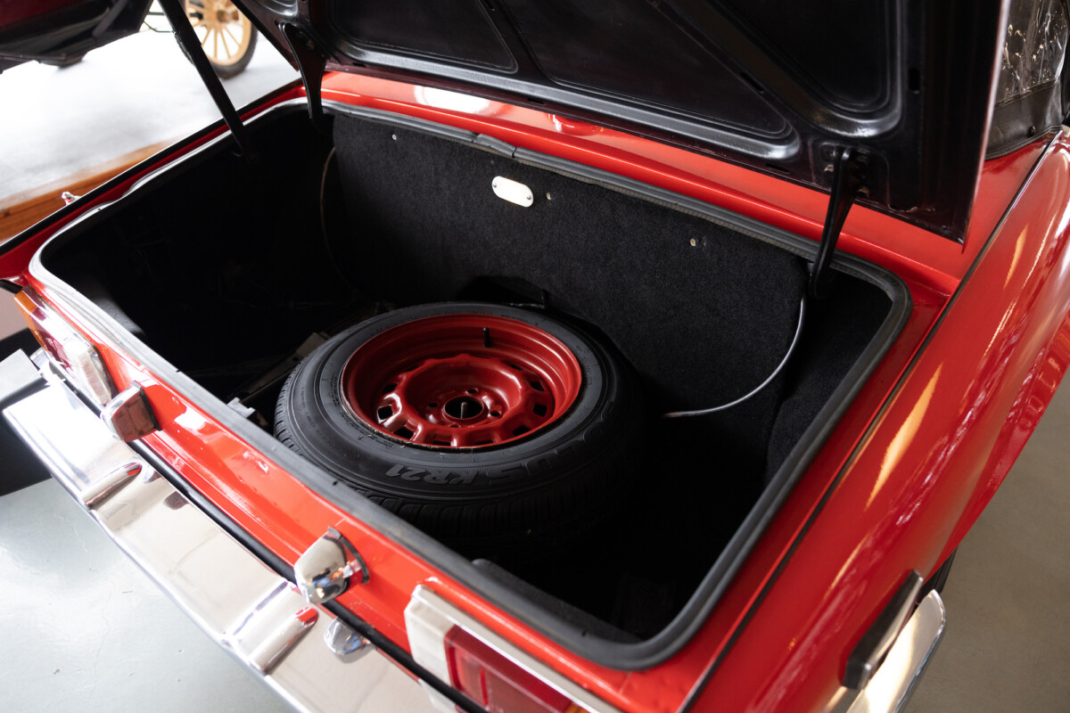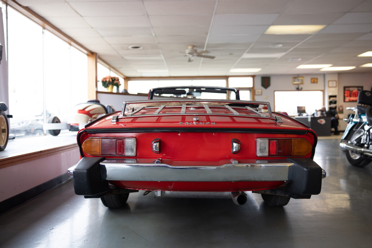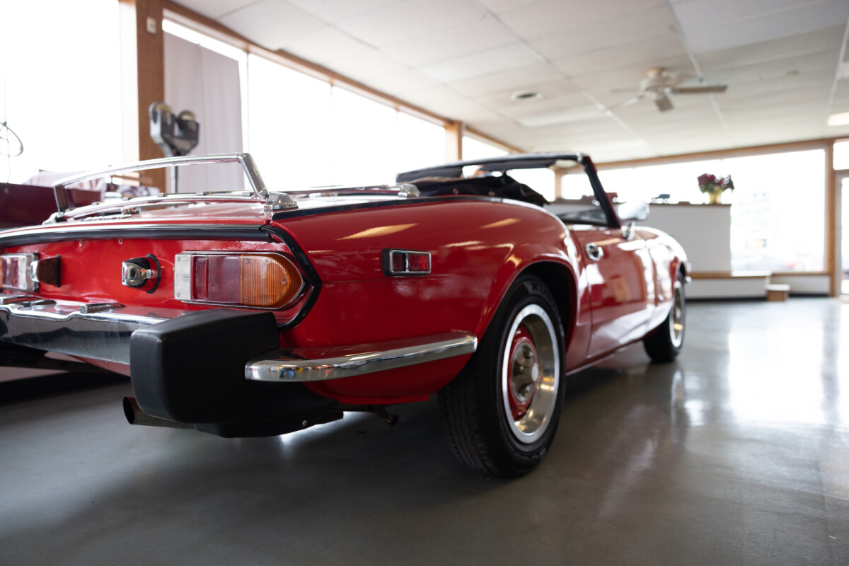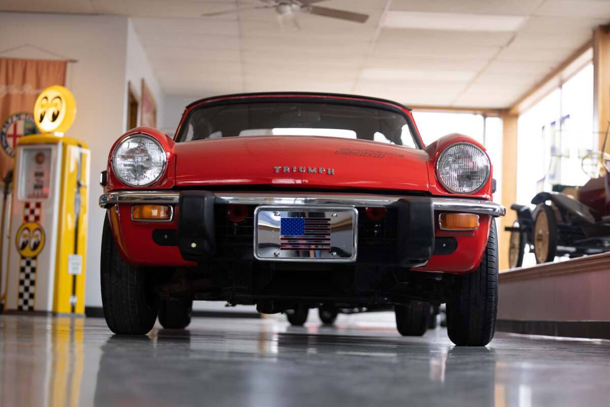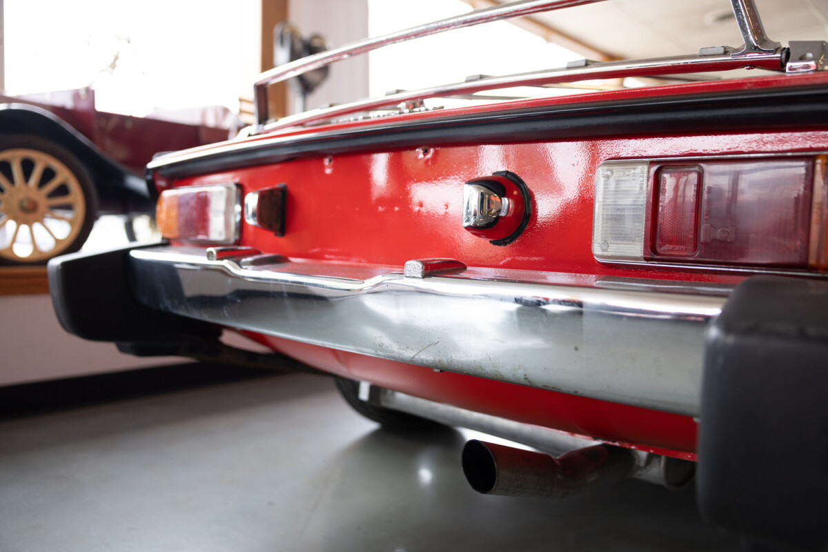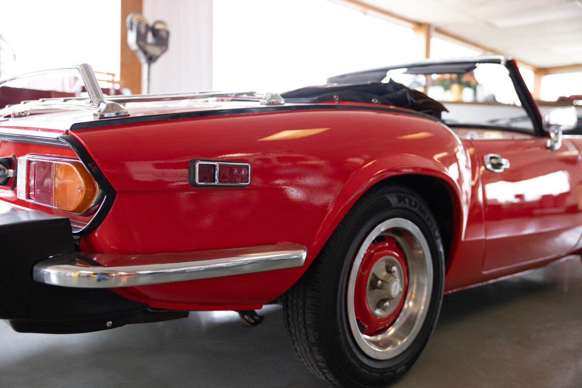 Triumph hit a sweet spot with the Spitfire’s styling, electing to perform minor cosmetic upgrades and those required by legislative changes during its long production run. It is a stereotypical British sports car, offering seating for two and a peppy little four-cylinder engine. This Triumph presents beautifully in Pimento Red. It has undergone a high-end color change, with the Tag indicating it rolled off the showroom floor wearing the less attractive Russet Brown. If you compare the two shades, the current one dramatically lifts the car’s overall appearance. The paint shines warmly, with no flaws or defects worth mentioning. The panels are straight, with consistent gaps across the entire vehicle. There is no rust, and the Black soft-top is excellent. The Spitfire sports the correct bumpers and rolls on a set of color-coded sports wheels with chrome center caps and trim rings.