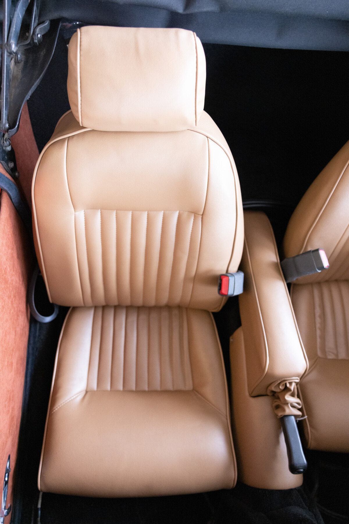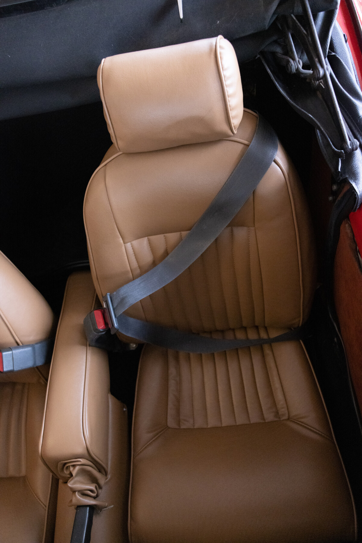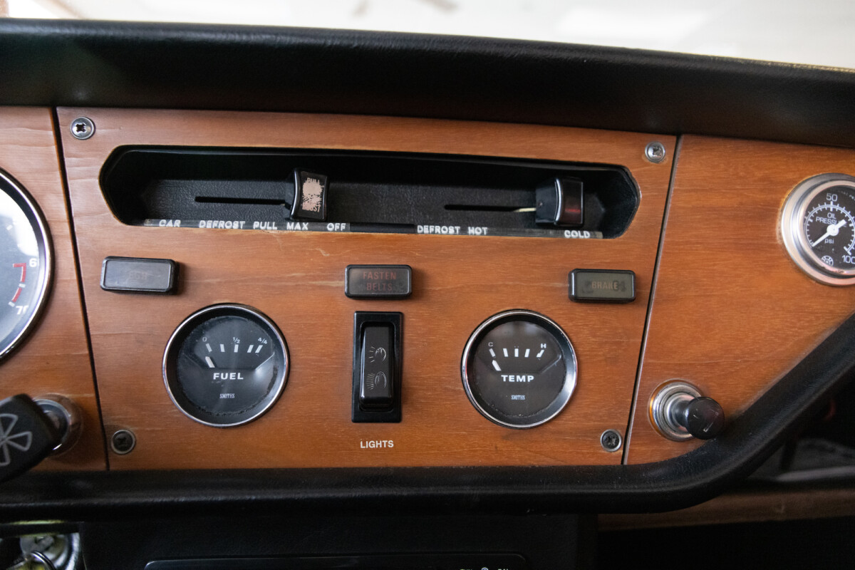 Traditional British sports cars offer seating for two, and the Spitfire is no exception. This car carries the features you would expect, including comfortable bucket seats and a timber dash with an excellent array of gauges that cement its sporting credentials. The upholstered surfaces wear Tan vinyl that looks excellent. There is no wear or damage, with the same true of the dash and the carpet. The gauges have crisp markings and clear lenses, and the heater controls fall readily to hand. The thick wheel should help prevent fatigue on long journeys, while the retro-style stereo provides tunes on the move.