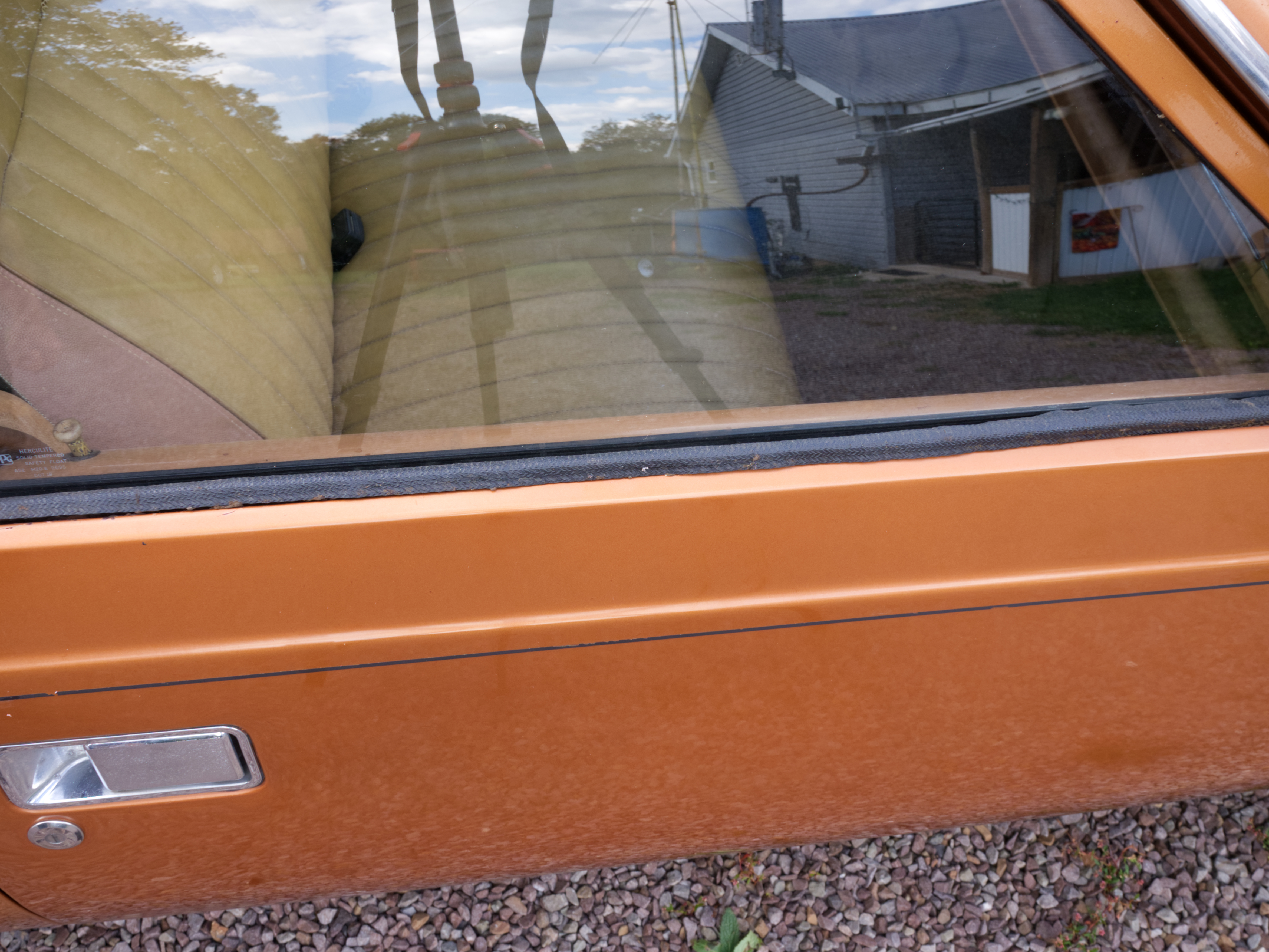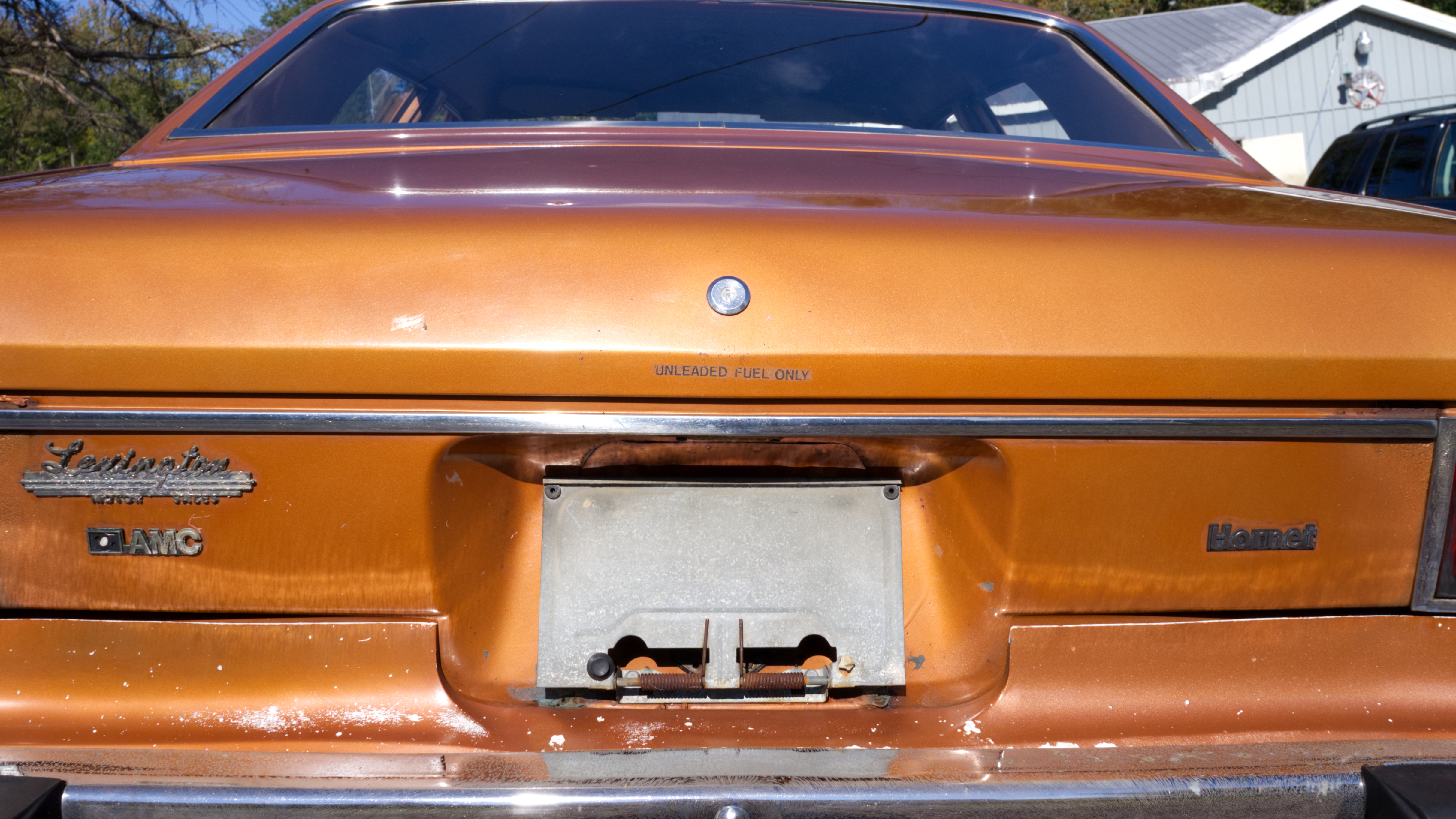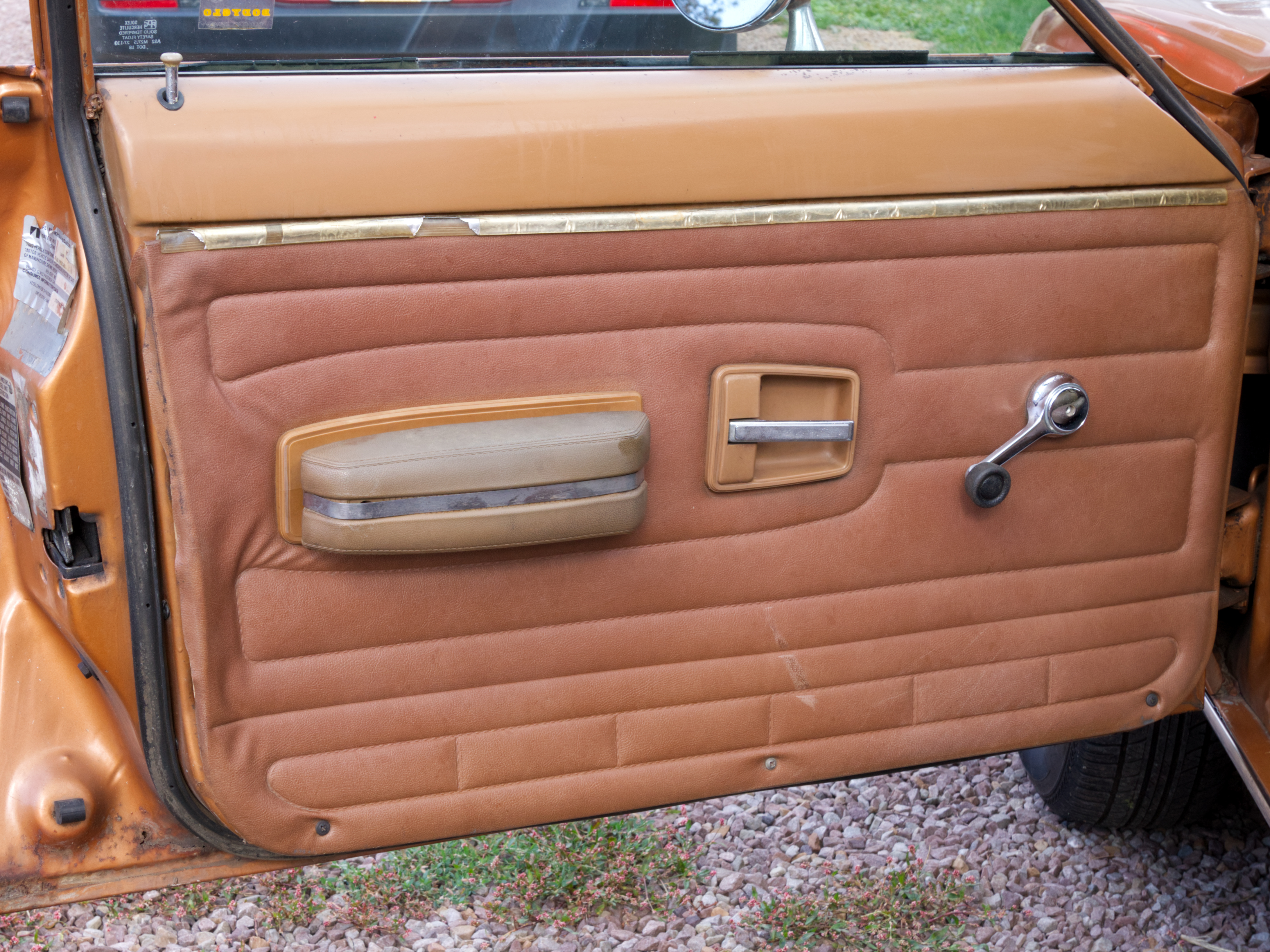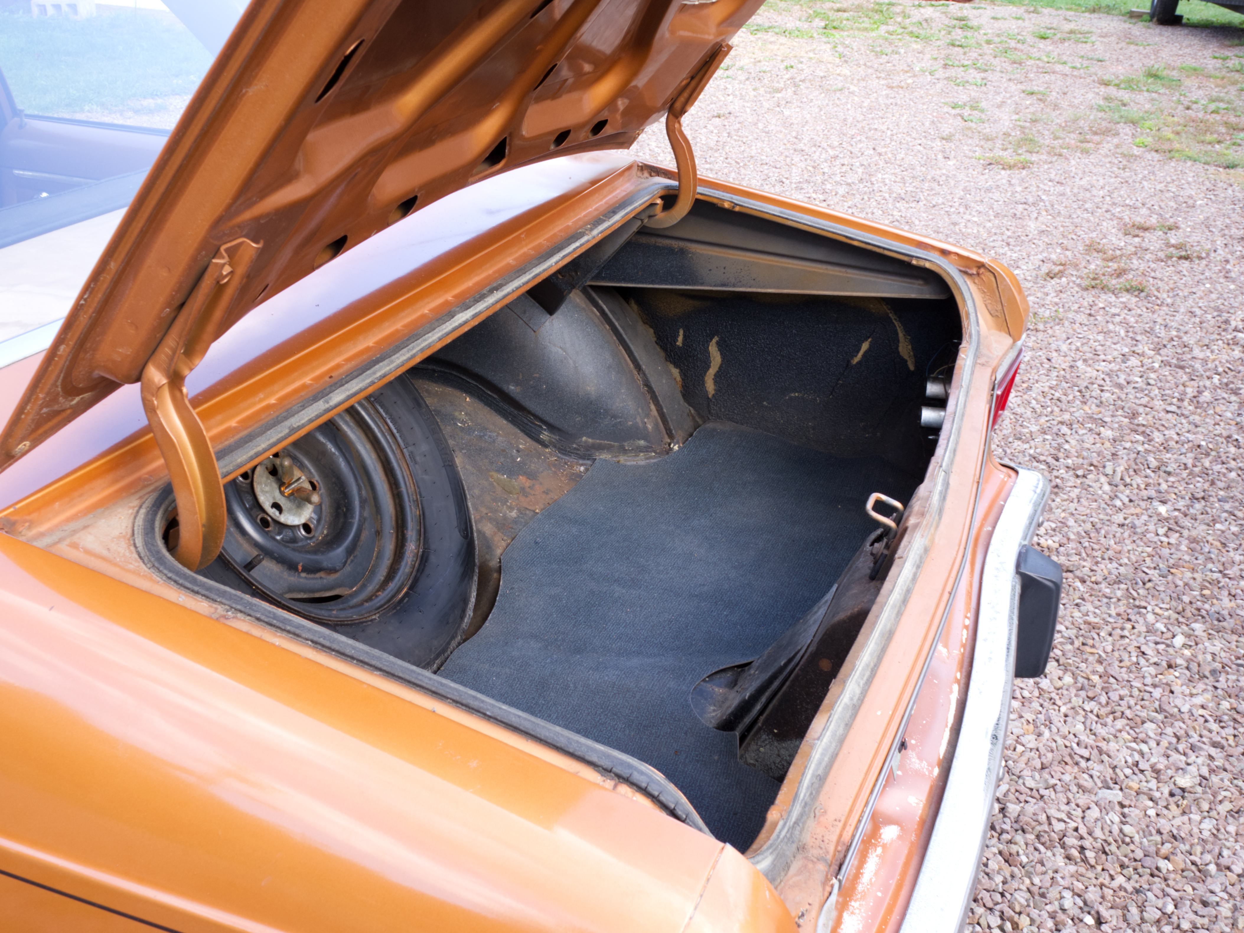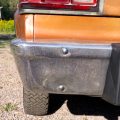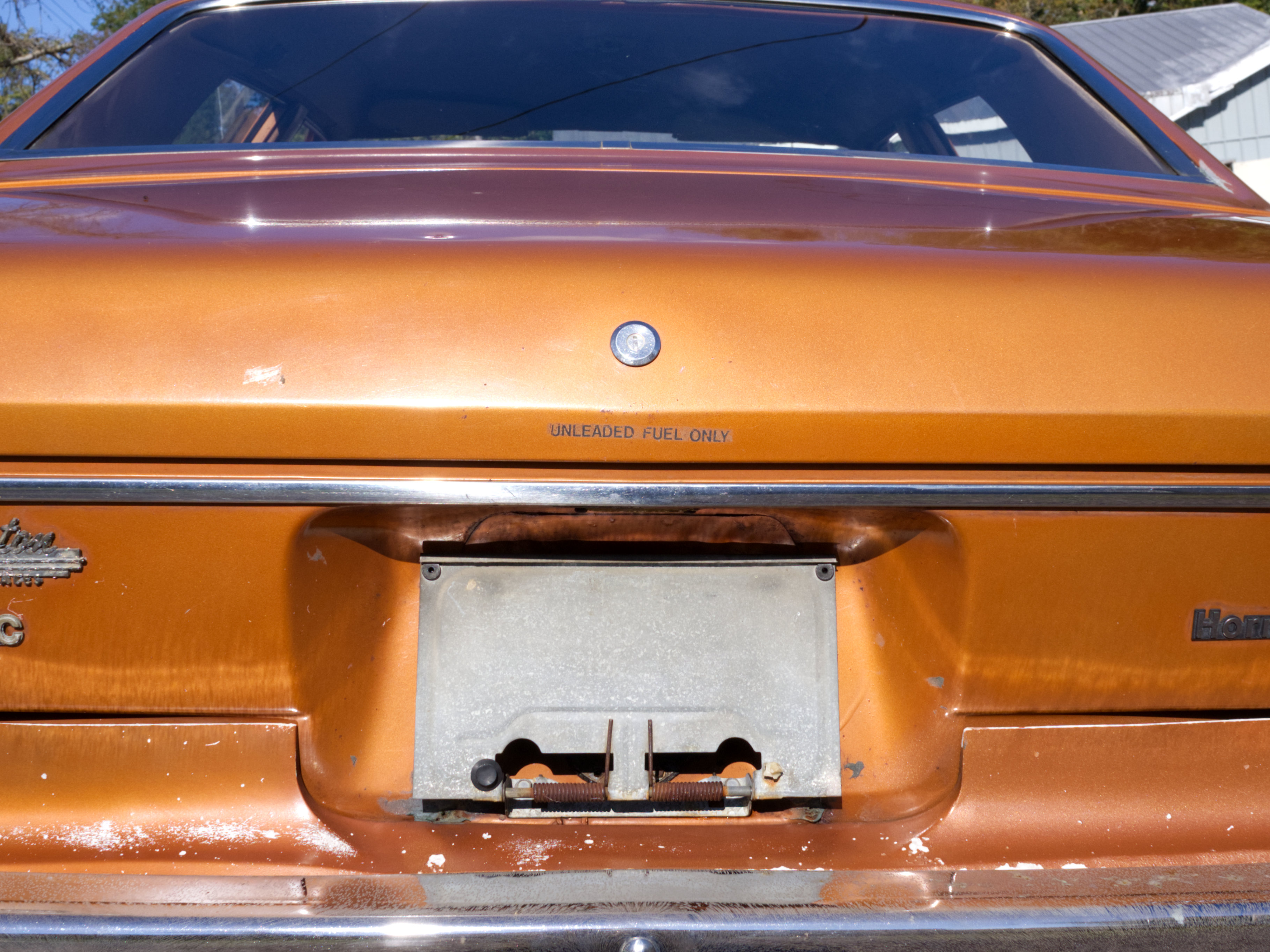 The exterior is finished in Golden Ginger Metallic (paint code 7M) and is described as largely original. Approximately 80% of the paint is said to be factory-original, with the right front fender having been replaced and refinished. The body shows dents, blemishes, and other imperfections consistent with age and use. The seller highlights the presence of an “unleaded fuel only” decal on the trunk lid as an indicator of original paint. Additional exterior wear includes cracked window wipes and weatherstripping.