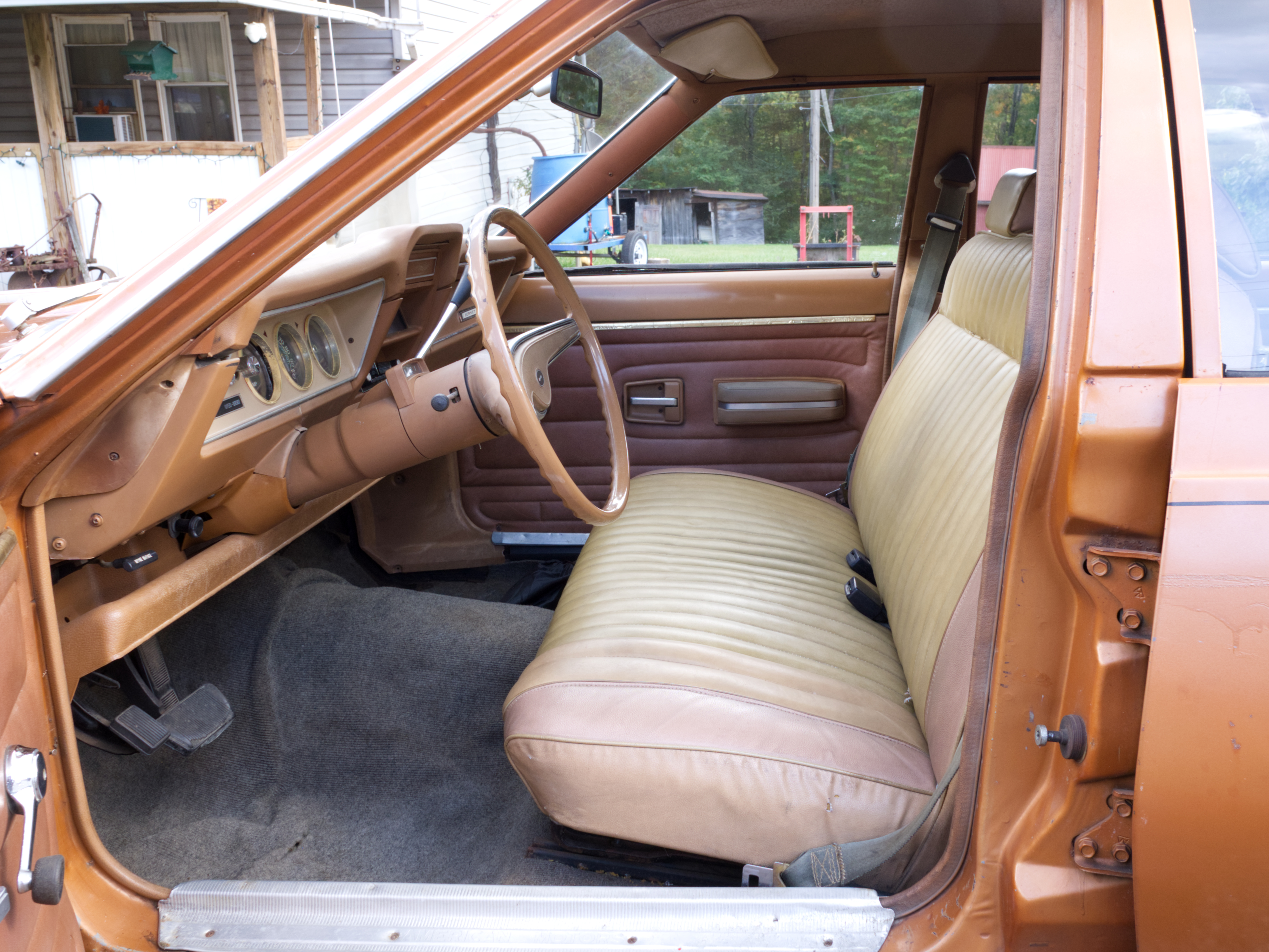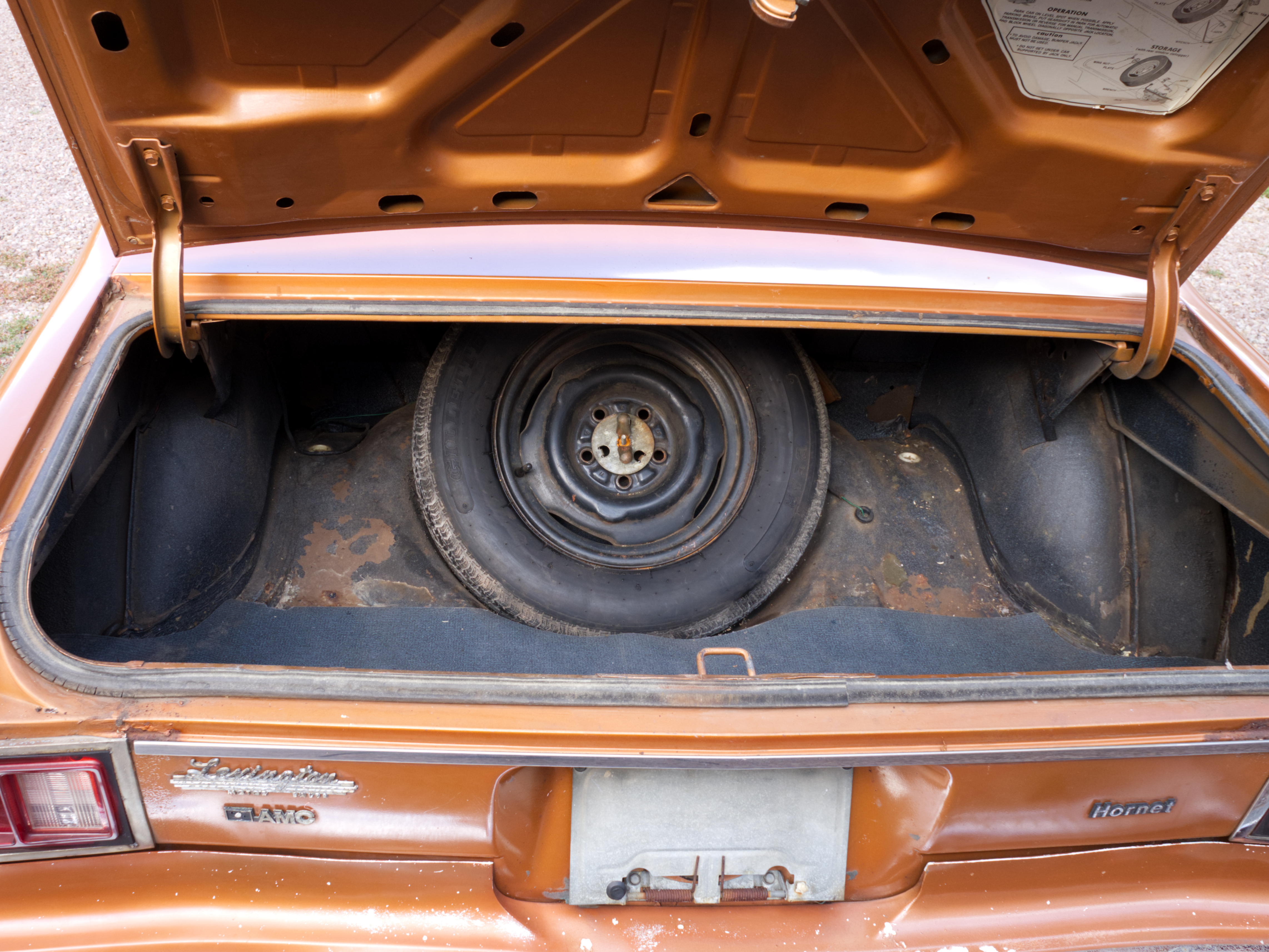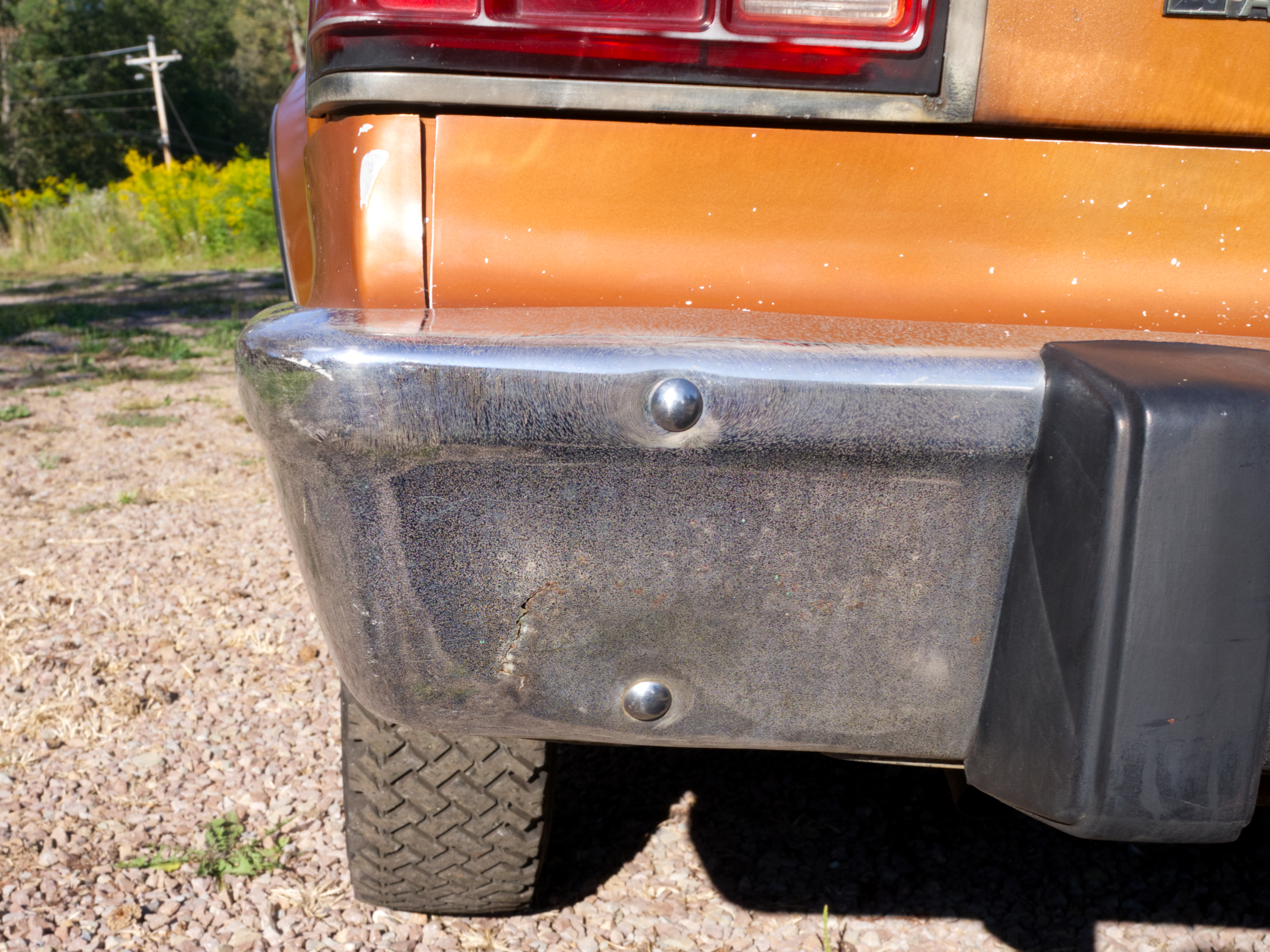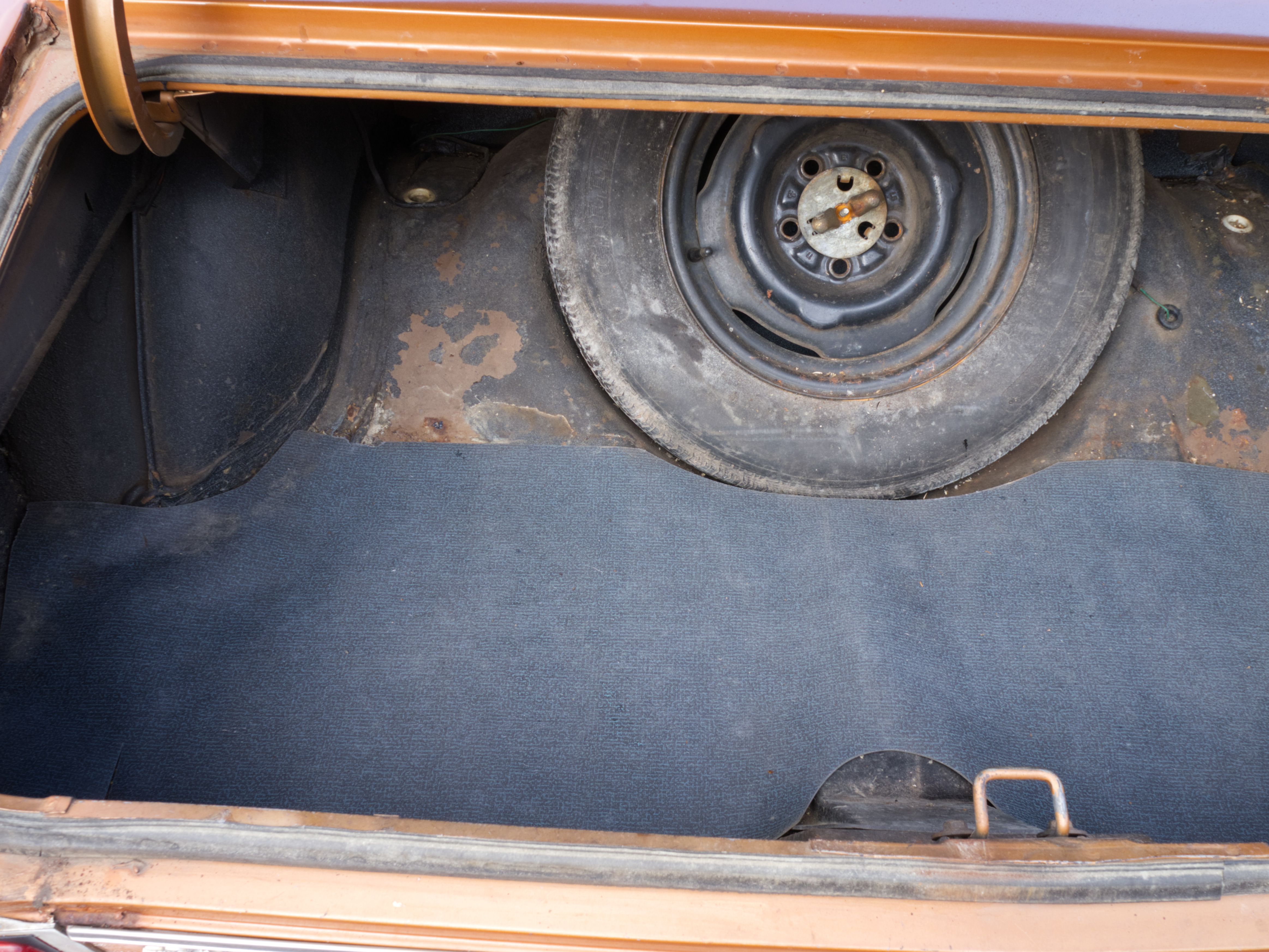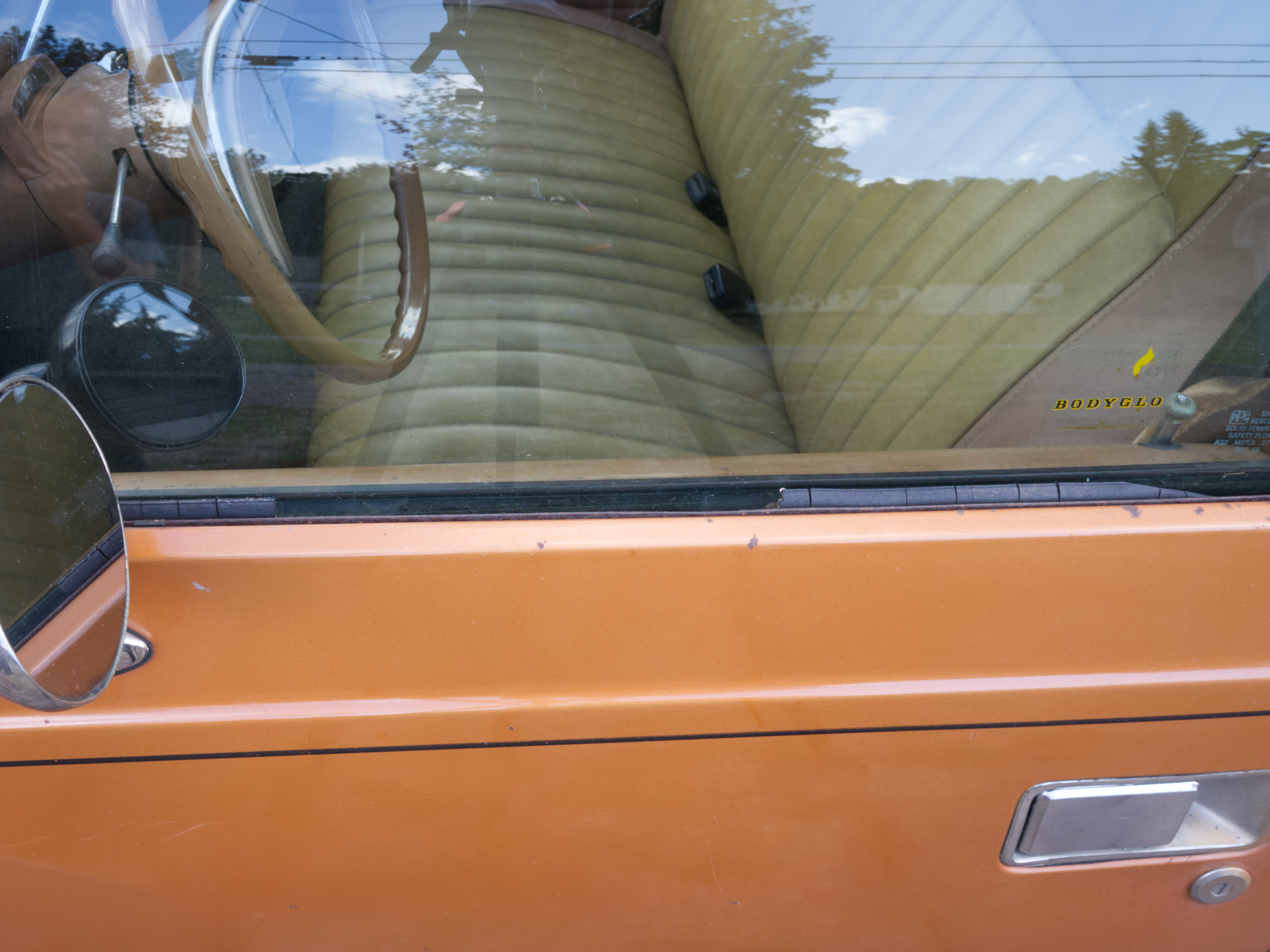 The exterior is finished in Golden Ginger Metallic (paint code 7M) and is described as largely original. Approximately 80% of the paint is said to be factory-original, with the right front fender having been replaced and refinished. The body shows dents, blemishes, and other imperfections consistent with age and use. The seller highlights the presence of an “unleaded fuel only” decal on the trunk lid as an indicator of original paint. Additional exterior wear includes cracked window wipes and weatherstripping.