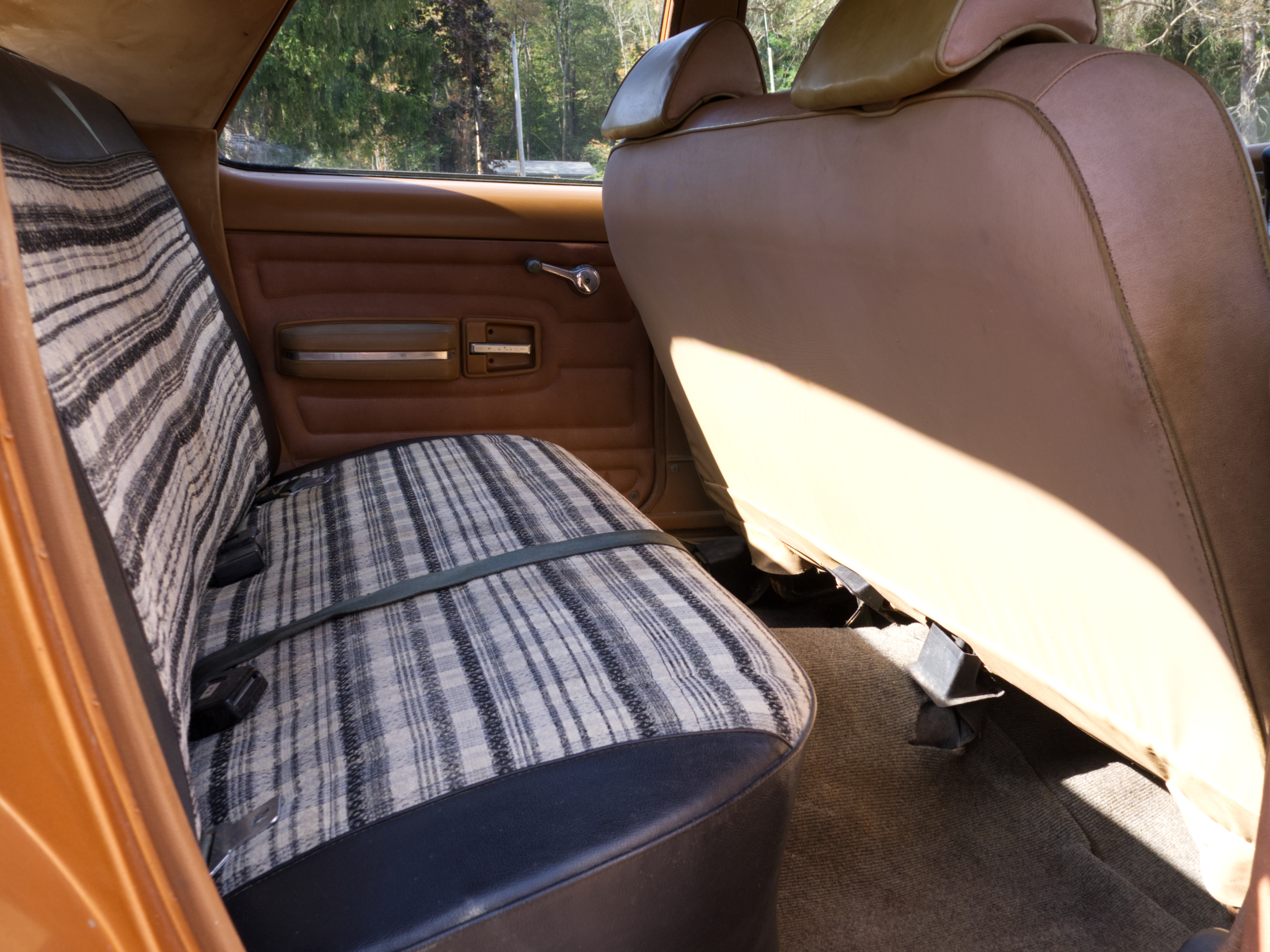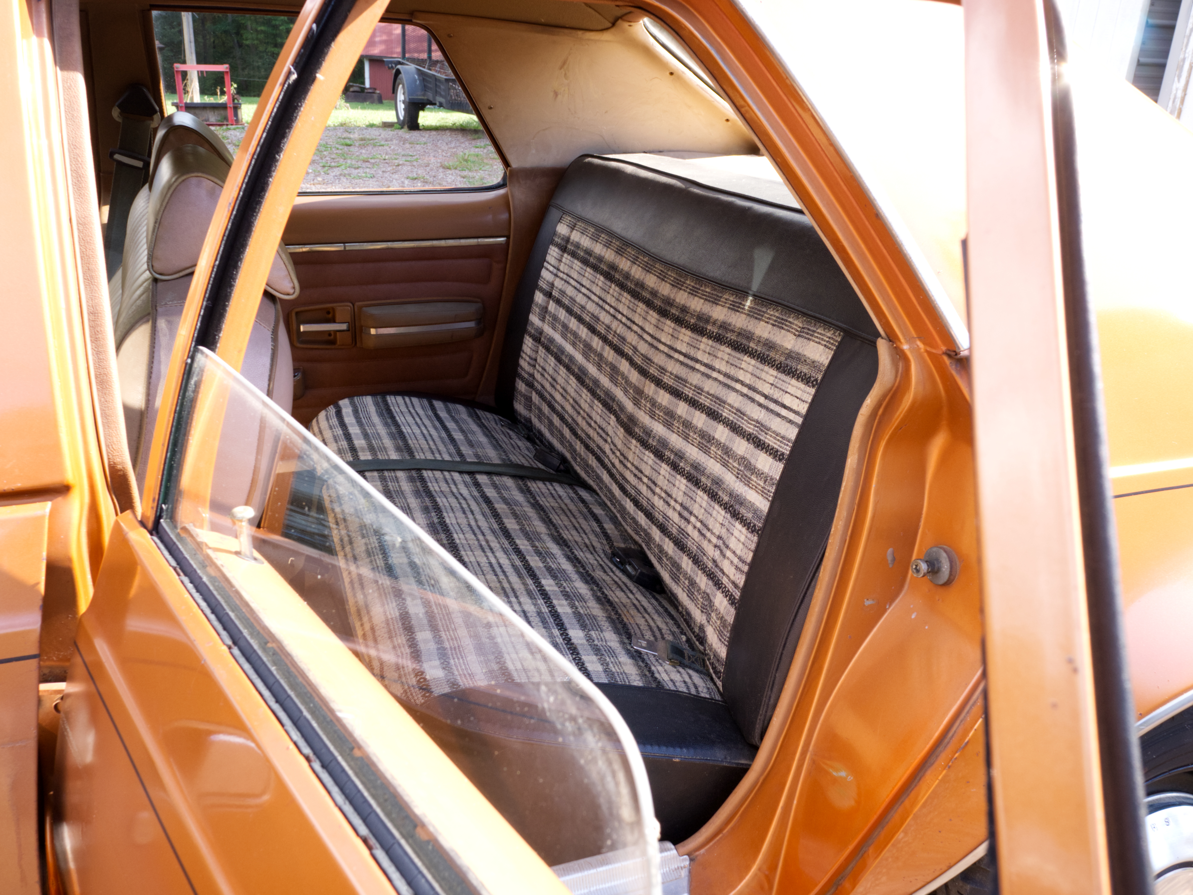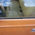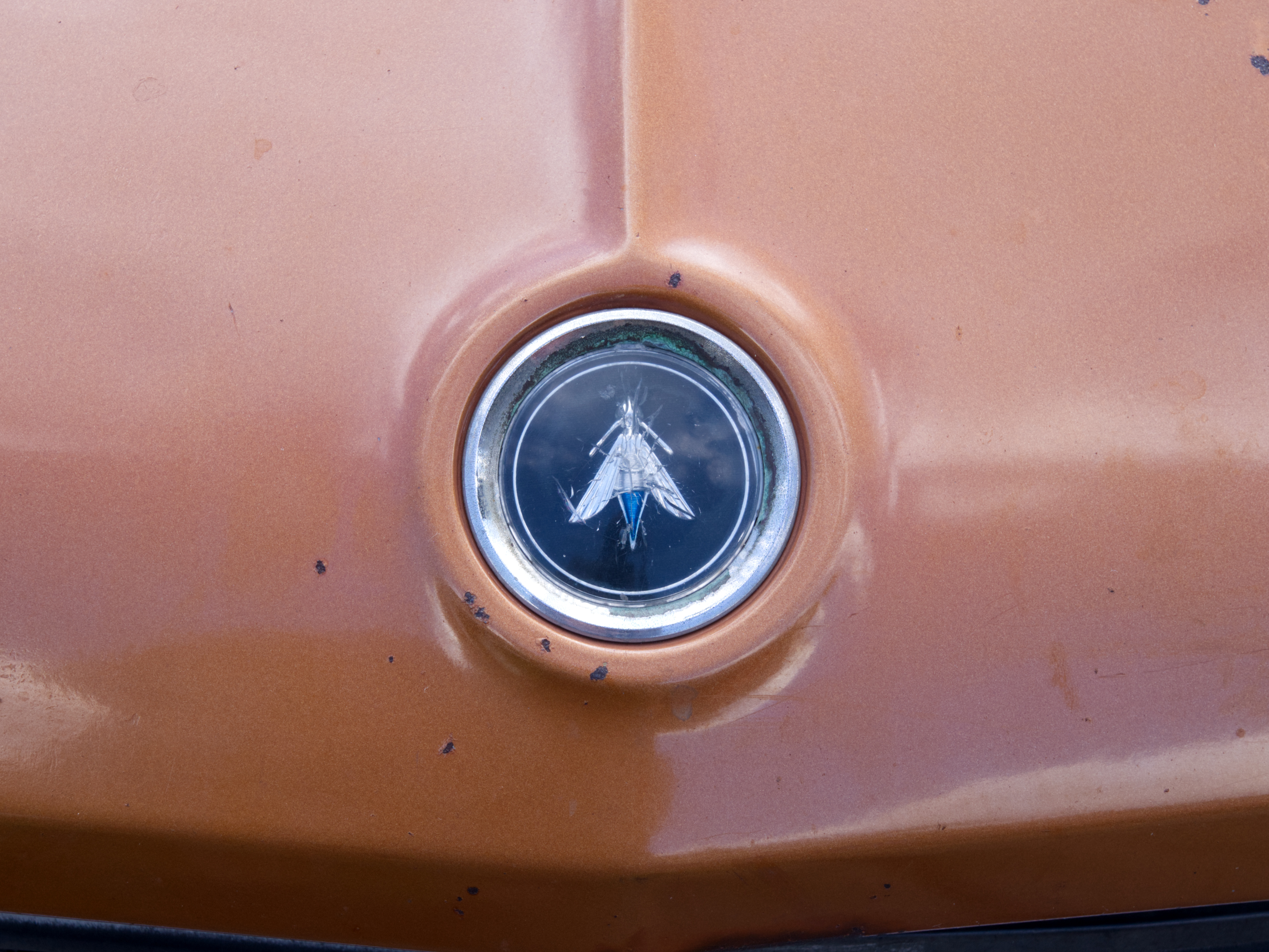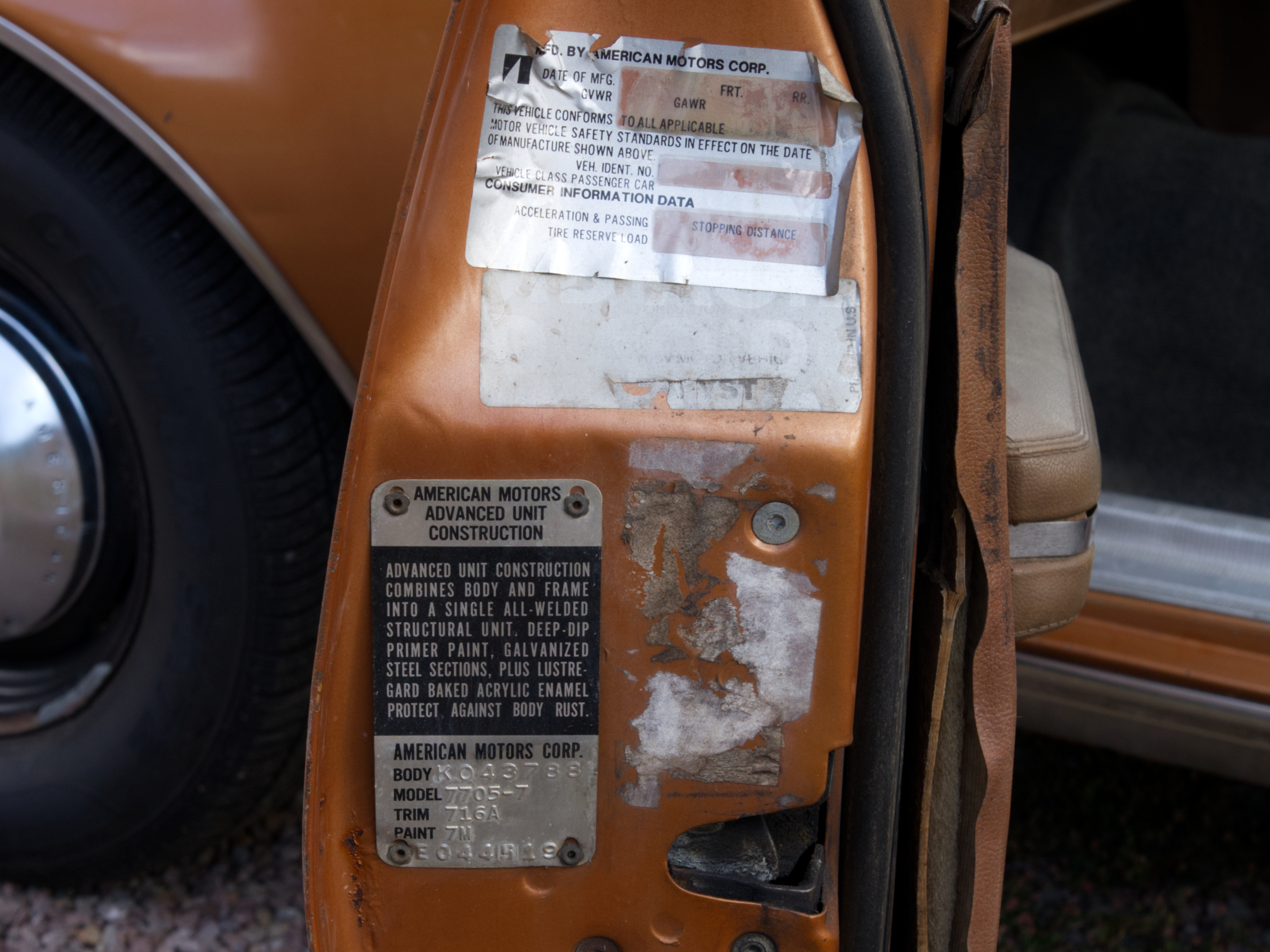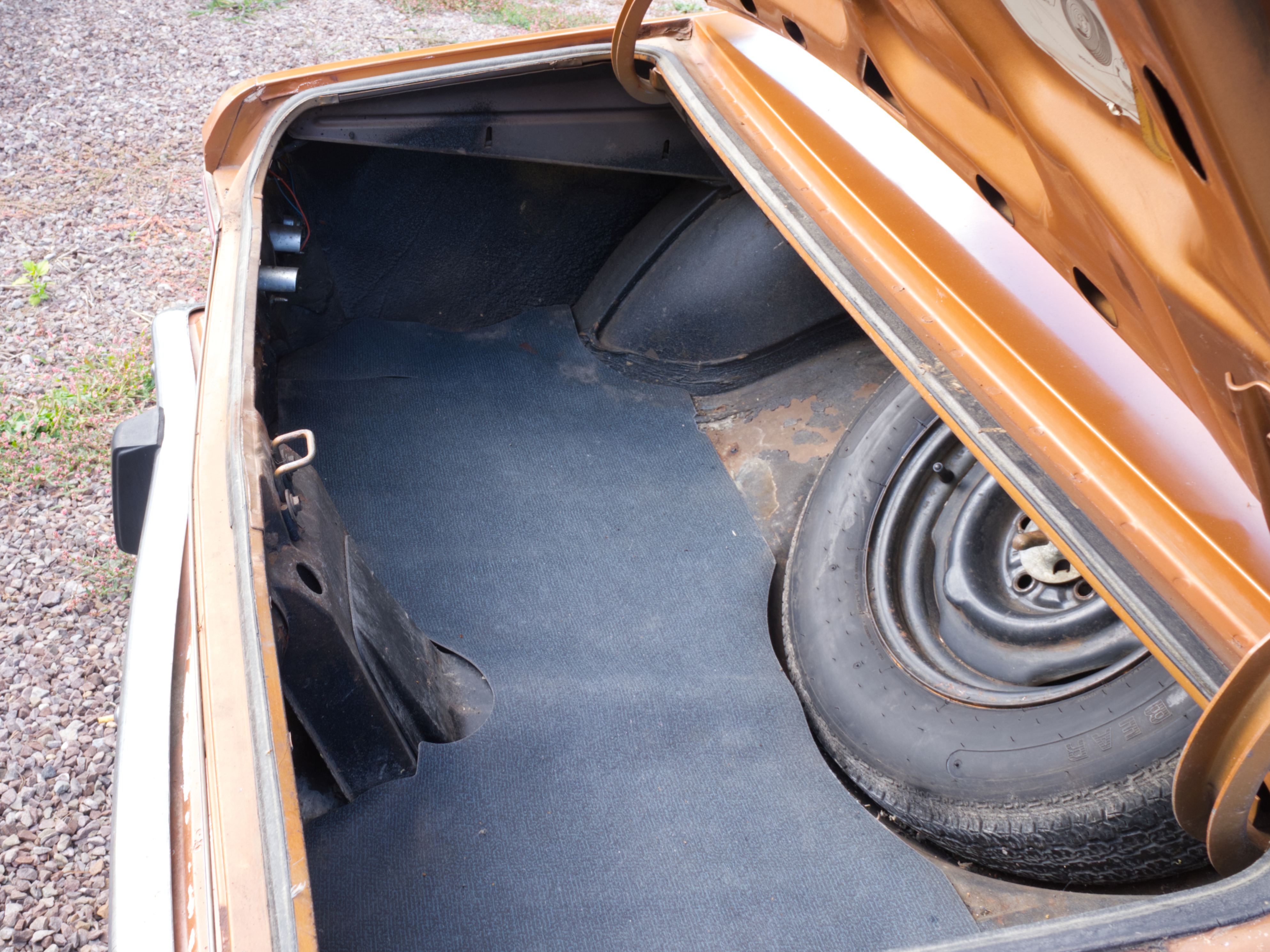 The exterior is finished in Golden Ginger Metallic (paint code 7M) and is described as largely original. Approximately 80% of the paint is said to be factory-original, with the right front fender having been replaced and refinished. The body shows dents, blemishes, and other imperfections consistent with age and use. The seller highlights the presence of an “unleaded fuel only” decal on the trunk lid as an indicator of original paint. Additional exterior wear includes cracked window wipes and weatherstripping.