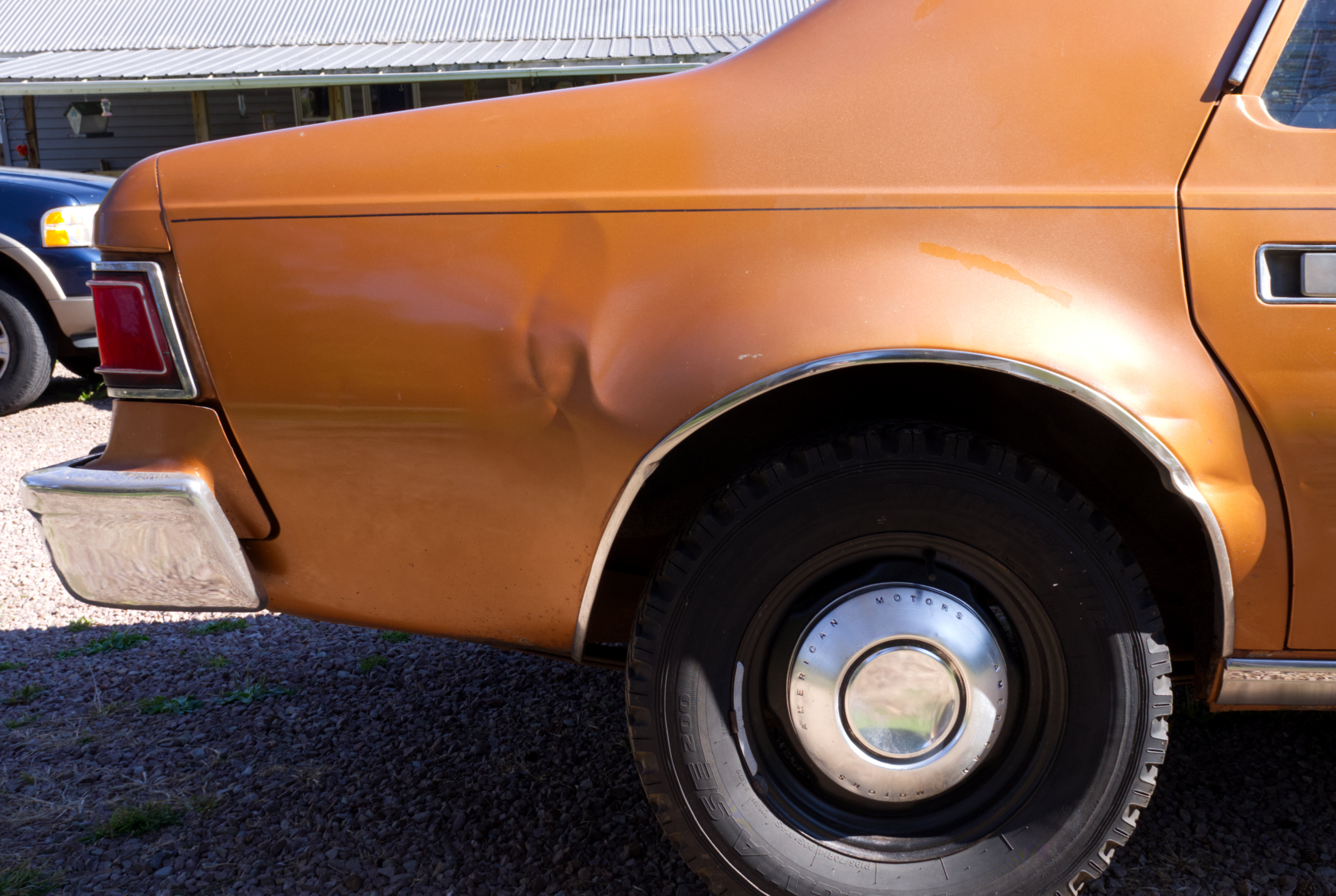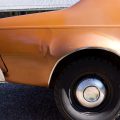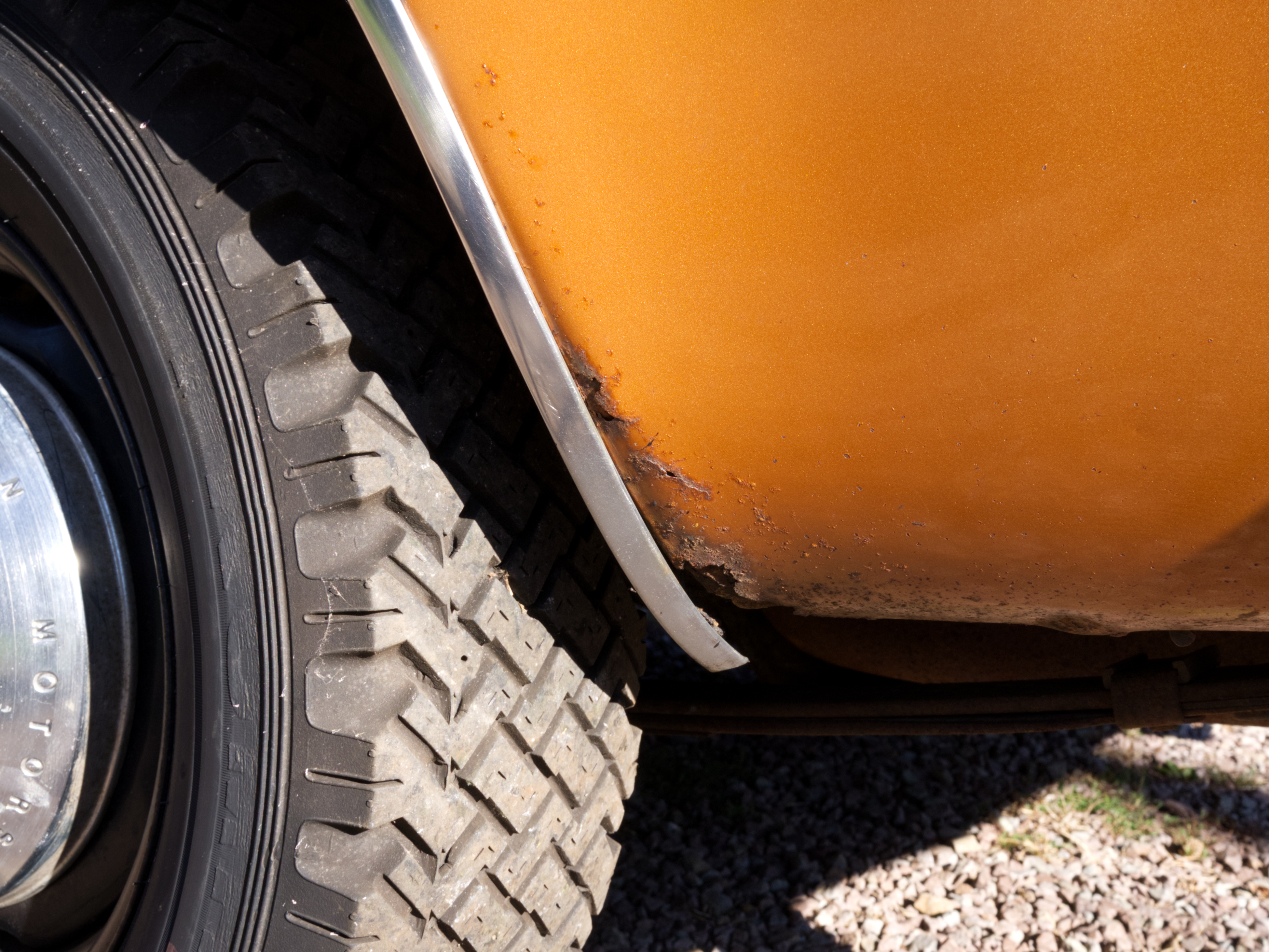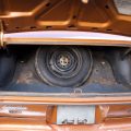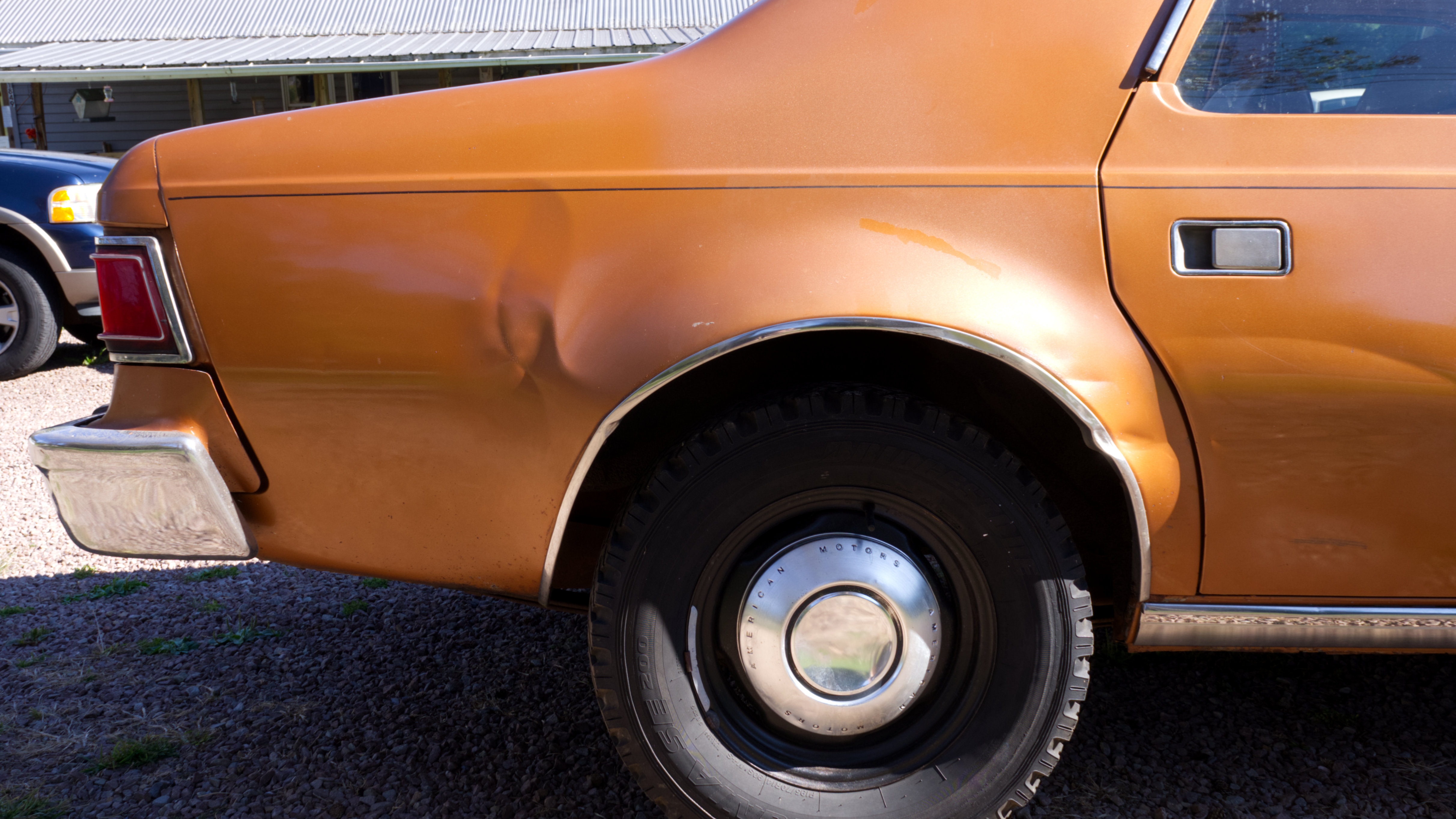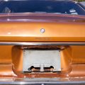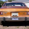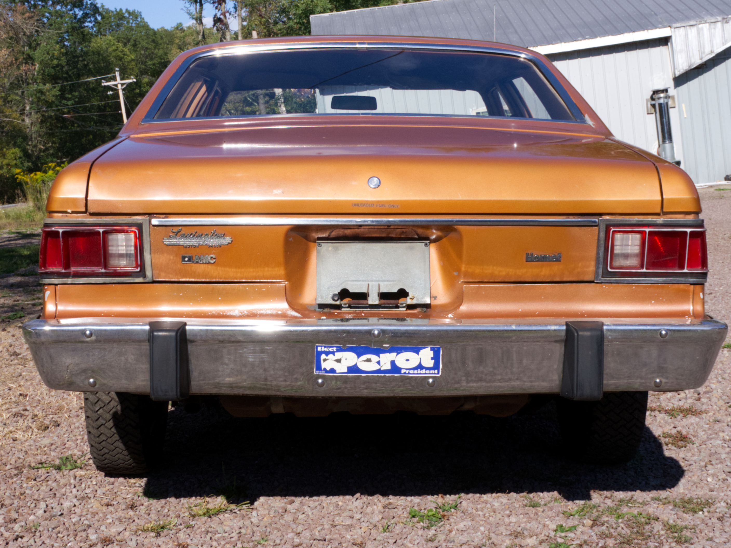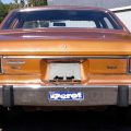 The exterior is finished in Golden Ginger Metallic (paint code 7M) and is described as largely original. Approximately 80% of the paint is said to be factory-original, with the right front fender having been replaced and refinished. The body shows dents, blemishes, and other imperfections consistent with age and use. The seller highlights the presence of an “unleaded fuel only” decal on the trunk lid as an indicator of original paint. Additional exterior wear includes cracked window wipes and weatherstripping.
