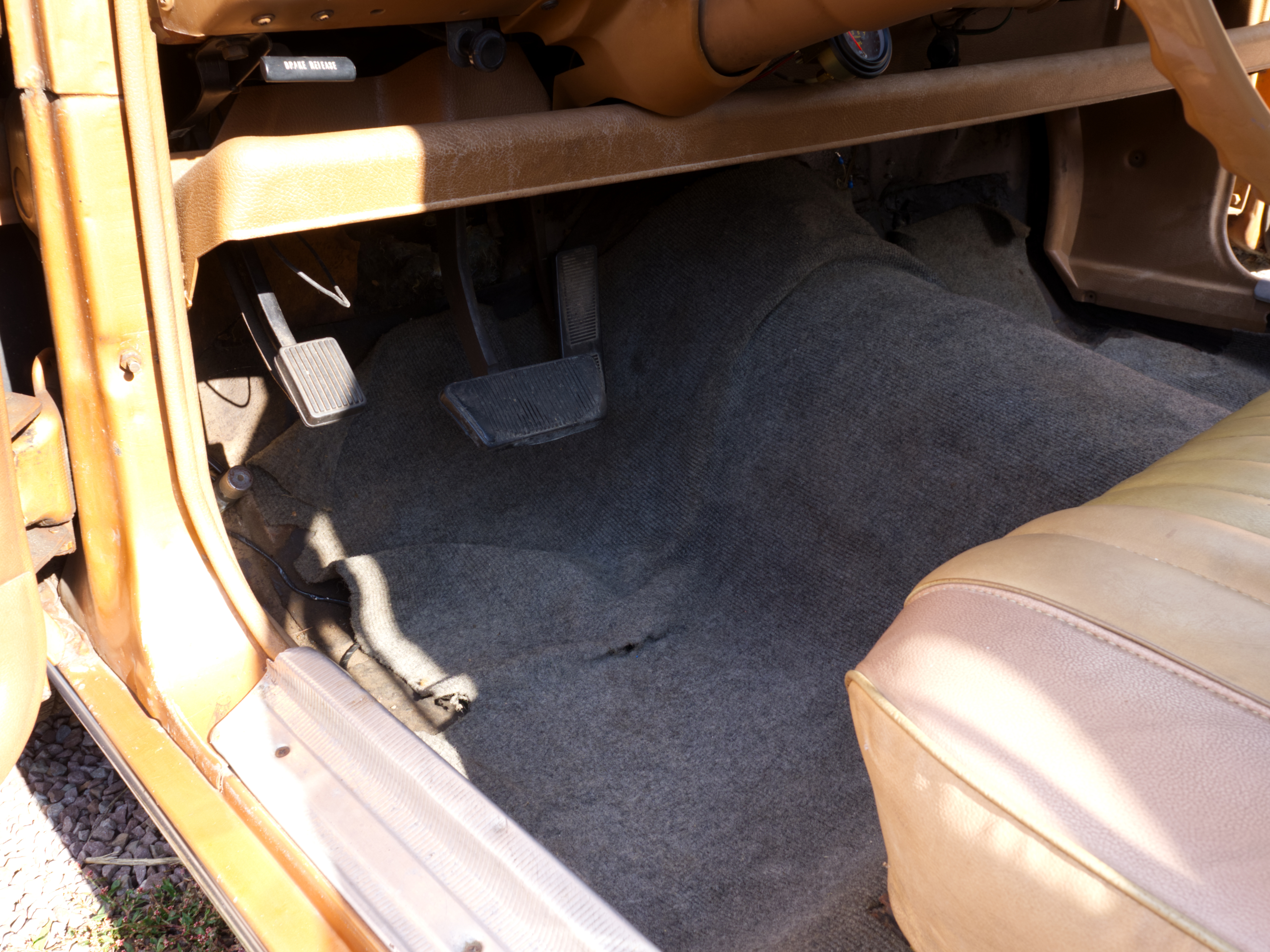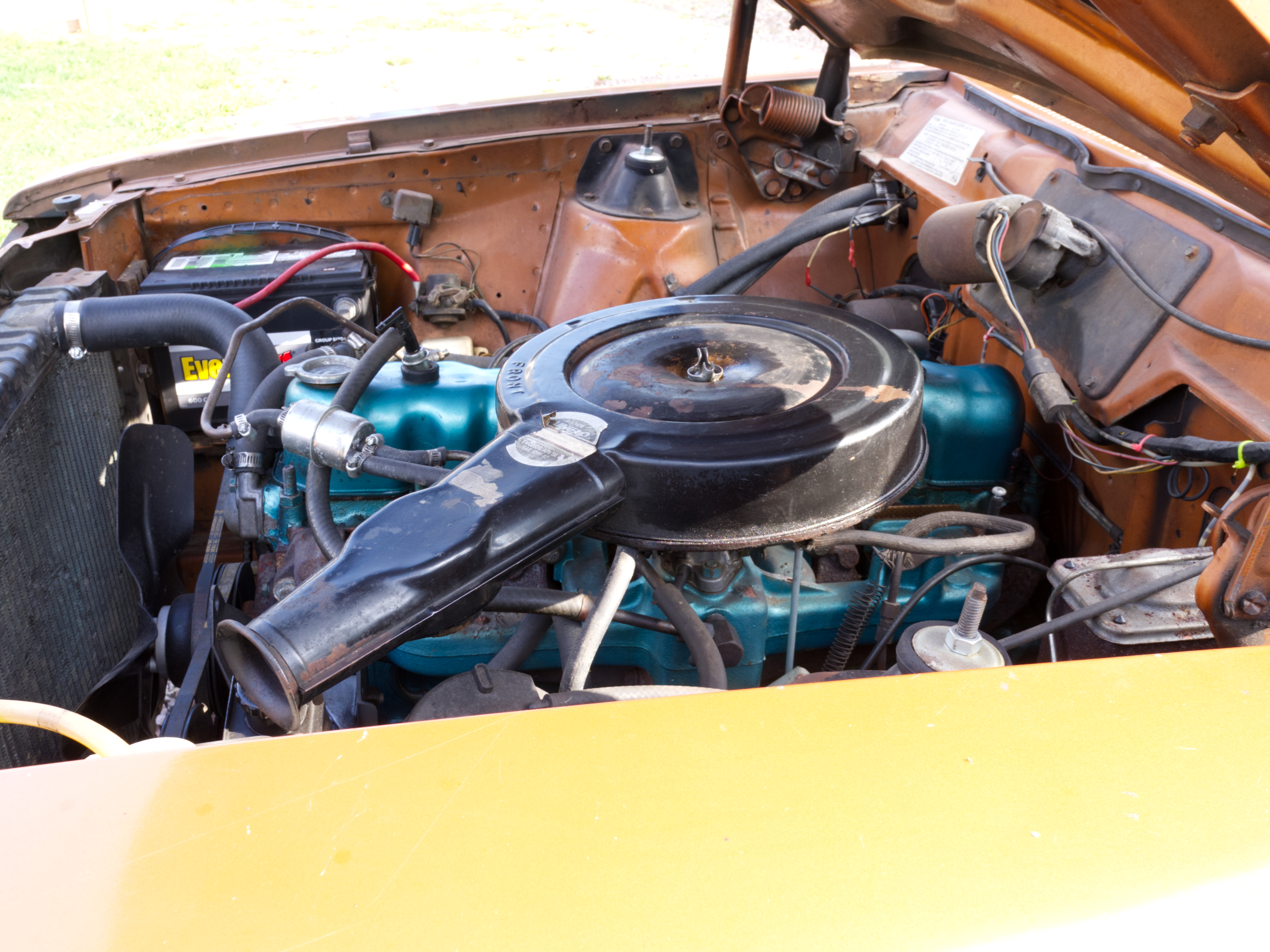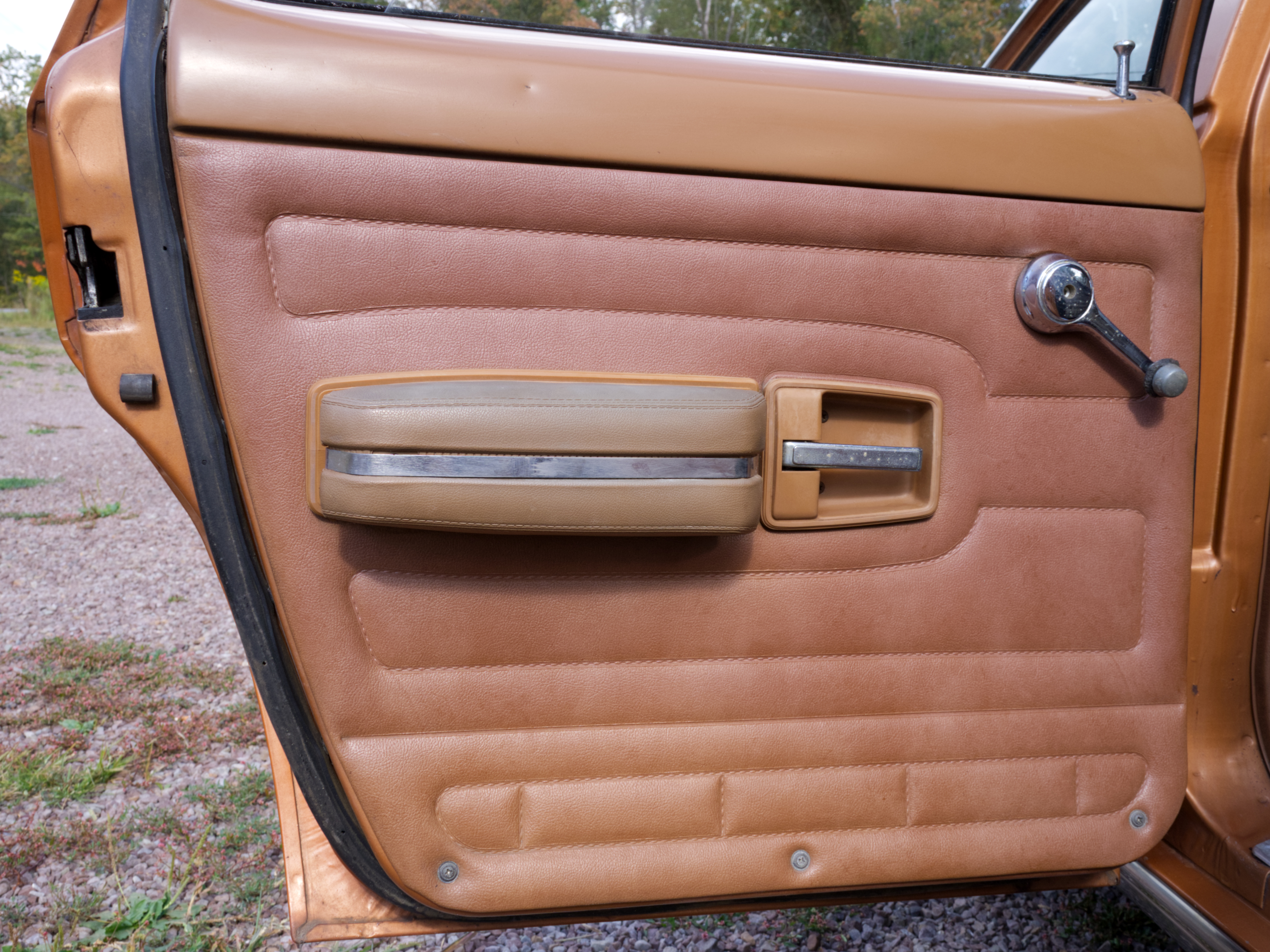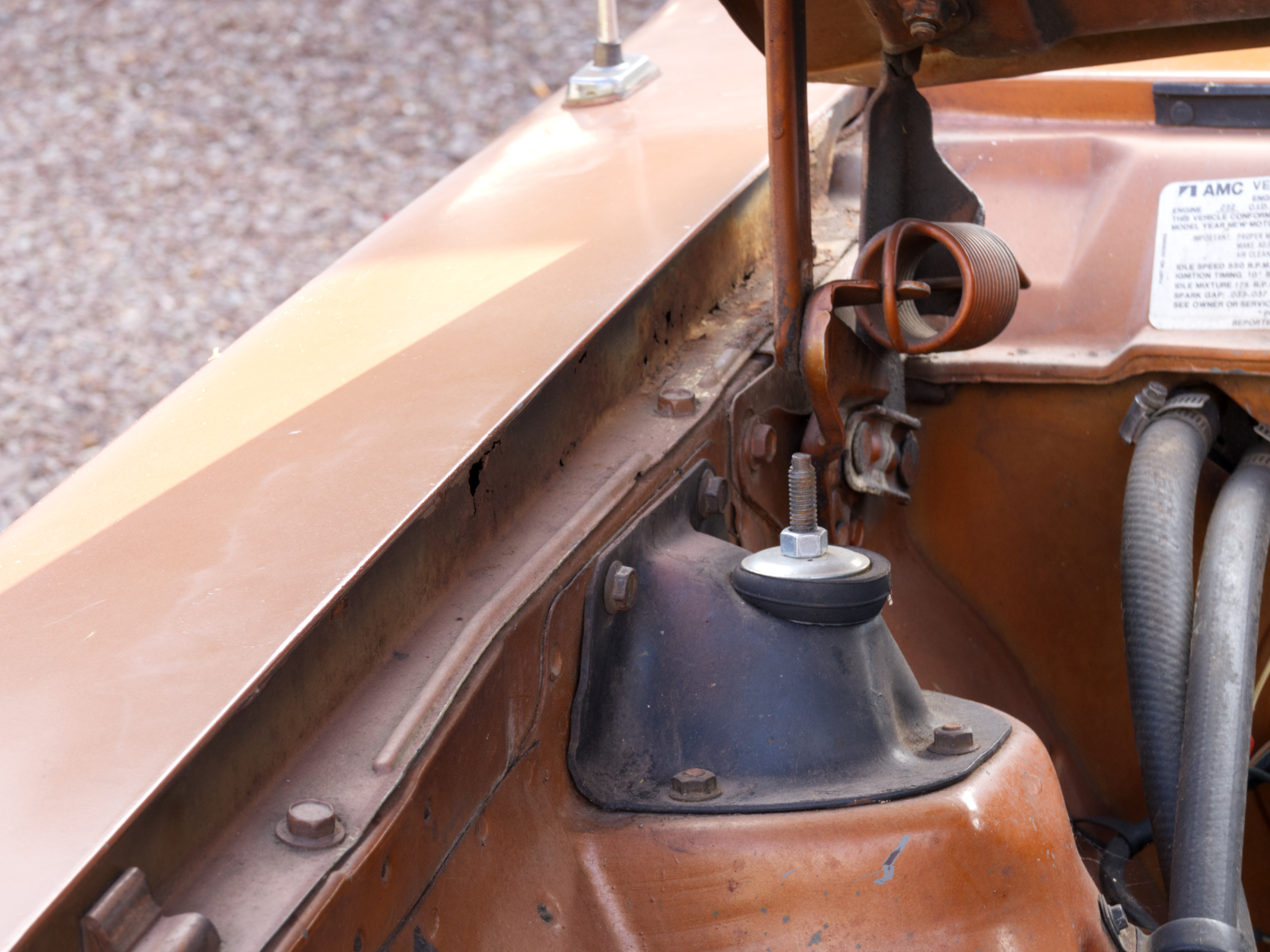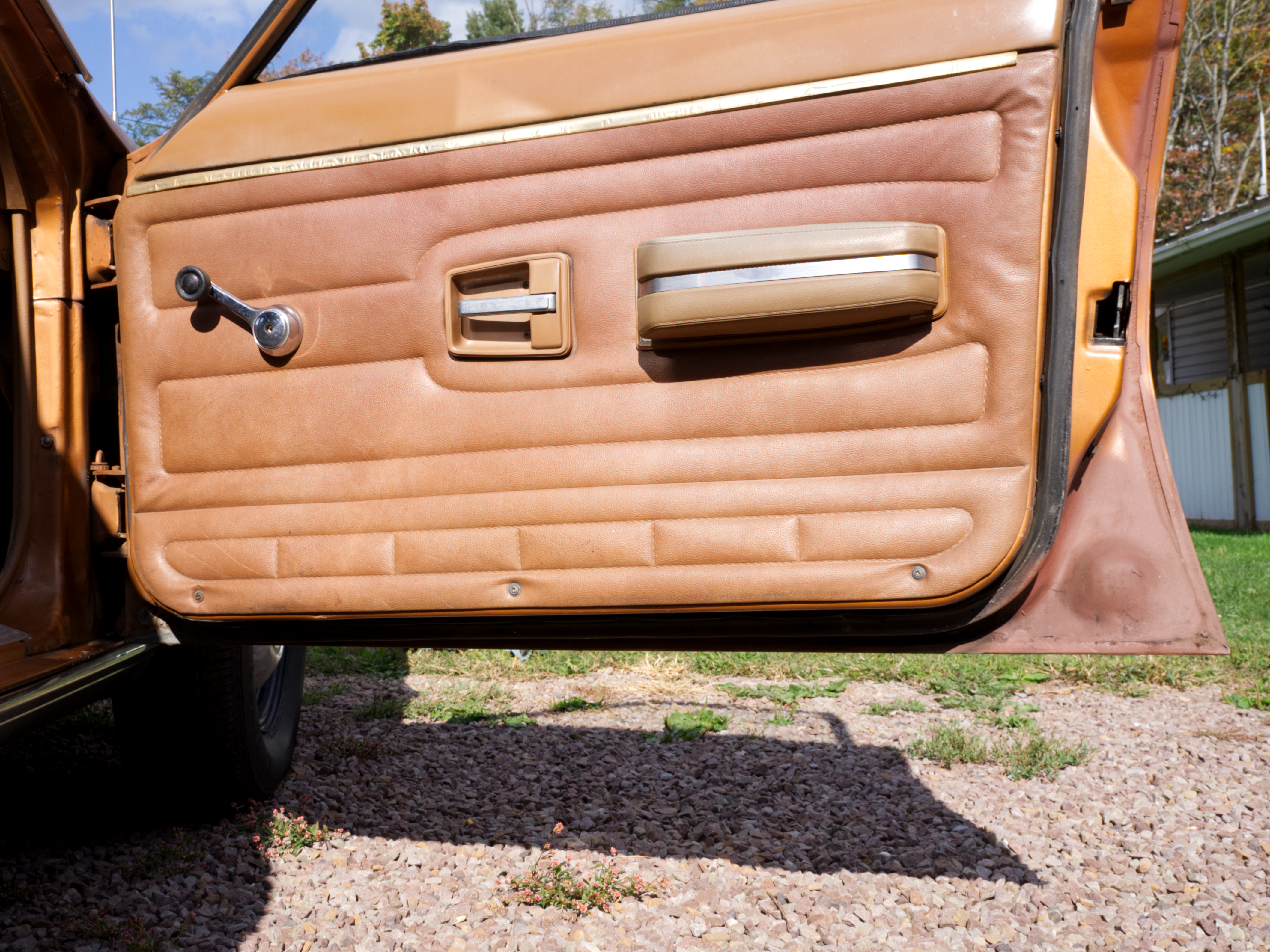 The exterior is finished in Golden Ginger Metallic (paint code 7M) and is described as largely original. Approximately 80% of the paint is said to be factory-original, with the right front fender having been replaced and refinished. The body shows dents, blemishes, and other imperfections consistent with age and use. The seller highlights the presence of an “unleaded fuel only” decal on the trunk lid as an indicator of original paint. Additional exterior wear includes cracked window wipes and weatherstripping.