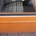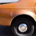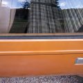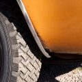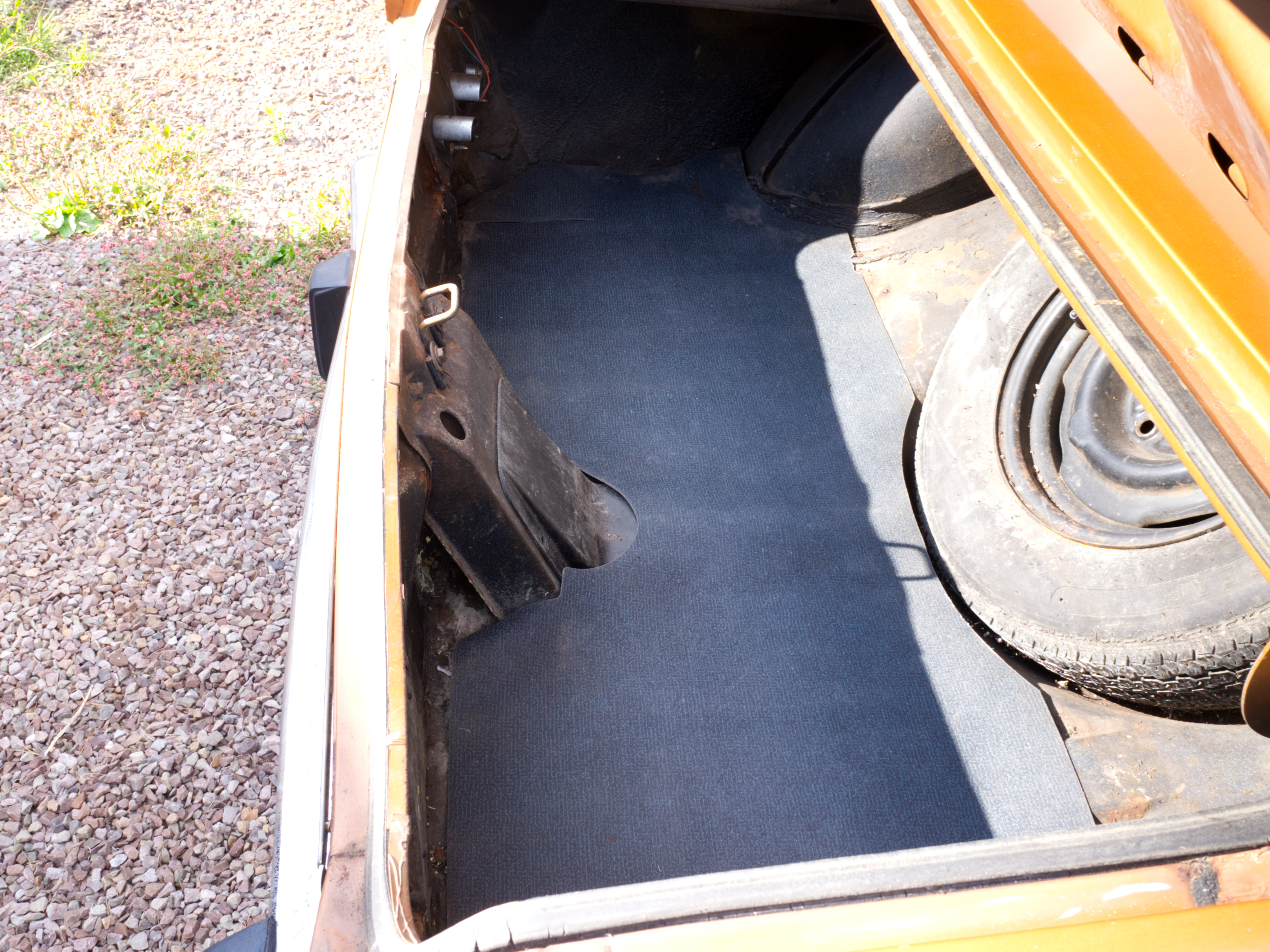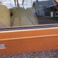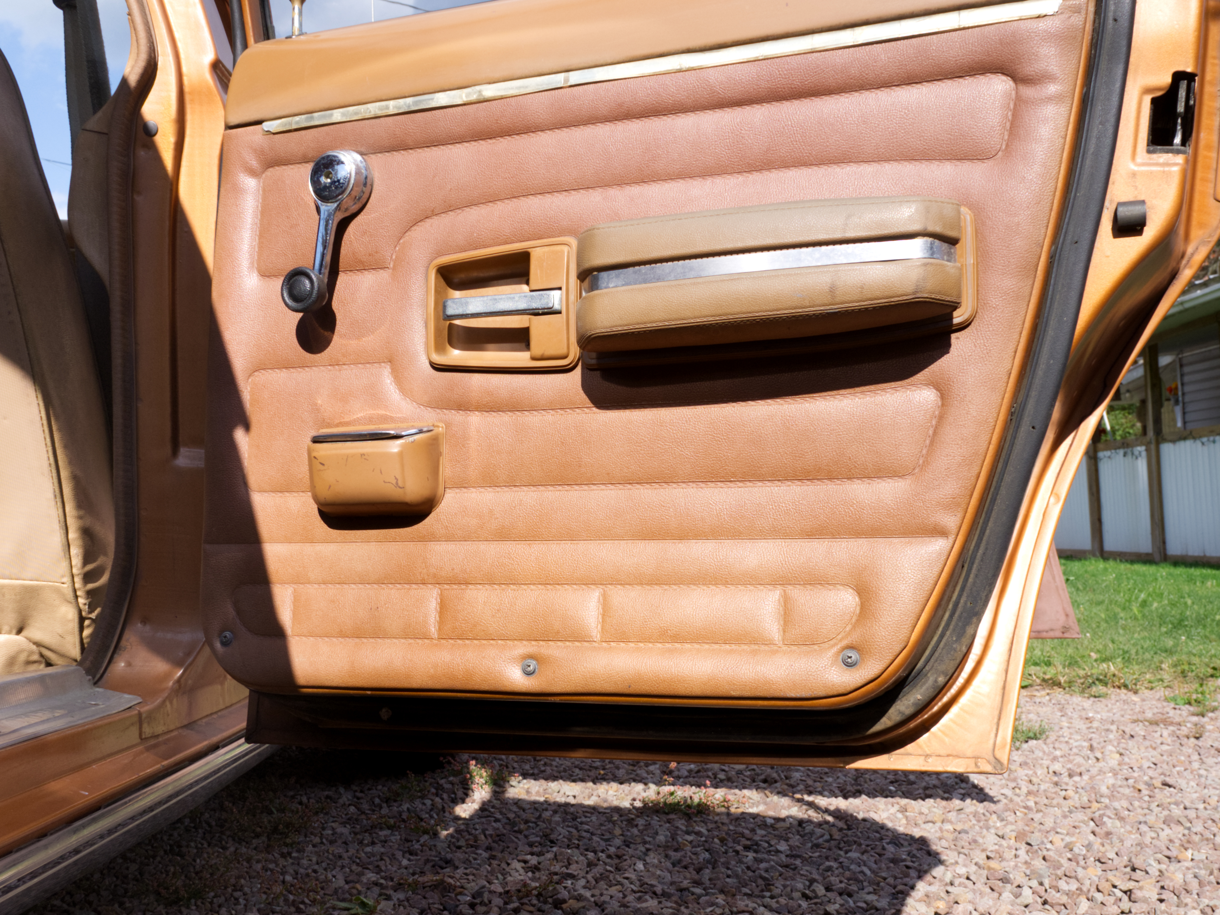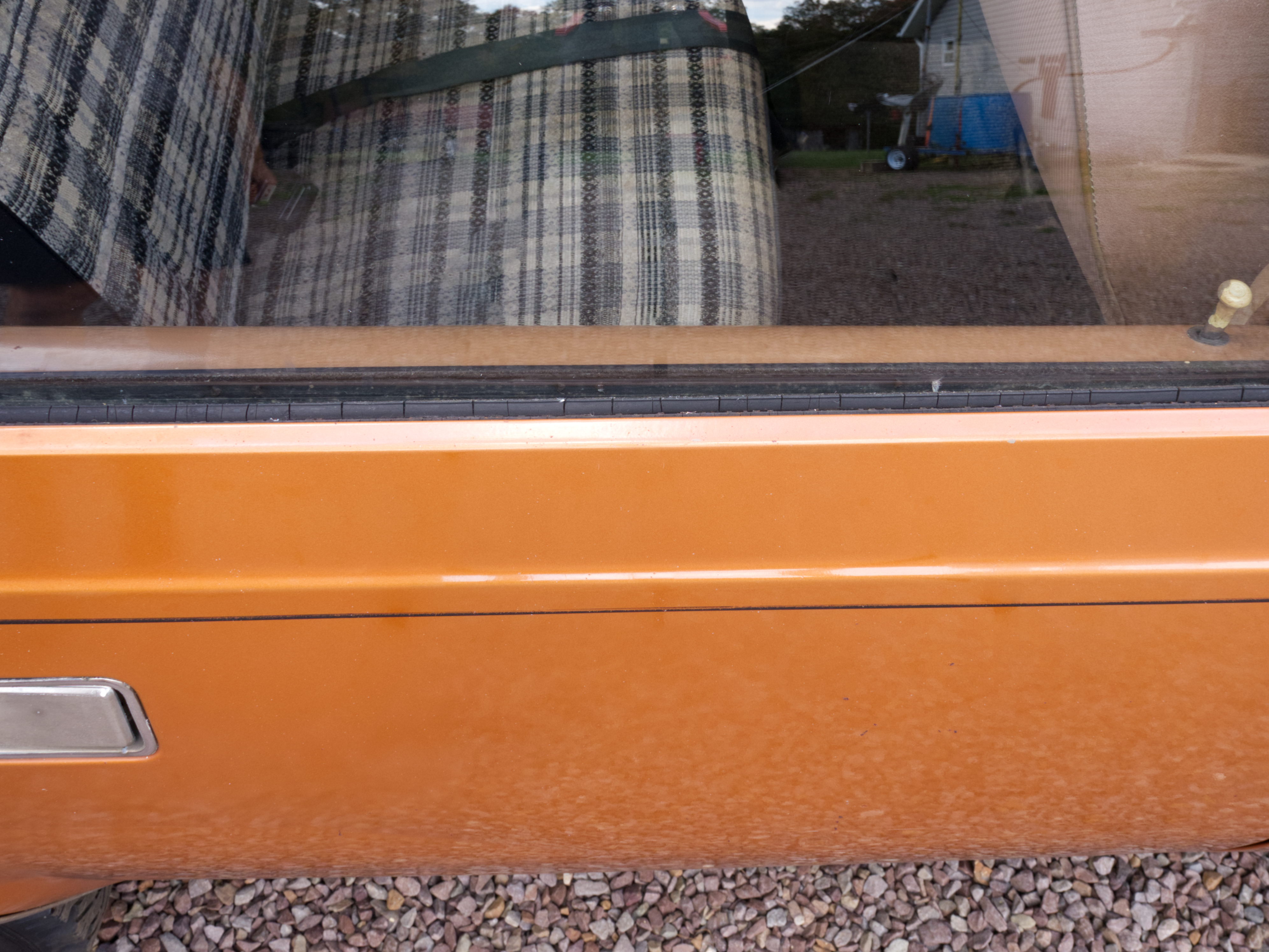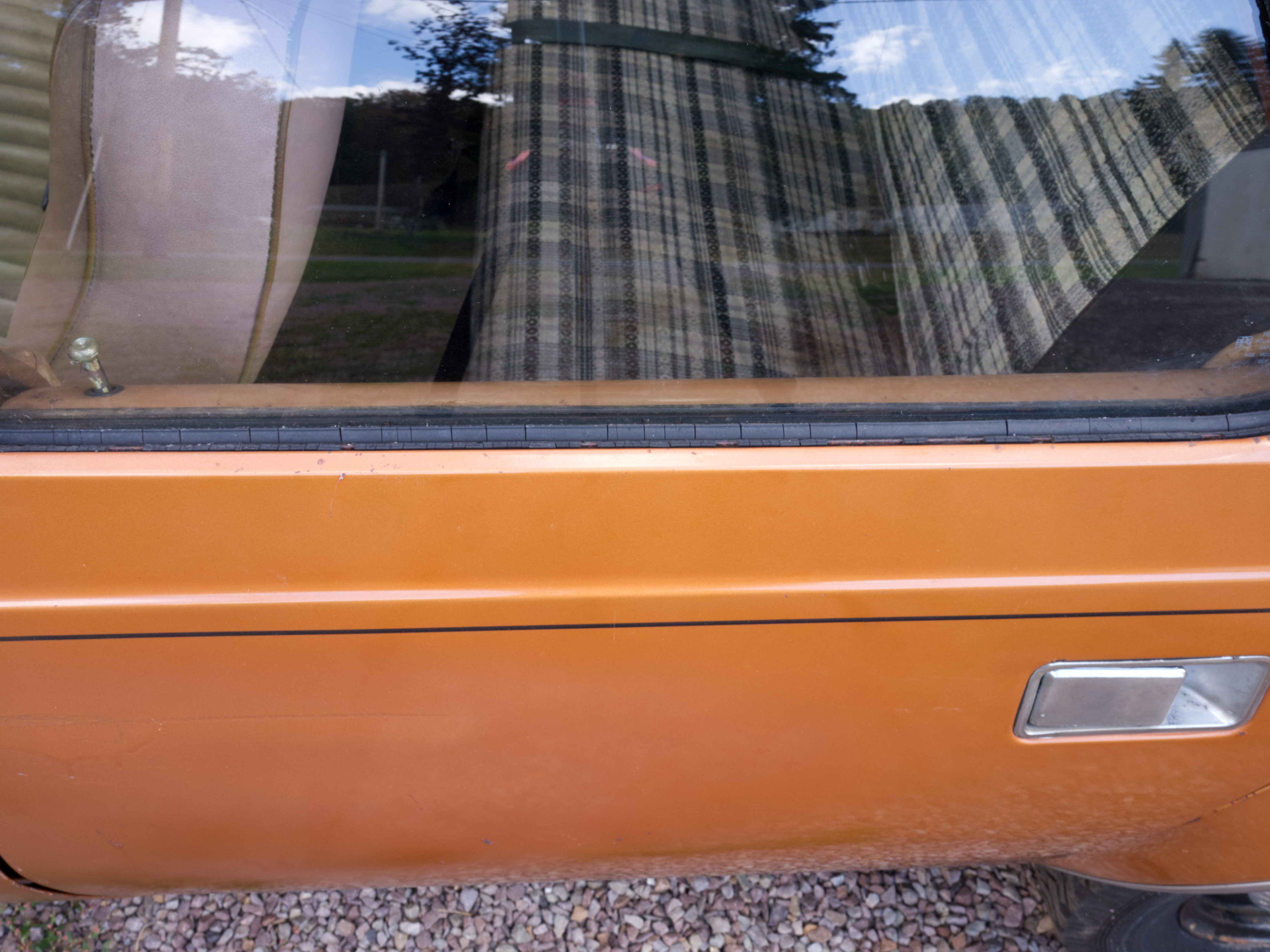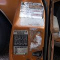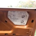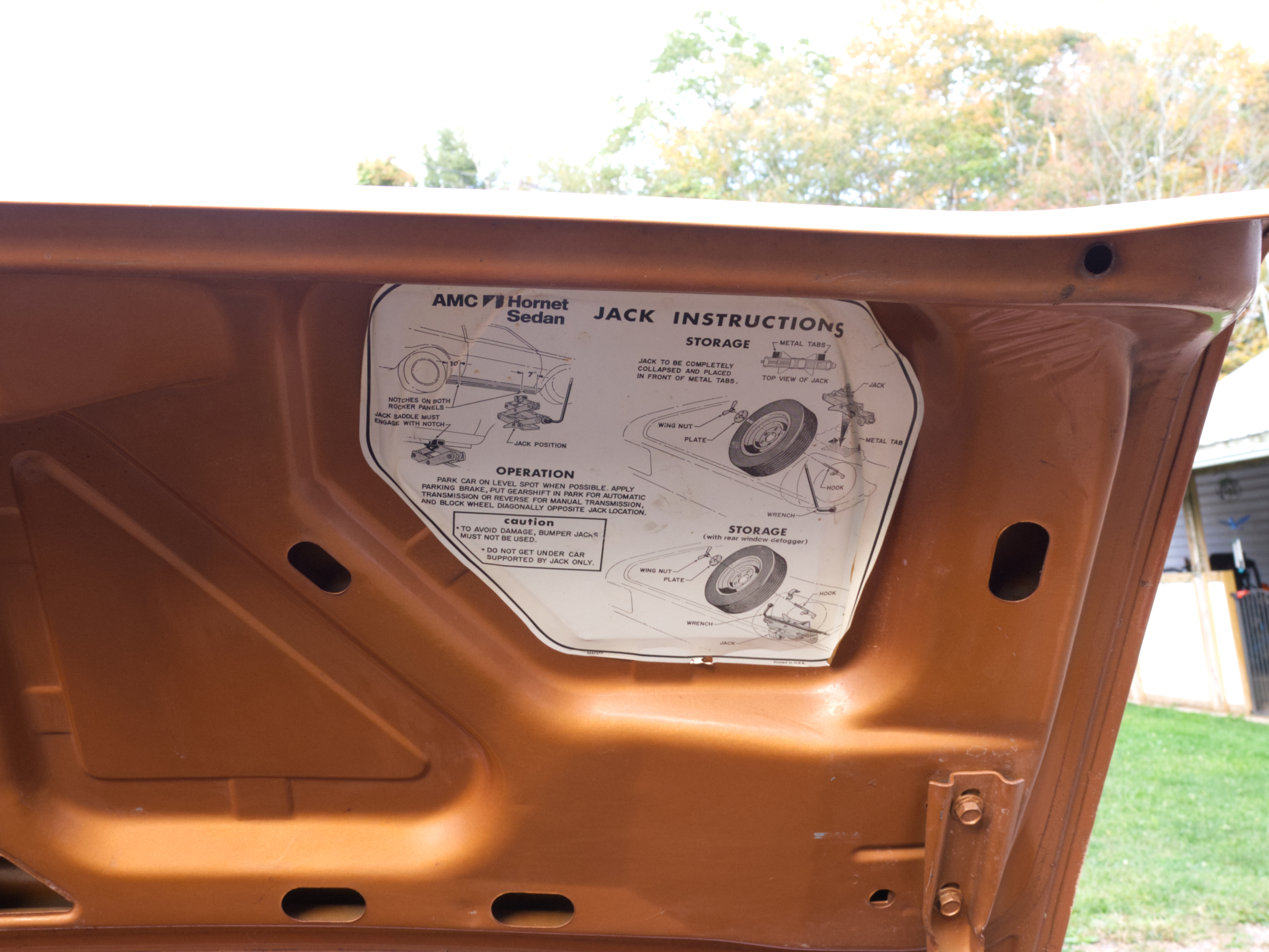 The exterior is finished in Golden Ginger Metallic (paint code 7M) and is described as largely original. Approximately 80% of the paint is said to be factory-original, with the right front fender having been replaced and refinished. The body shows dents, blemishes, and other imperfections consistent with age and use. The seller highlights the presence of an “unleaded fuel only” decal on the trunk lid as an indicator of original paint. Additional exterior wear includes cracked window wipes and weatherstripping.