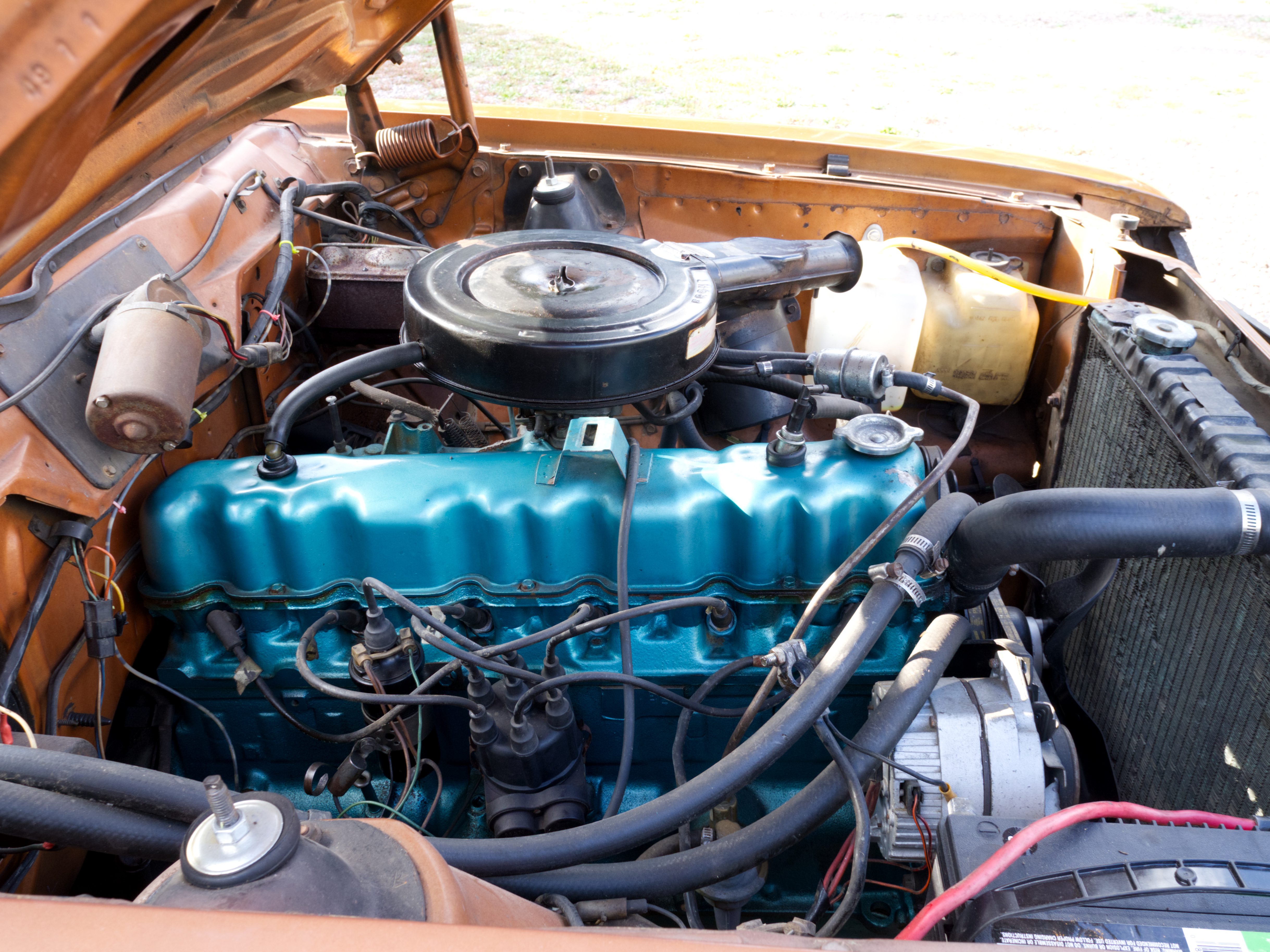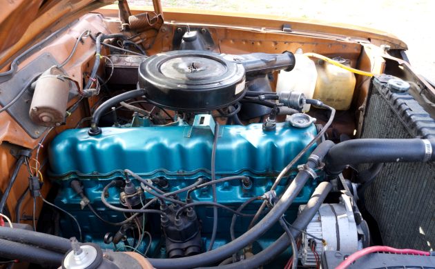 The 232ci inline-six was factory rated at approximately 110 horsepower and is equipped with a carburetor. The seller states that the car was recently recommissioned by draining and refilling the fuel system, after which it started easily following carburetor priming and idled independently within a short period. A brief test drive reportedly confirmed proper transmission operation. A video is provided showing the engine running, and the seller notes an idle noise that has reportedly been present for some time. Power is sent to the rear wheels through a TorqueFlite 904 automatic transmission. The car is equipped with front disc brakes and rear drums without power assist. The seller notes that the braking system functions as intended, but provides the kind of braking performance you might expect from a nearly 50-year-old car.