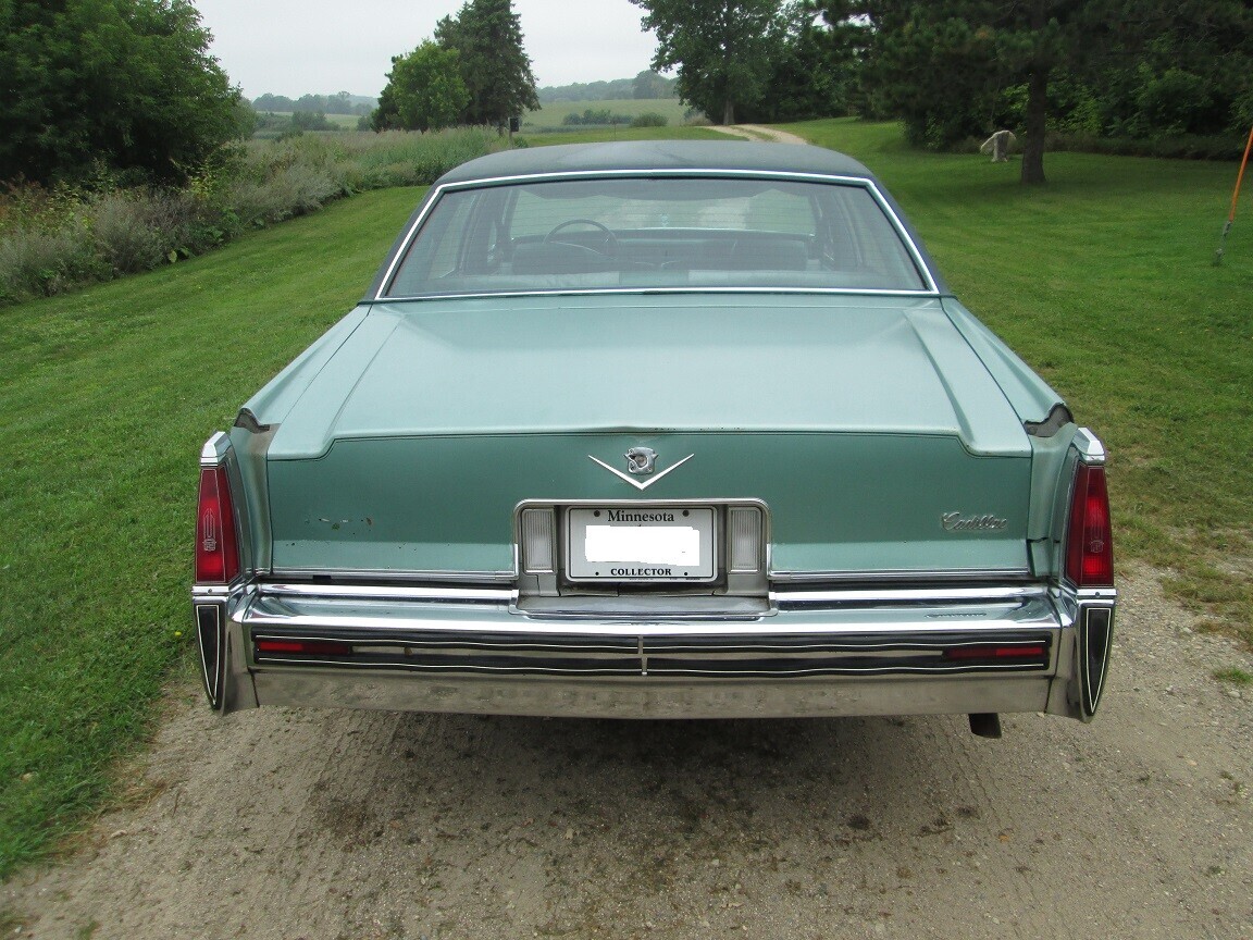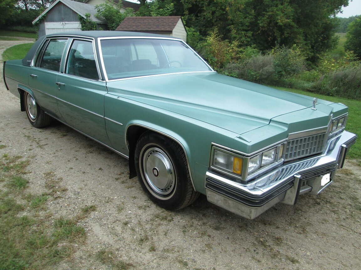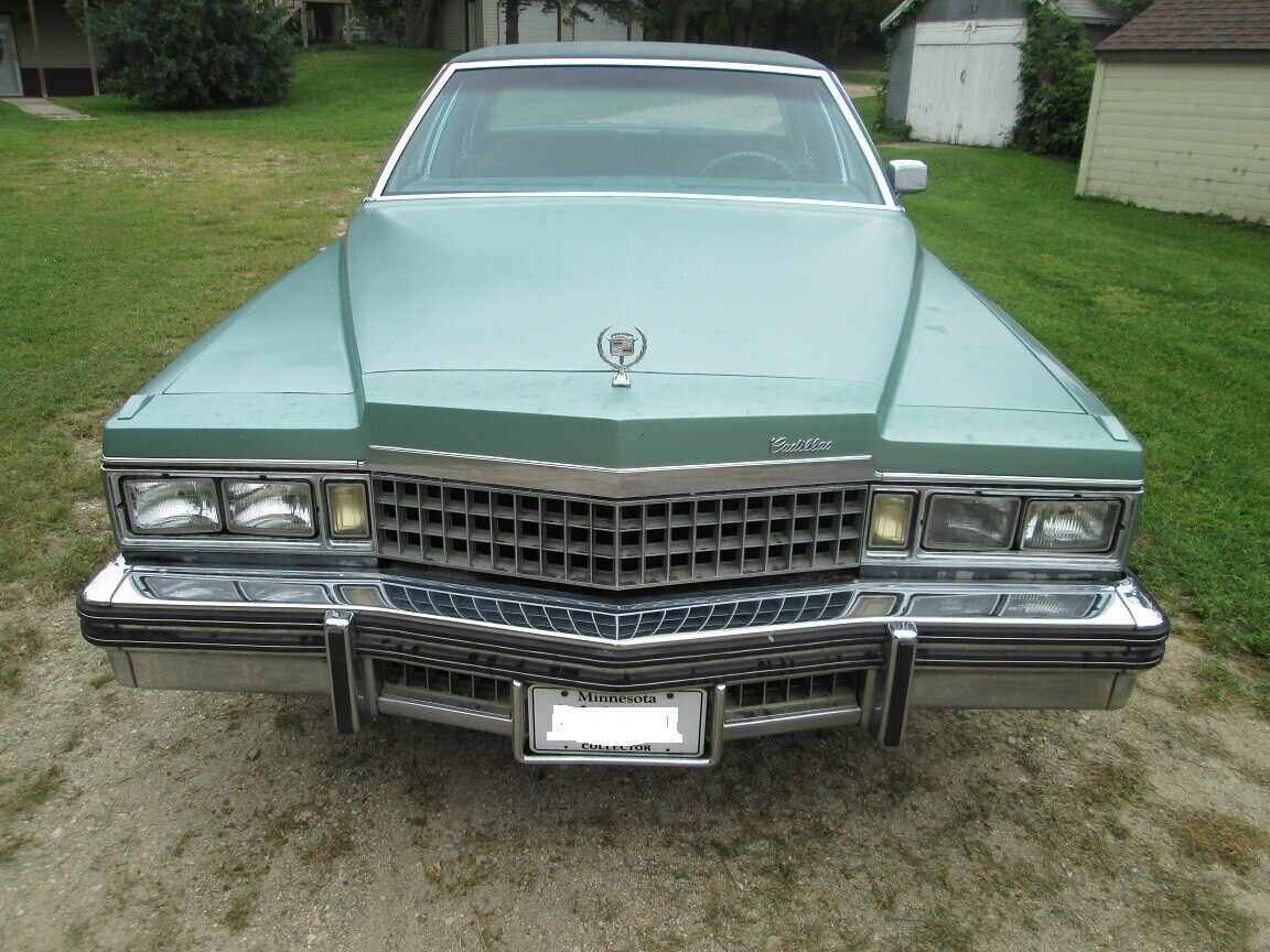 The grill on this car is from a ’78 Caddy. The hood ornament is from a ’78 or newer Fleetwood or Eldorado. The wreath around the Cadillac crest is the giveaway. My second car was a ’78 Sedan de Ville in all dark green with leather upholstery. It was a great car for 55,000 miles. Then, I had to have the carburetor and transmission rebuilt.