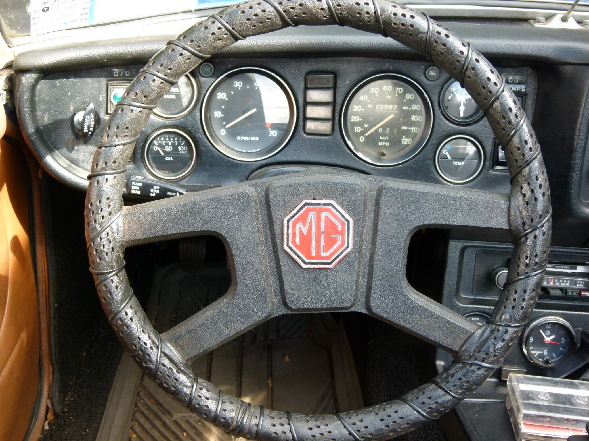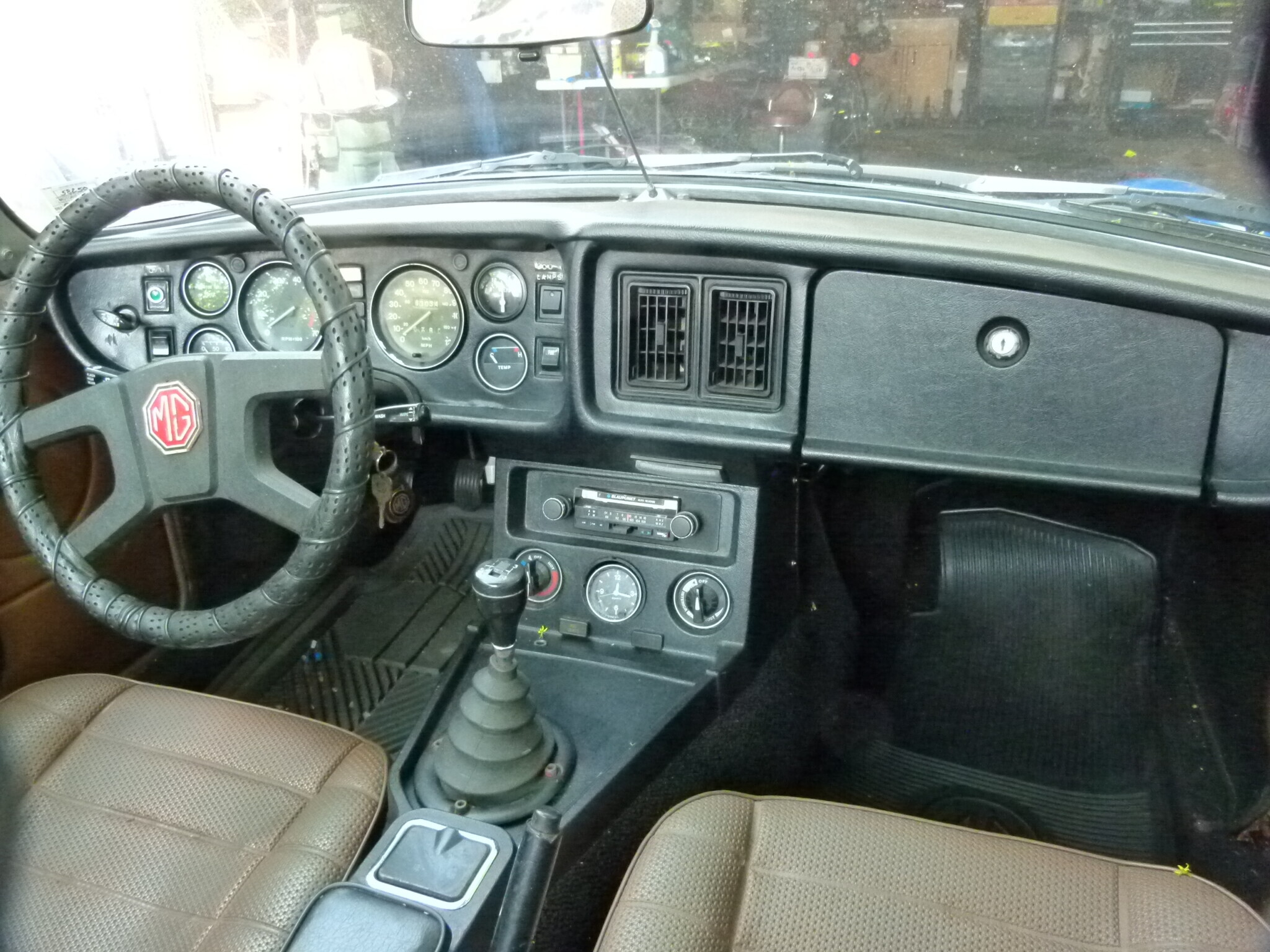 The MG’s interior presents well for a classic of this vintage, with Tan vinyl trim and a new Black carpet. There are no rips or tears in the seats that slide easily on their runners. The door trims have a few small tears, and the previous owner added aftermarket speakers served by the functioning vintage Blaupunkt radio/cassette player. The dash cover is new, and everything works as it should except the odometer. It quit since the owner purchased the vehicle, but he confirms the speedometer and tach read accurately. There are a few practical and carefully considered modifications. The owner eliminated the cigar lighter, relocating the clock to its spot. The space previously occupied by the clock now houses a voltmeter, a sensible addition. The heater and fan work as they should, and a rocker switch on the dash operates the foglights concealed behind the grille. The owner added an electrical cutoff switch to the battery and a fire extinguisher, representing wise modifications on any vintage classic.