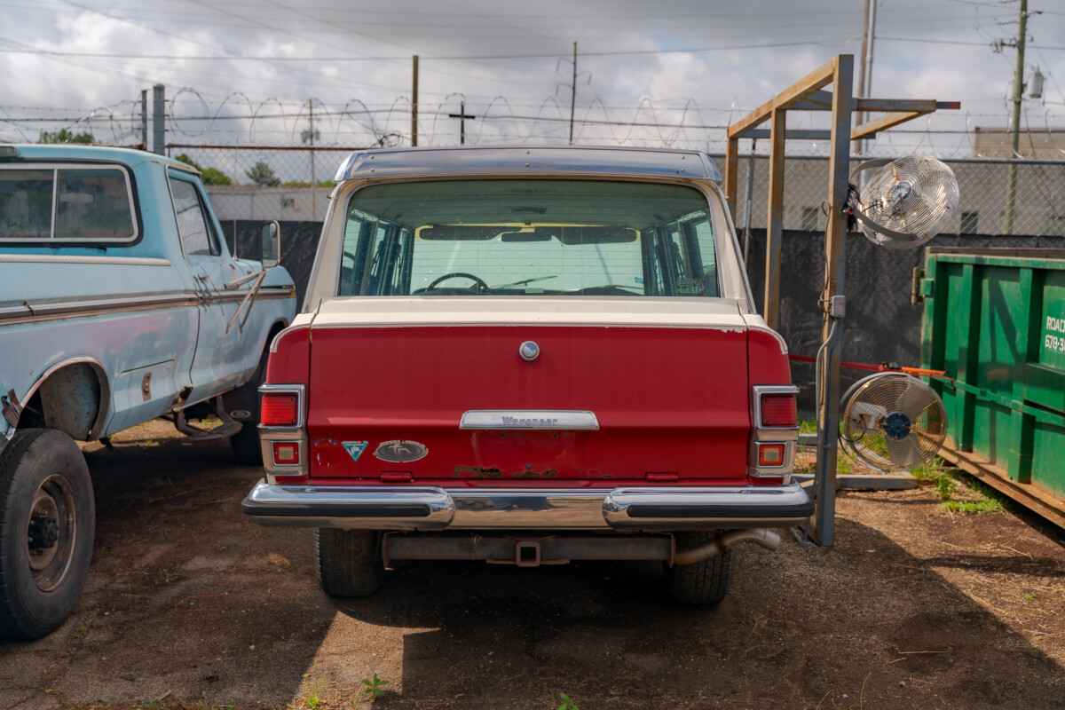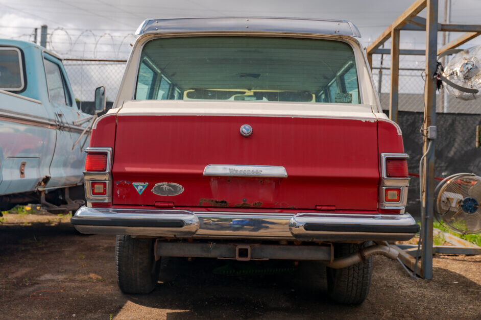 The tailgate is missing the brushed-chrome panel that runs from reverse-light to reverse-light…suggesting that a lesser-trim Cherokee tailgate wound up there. The front side lights are off a 1970-73 Wagoneer. Since the holes are drilled in different positions, the suggestion is, fenders are replaced.