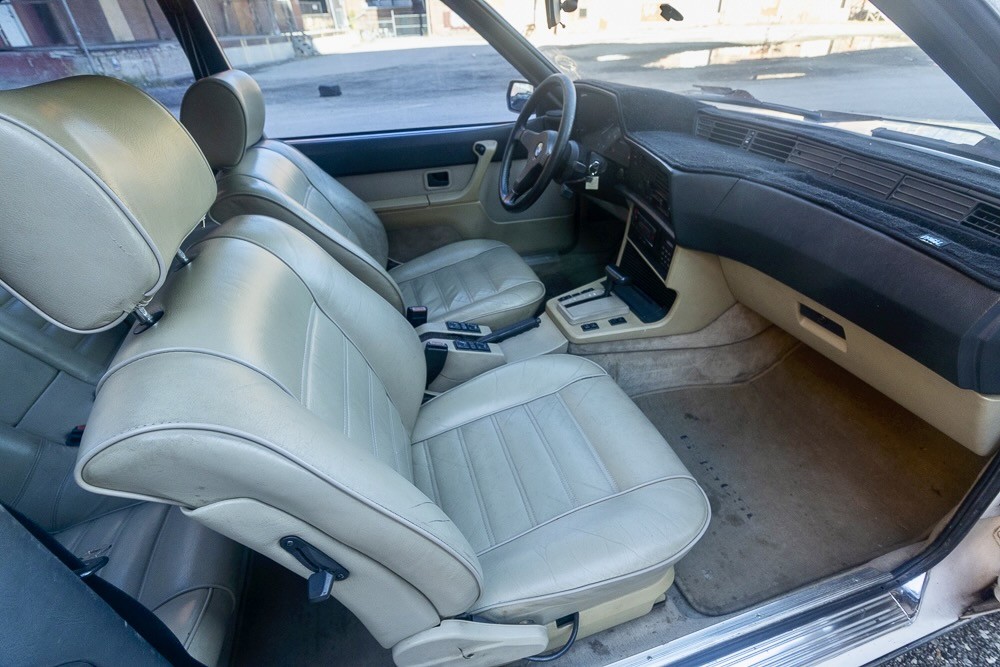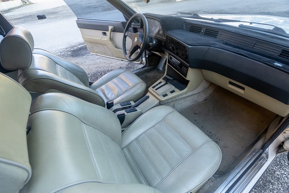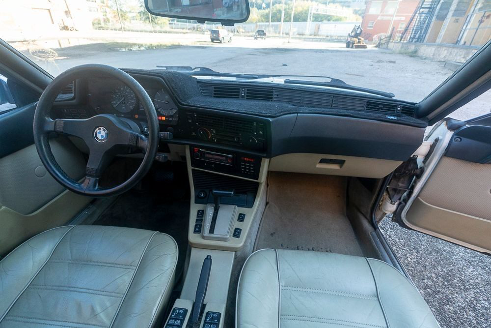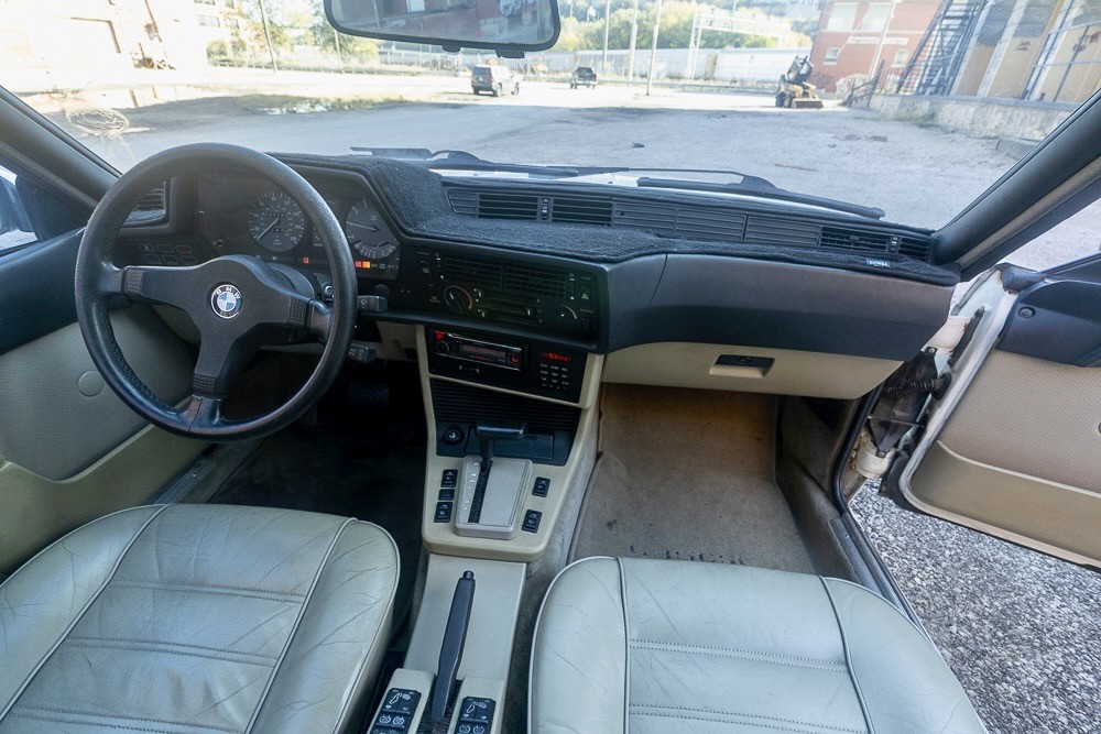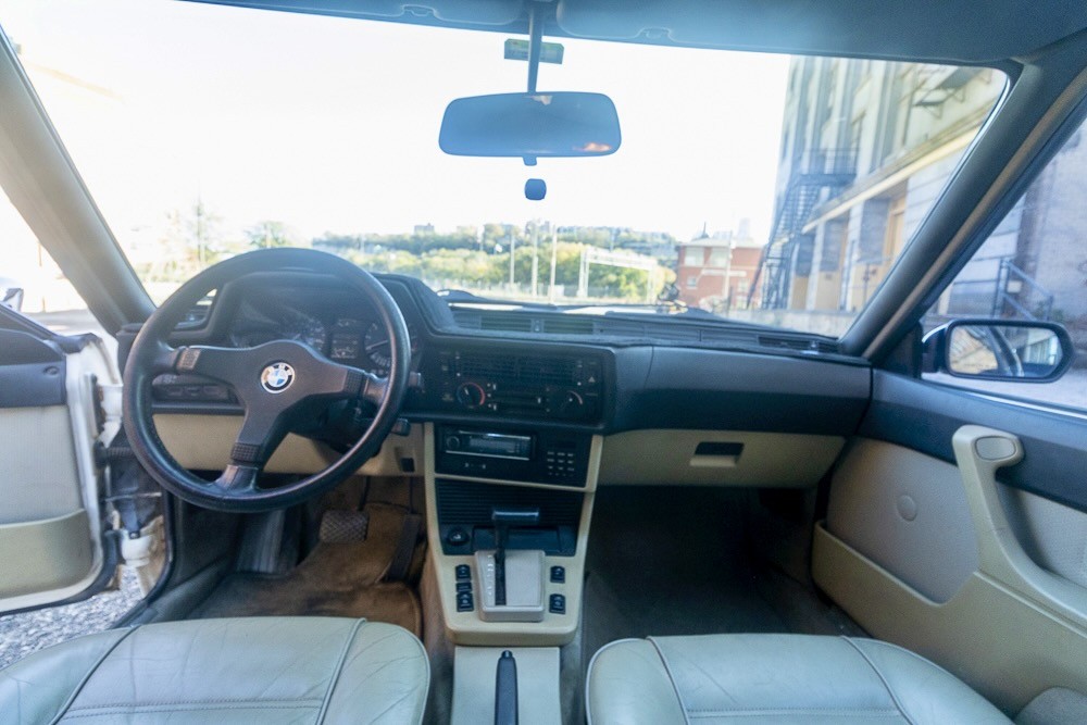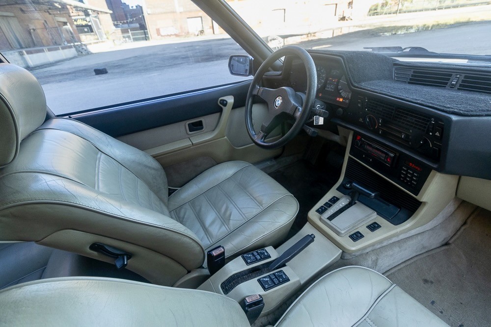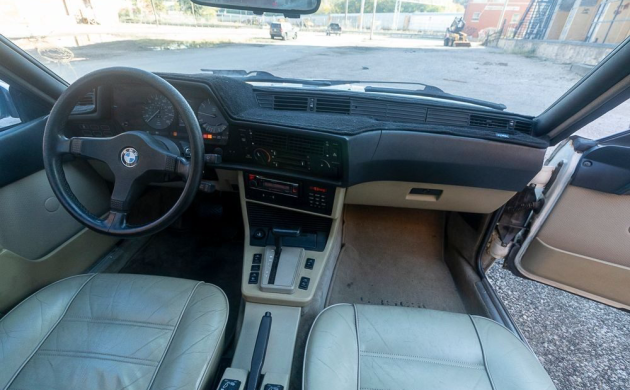 Part of the charm of an ’80s or ’90s BMW is its smooth inline six, 3.5 liters (with some judicious rounding) under the hood of the 635. With 182 horsepower and the aerodynamic styling of a land shark, freeway cruising is effortless. Backing up the six is a ZF four-speed automatic with an overdrive top gear. The seller says that the car runs perfectly with new plugs, wires, distributor, and water pump, but there are some things that will need to be addressed. Under the hood, it needs a new Idle Air Control Valve (it’s unplugged now) and it has a power steering leak. It’s also due for brakes and shocks, and one wheel speed sensor needs to be replaced. Aside from the ABS and the windshield washers, however, everything works, including the air conditioning and cruise control.