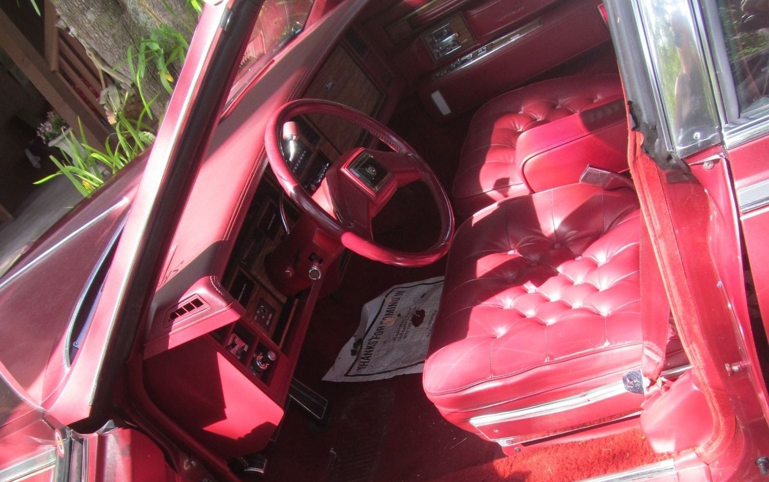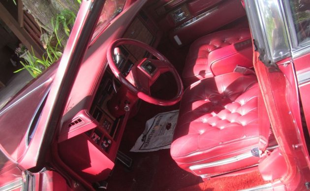 Even though it is of the “red” variety, it’s not fire engine red but a darker cranberry red, almost like my ’75 Fleetwood was. Although not a fan of the faux convertible top either I’ll still take it. This is about the only 80s Cadillac I’ll take after 1976.