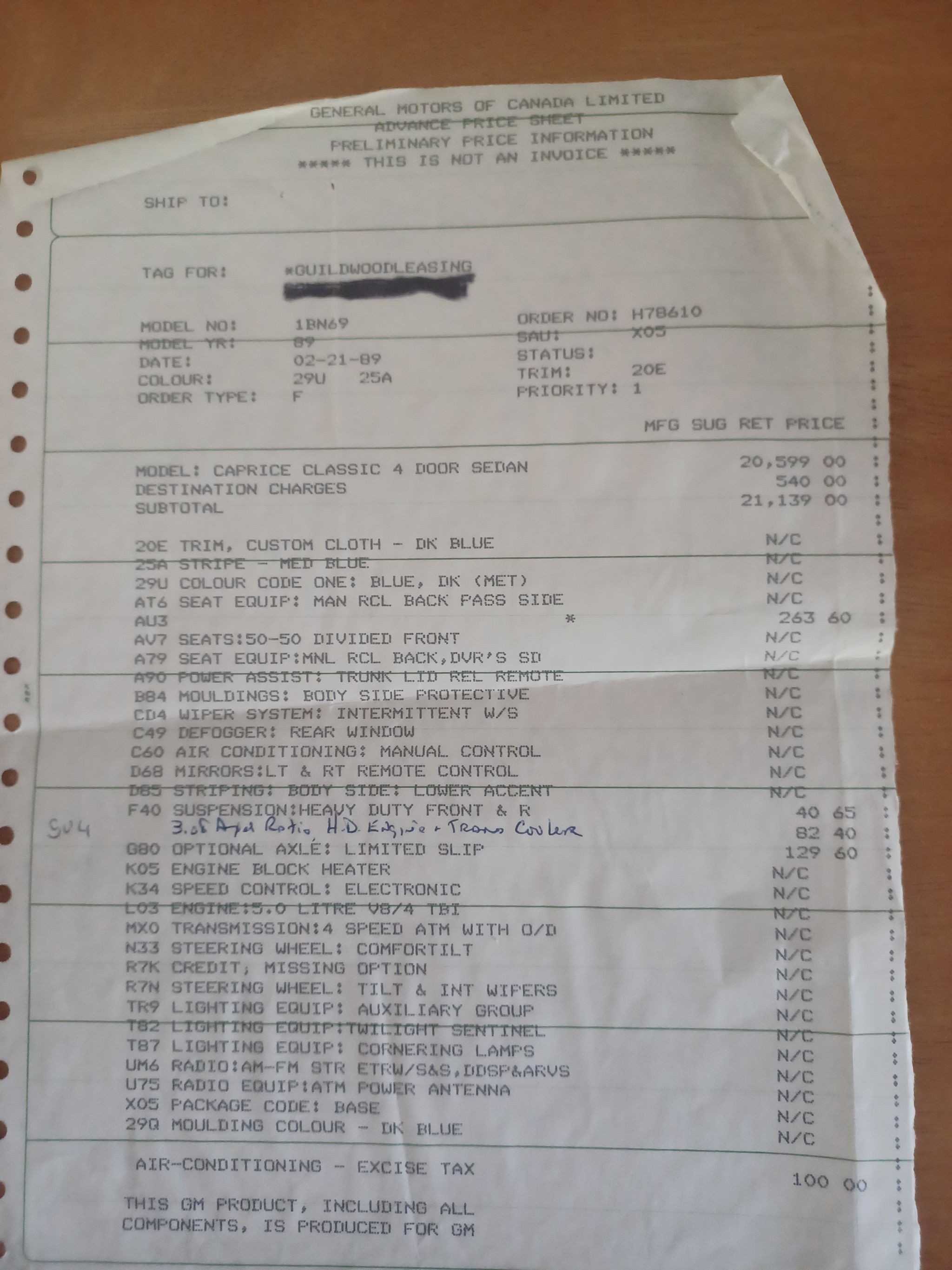 Under the hood sits Chevrolet’s dependable 305 cubic-inch V8, paired with a 700R four-speed automatic transmission. Known for smooth operation and robust longevity, this drivetrain was a staple of GM’s full-size lineup throughout the 1980s. The seller includes the original factory spec sheet, offering a rare glimpse into how the car was optioned when new.