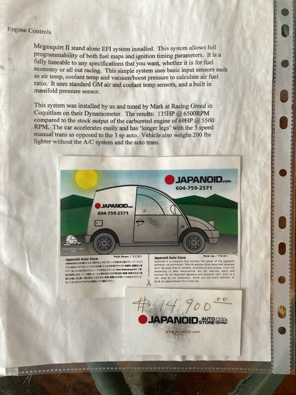 The comparisons to a snail went beyond its appearance with the S-Cargo. Nissan offered a single drivetrain configuration, a 1.5-liter four-cylinder engine sending 70hp to the front wheels via a three-speed automatic transmission. Naturally, these vehicles would hardly threaten muscle cars on acceleration, and the four ran out of puff with the needle nudging 75mph. However, the seller has fed this S-Cargo a big spoonful of Wasabi, and it should prove entertaining when the driver presses the pedal to the metal. The original motor is a distant memory, with its space occupied by a turbocharged Nissan E15ET four that sends its power to the road via a five-speed manual transmission. The seller indicates the engine and transmission have only clocked around 5 kilometers (3 miles) since receiving a complete rebuild. After the engine was installed by Japanoid Auto Store it was sent over to Racing Greed to be tuned on a dynamometer. After getting it all dialed in, the car produced a very healthy 135 horsepower, so nearly double with the original engine produced. Combined with the significantly better transmission, this Nissan should provide impressive performance while potentially sipping fuel at around 50mpg. For those considering practicality, it makes it a viable commuter or daily driver that would hold its own on the open road. And the seller-provided documentation showing the work that was done with a total cost of $14,900 CAD. They recently spent another $638 having all 4 brakes serviced. And they are also including a carpet set and a set full set of wheels with summer tires installed.