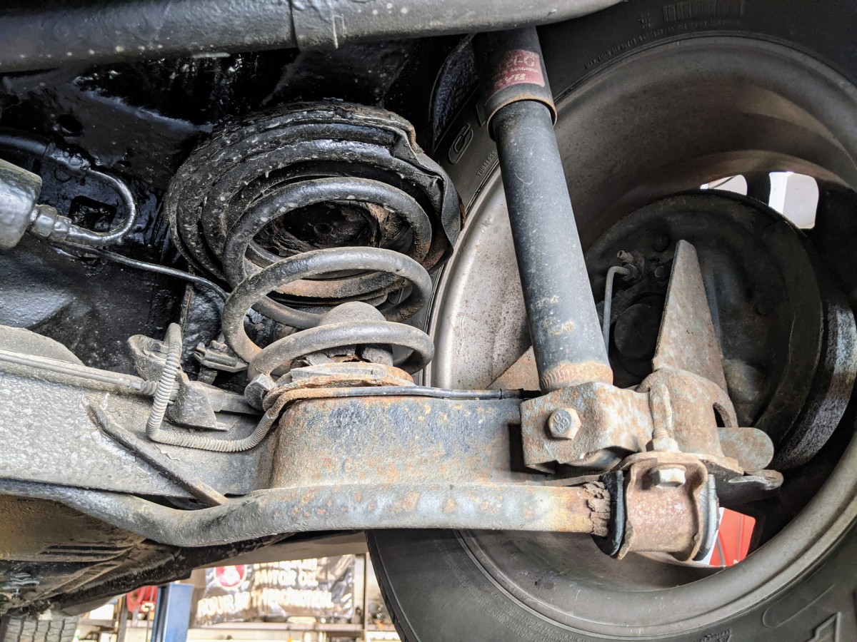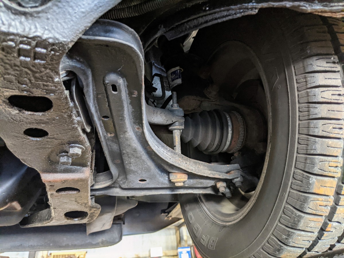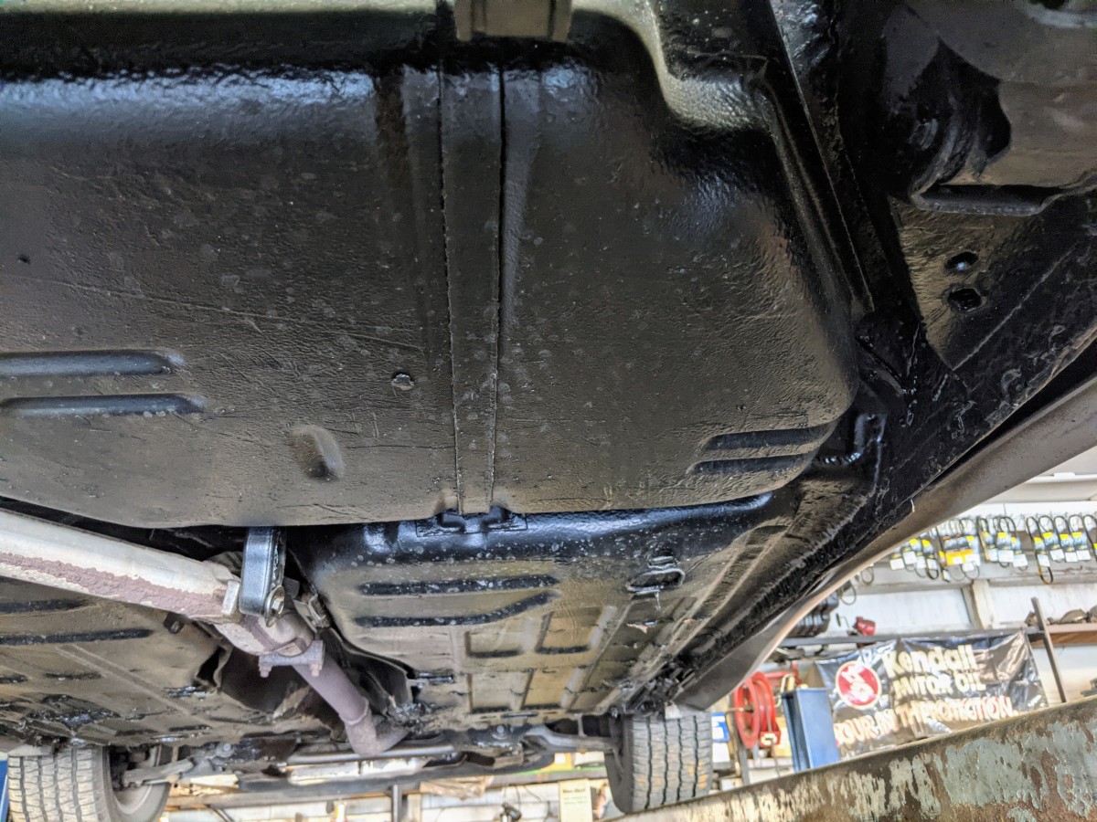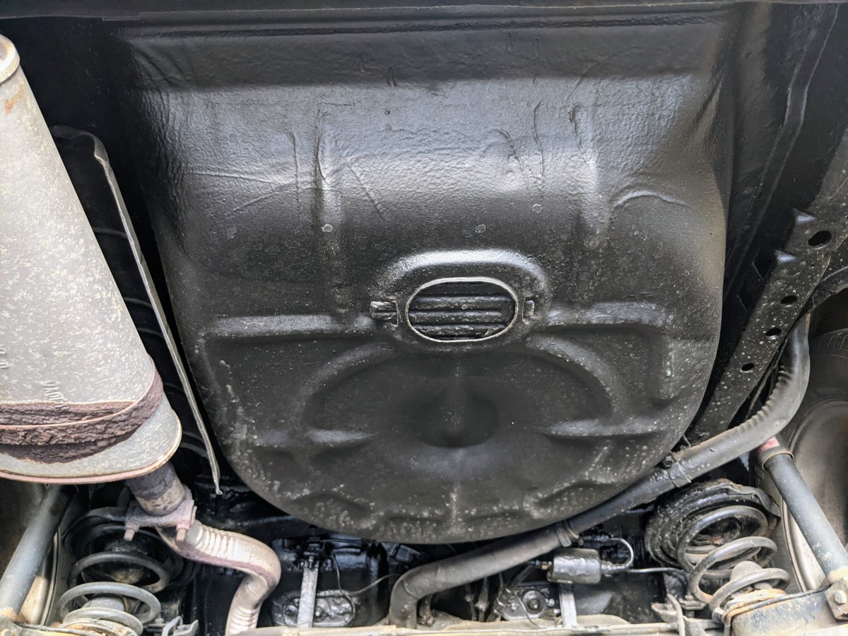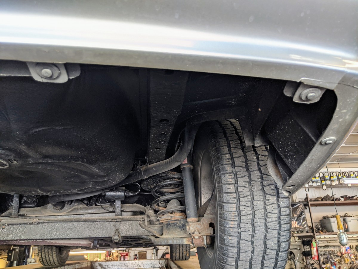 Although I almost ignored the resale “rustproofing” in a can covering the floor bottoms-I can’t ignore the ripped or cracked leading cradle mount forward of the right front wheel that is right at the edge of photo 24… something to consider for everyone.