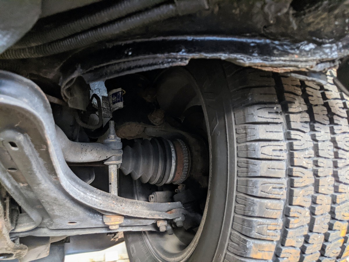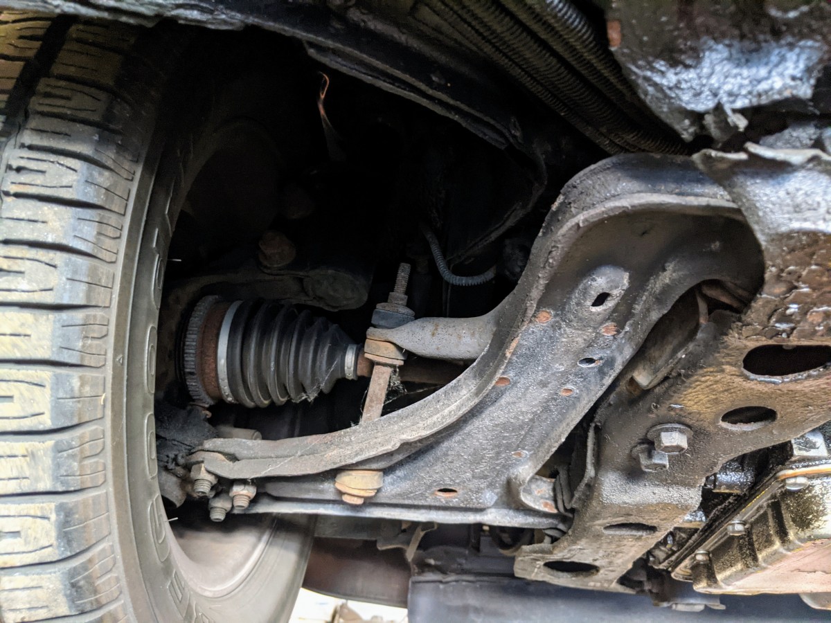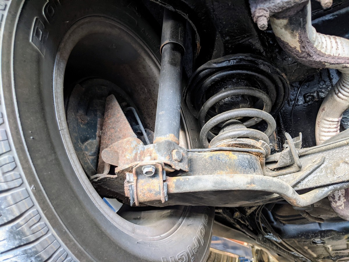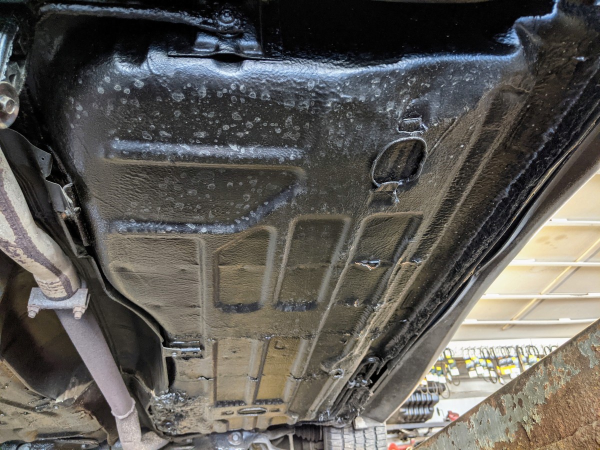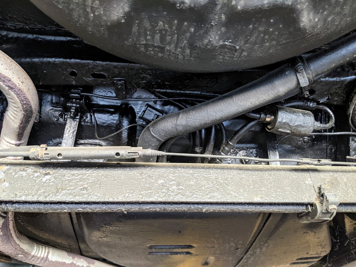 Although I almost ignored the resale “rustproofing” in a can covering the floor bottoms-I can’t ignore the ripped or cracked leading cradle mount forward of the right front wheel that is right at the edge of photo 24… something to consider for everyone.