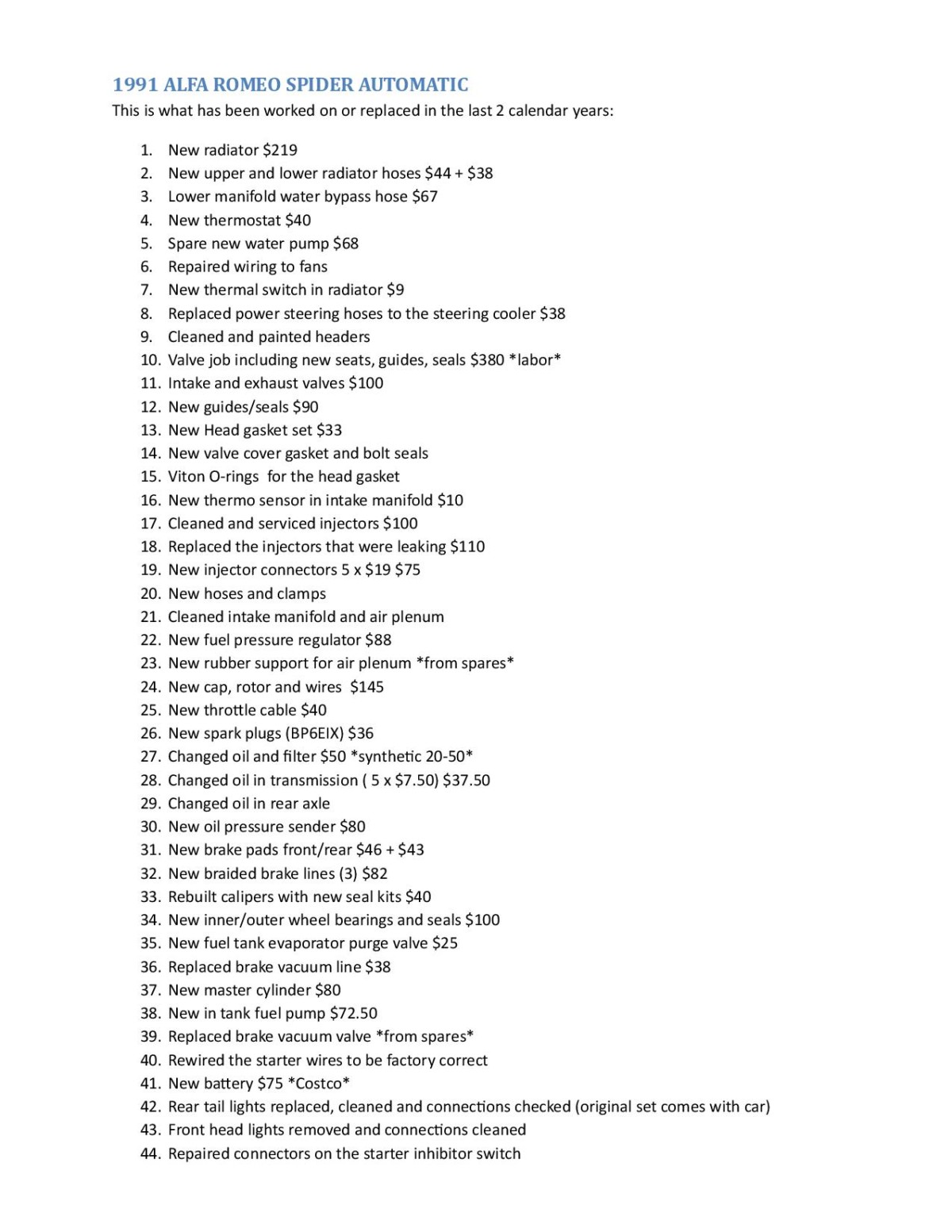 While Alfa turned the clock backward from a styling standpoint, they updated the Spider’s engine with Motronic fuel injection. While it didn’t really add anything on the horsepower front, the addition of on-board diagnostics is a huge plus, especially for anyone that’s unfamiliar with working on an Alfa. As you can see from Christopher’s list, parts aren’t that expensive for these cars, but doing all the proper maintenance at once can start to add up quickly. Thankfully, he has already done the expensive and time-consuming work that is needed, so you can just finish it up and enjoy. As long as you keep up on the basic stuff, this one should be good to go for a long time now.