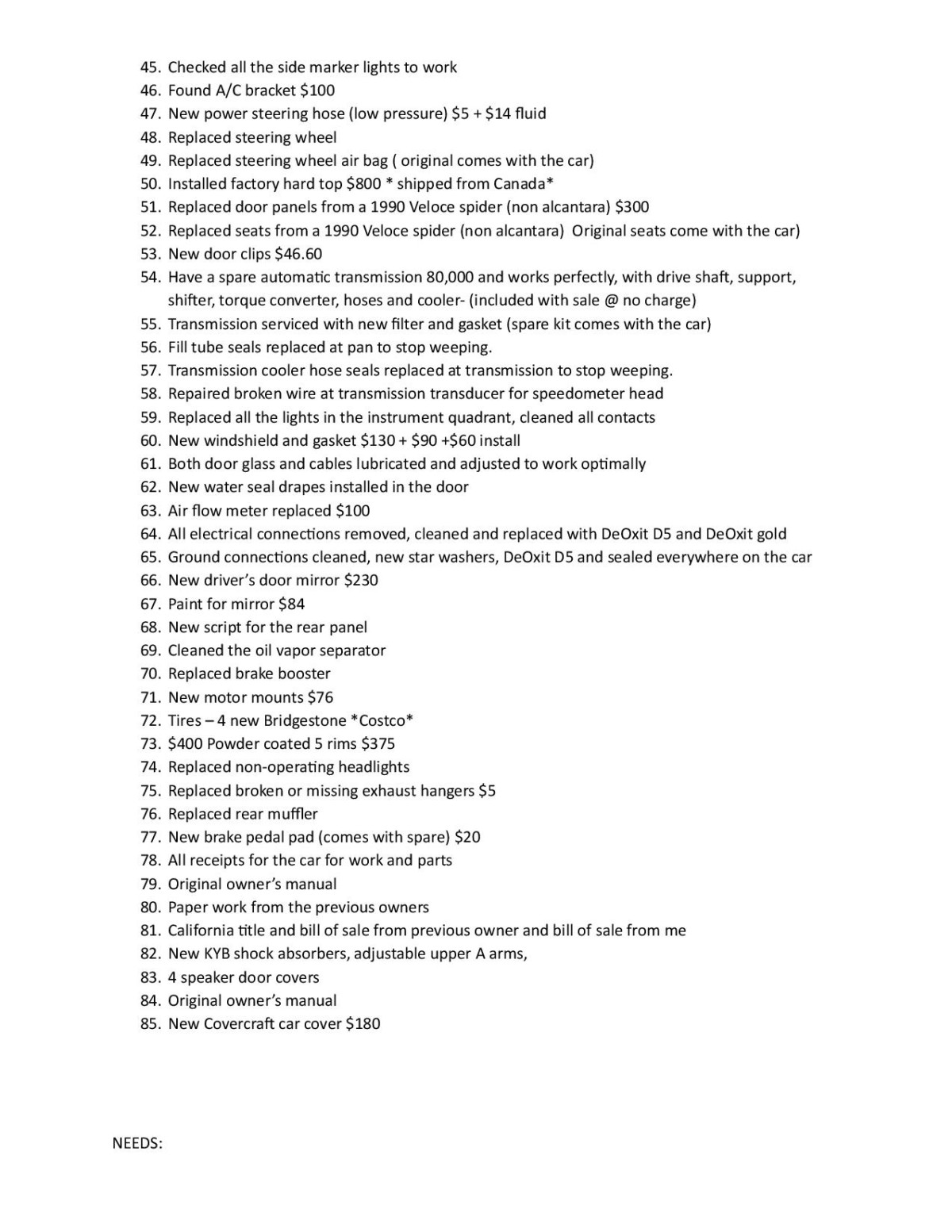 Christopher has an impressive list of what all he’s replaced or repaired on this car. He sent that over as a PDF, which you can view here or in the photo gallery below. The list of what still needs to be done is nice and short, but things like sanding and buffing the paint aren’t necessarily easy tasks to tackle. It’s also going to need a new catalytic converter, at least for those of you that live in states with strict emission laws, but replacements are readily available. That’s the only thing I see here that might keep you from driving it right away and save for charging the AC system, the remains projects are all things anyone can do and probably in just a few weekends!