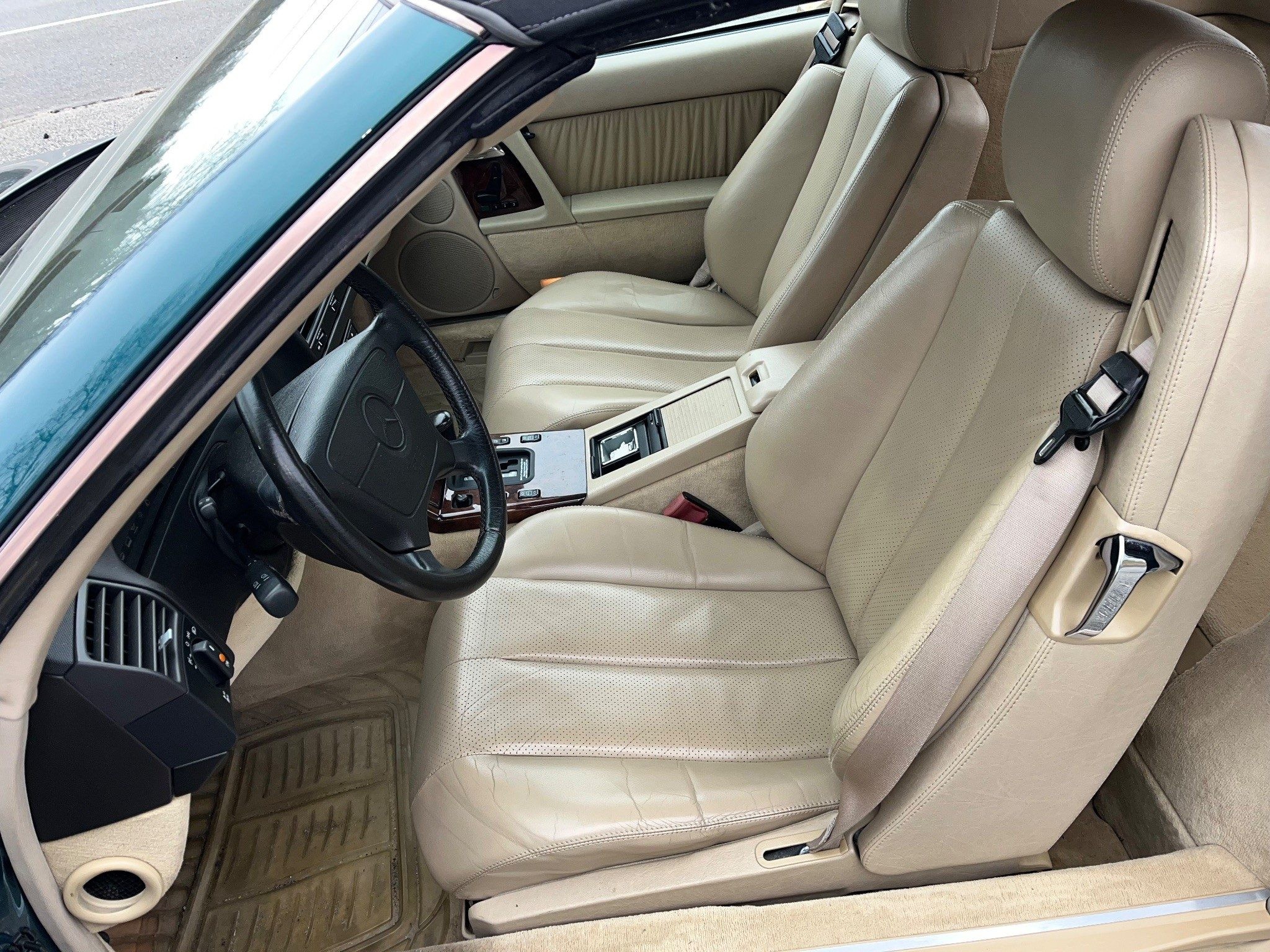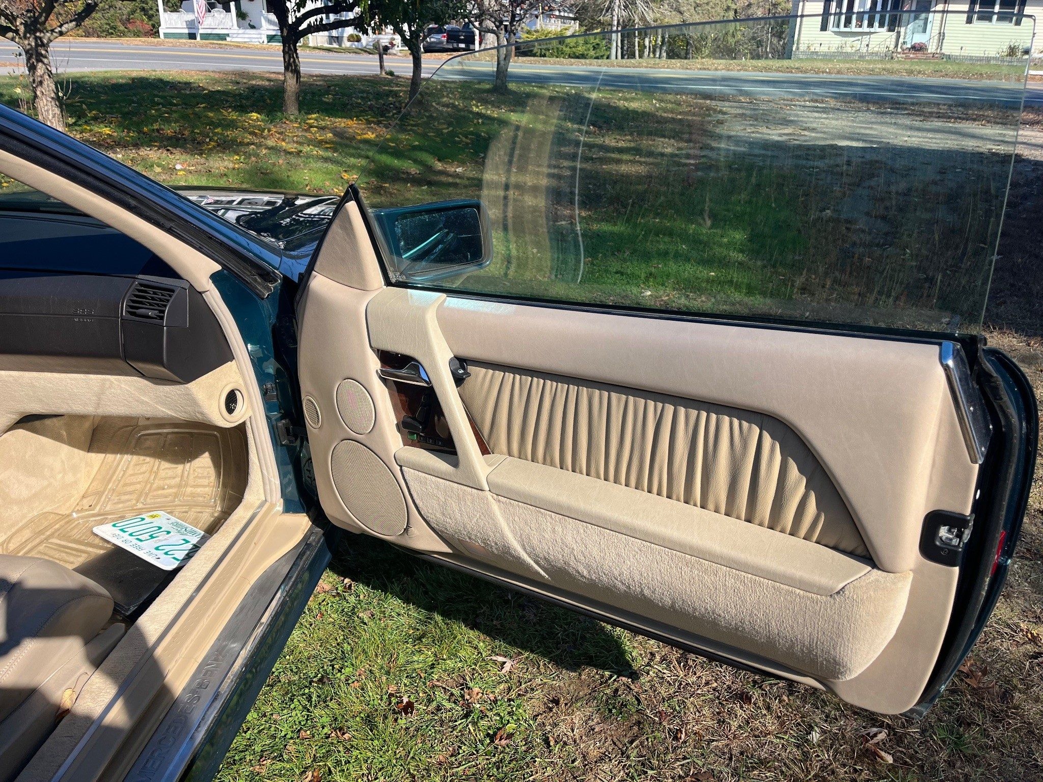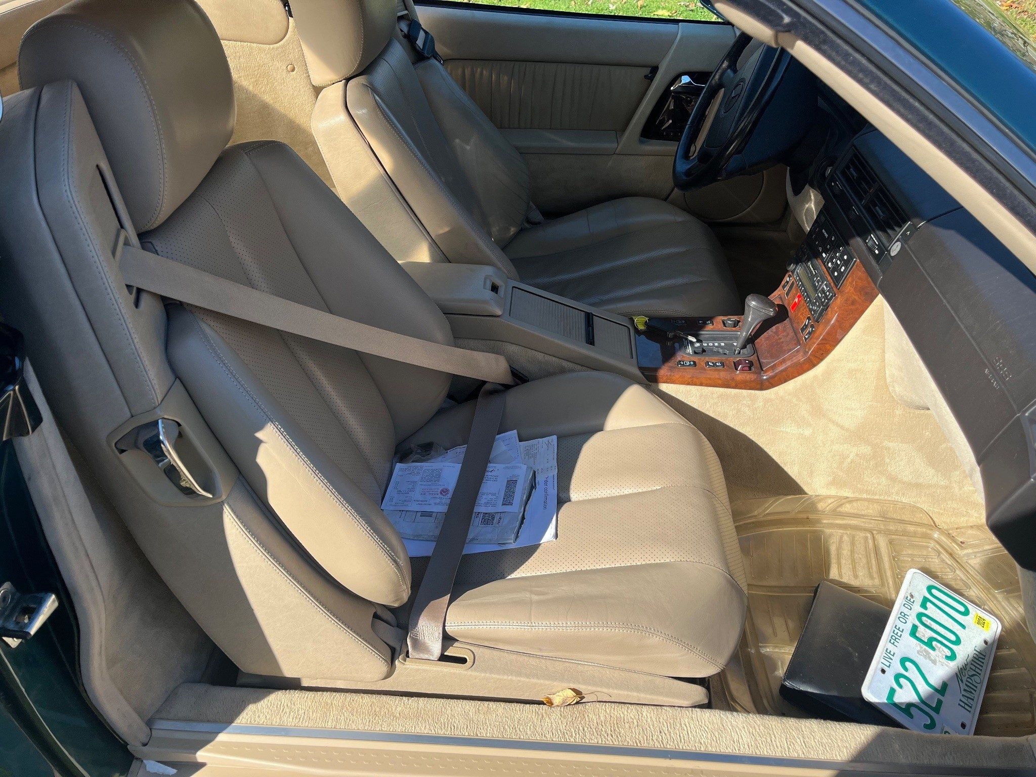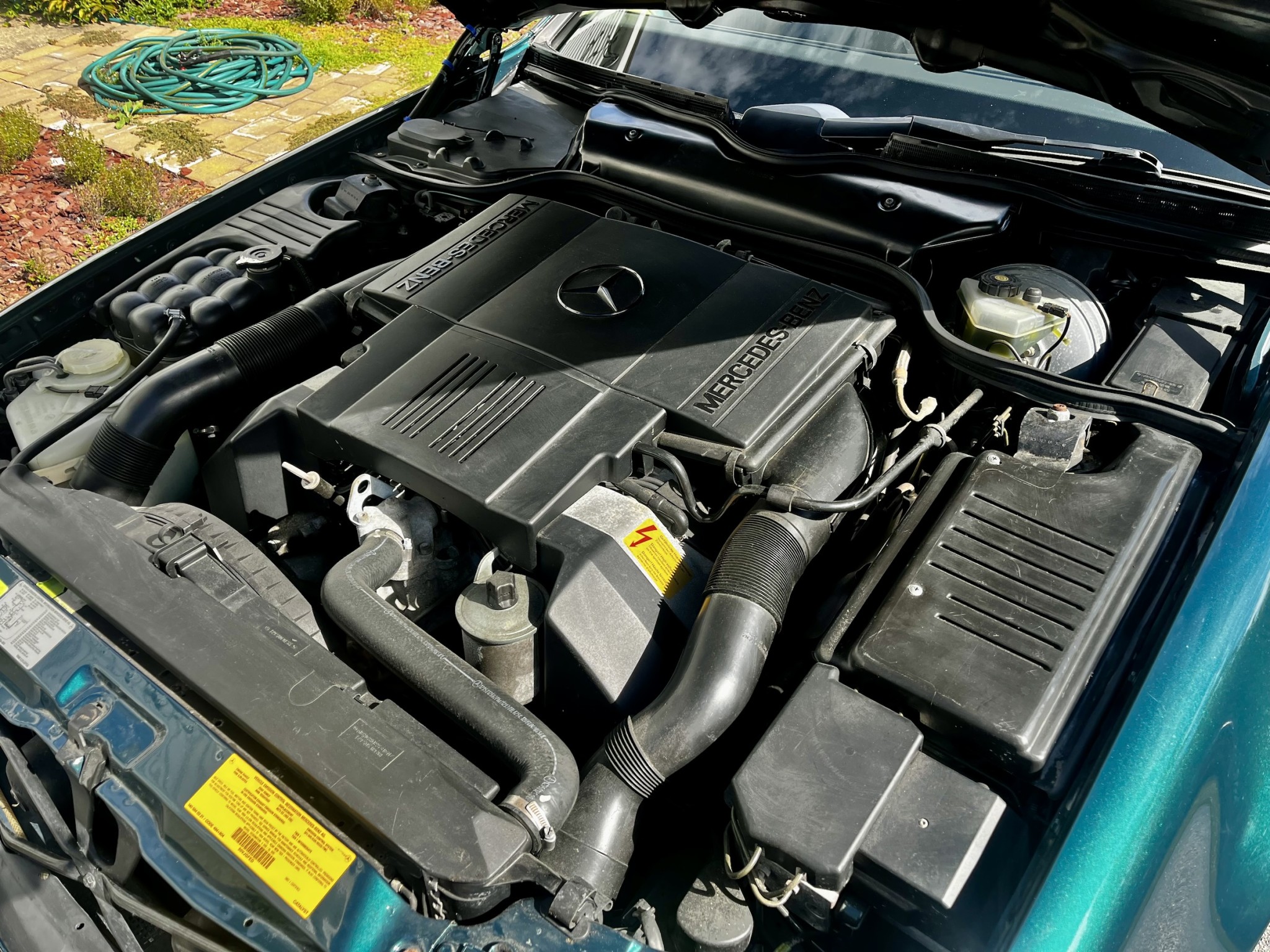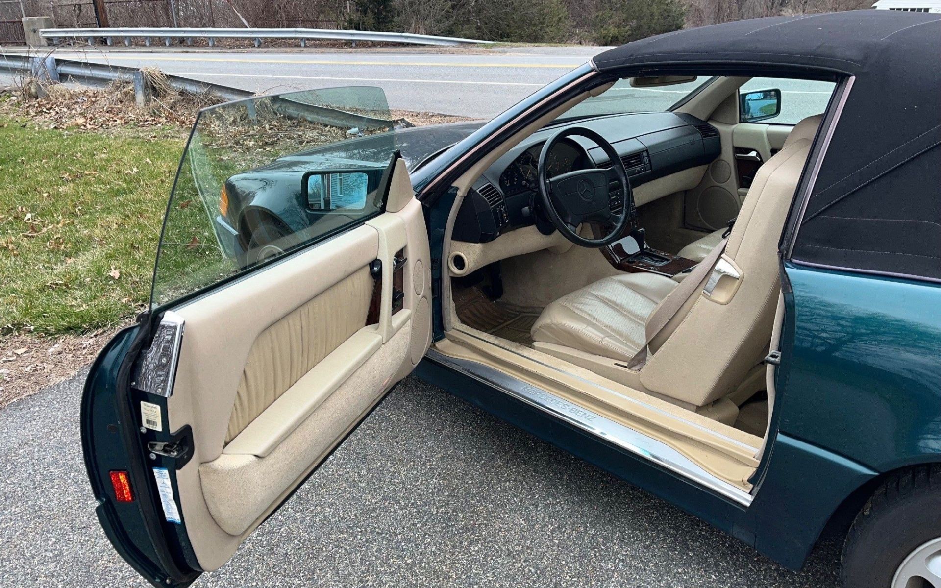 This particular SL500 stands out for its originality. Finished in its factory green paint, the car presents well with no rust and has clearly benefitted from years of careful garage storage. The sale includes both the power soft top and the removable hardtop, with the soft top’s back window recently replaced. All the relays and hydraulic pistons for the retractable top are reported to be in proper working order, an important consideration for prospective buyers.