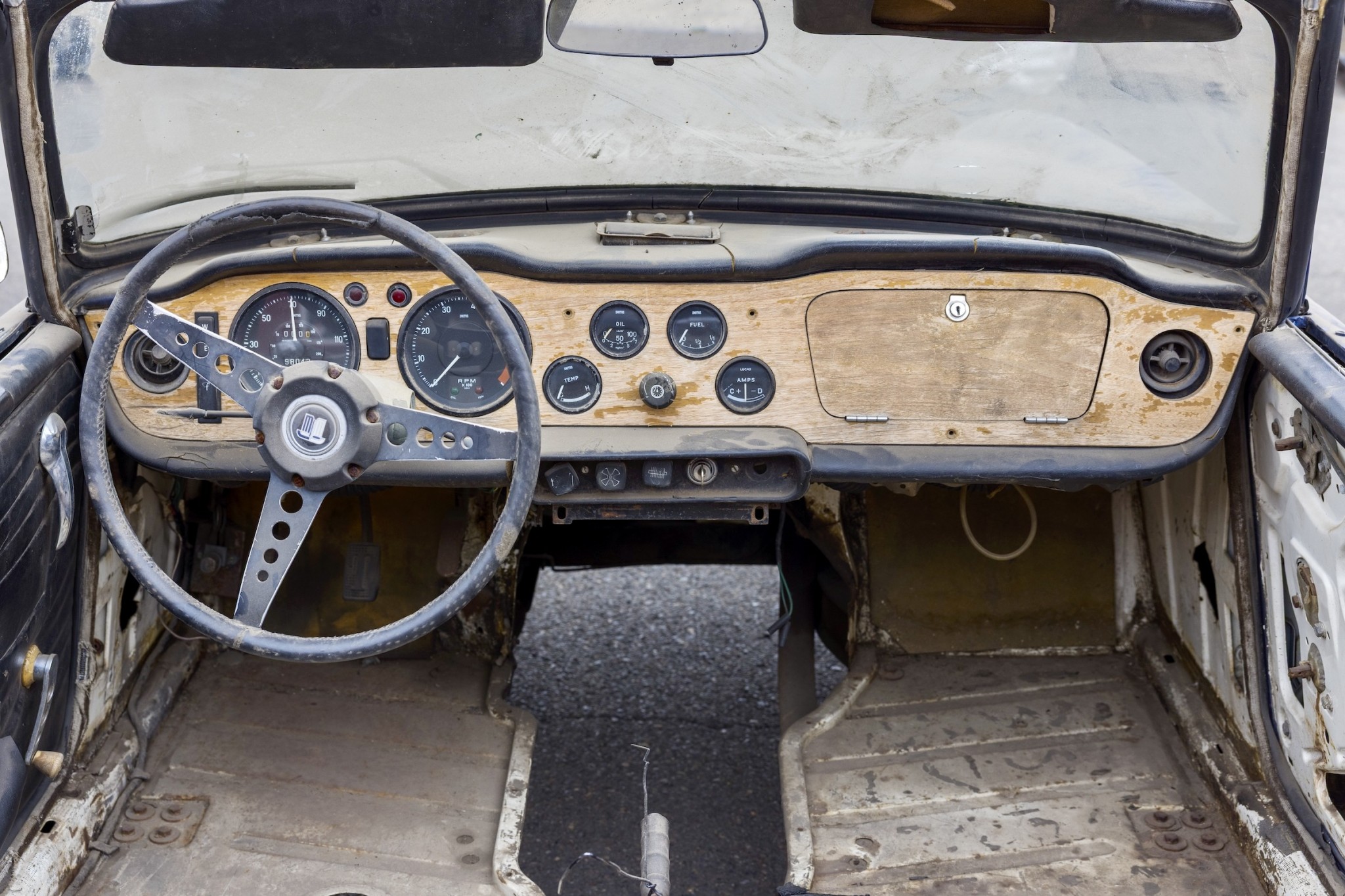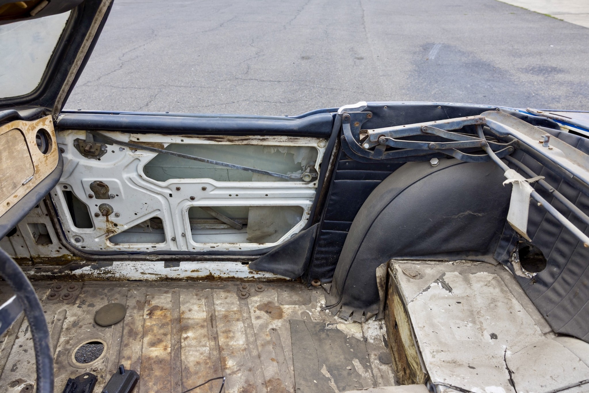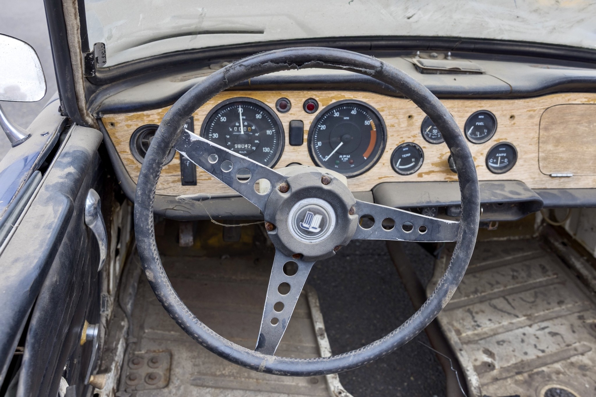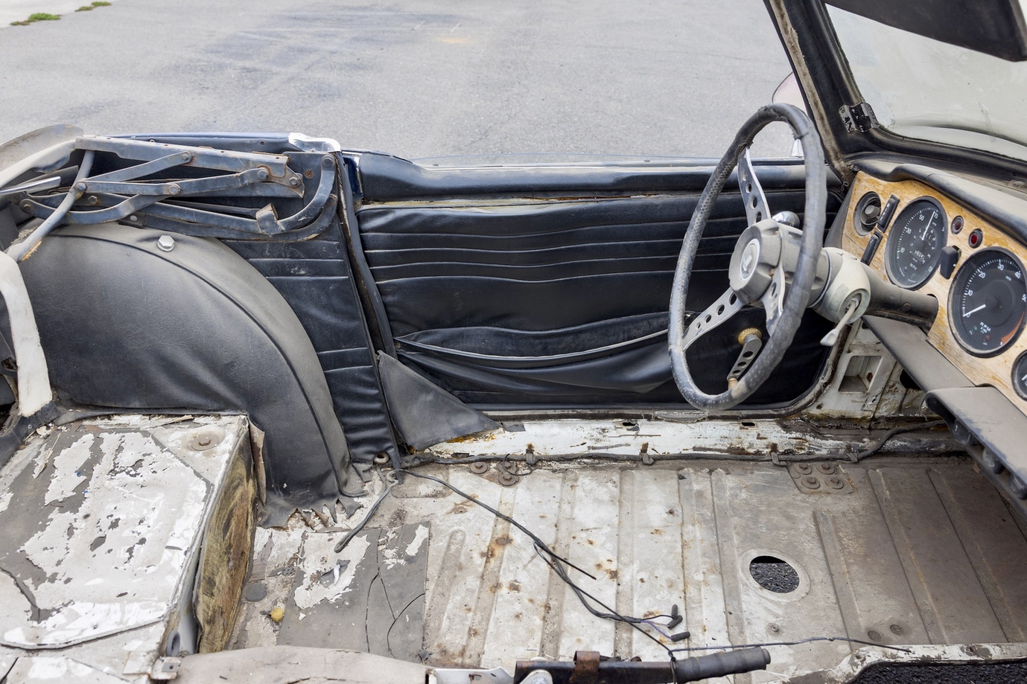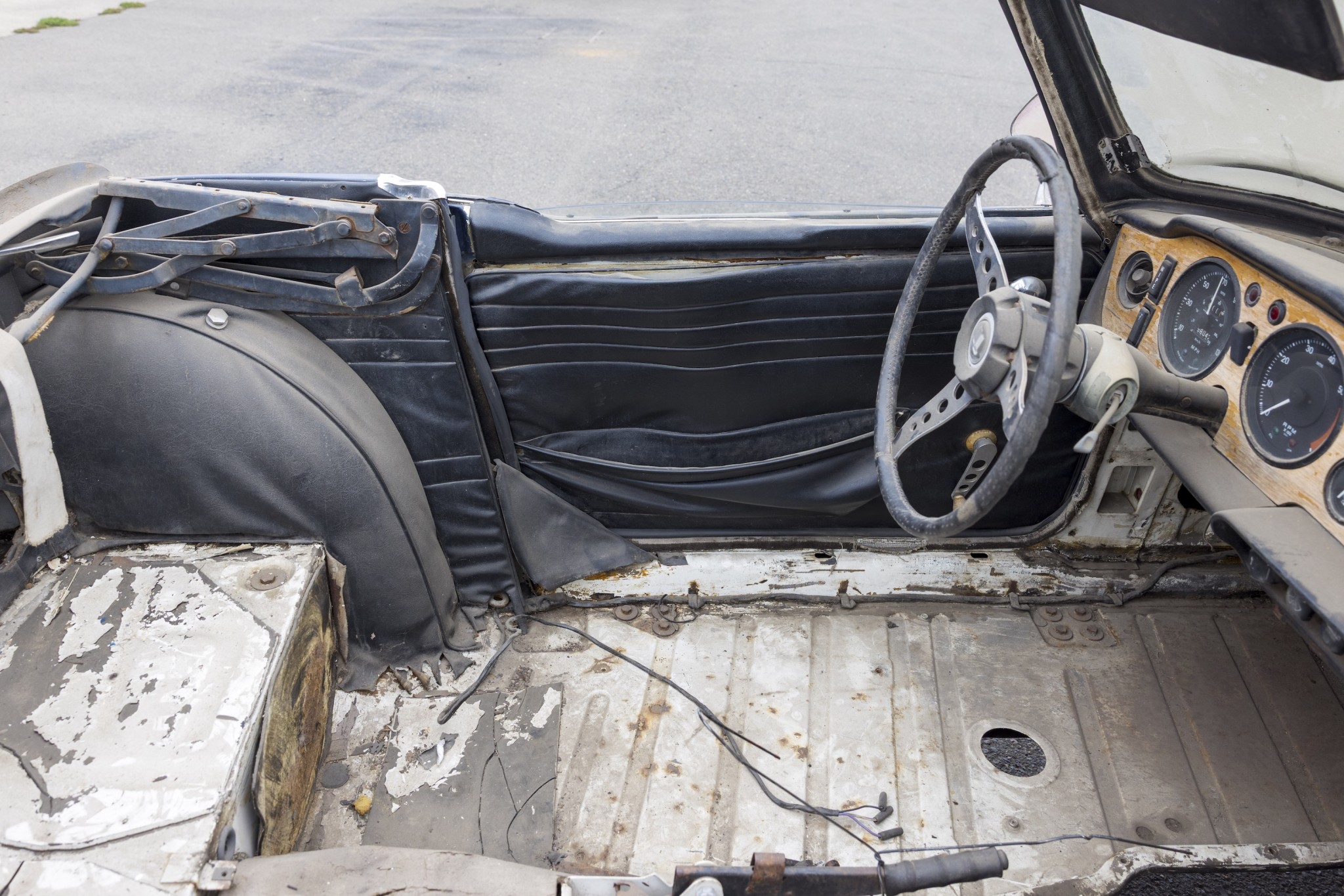 As you can see, the interior is largely disassembled, but the seats and a new dash pad will come with the car. The missing carpet gives us an opportunity to examine the virtually rust-free floor pans. More work will have to be done if you’re giving this car the restoration that such an early build so richly deserves, but parts availability for TRs is not usually a problem.