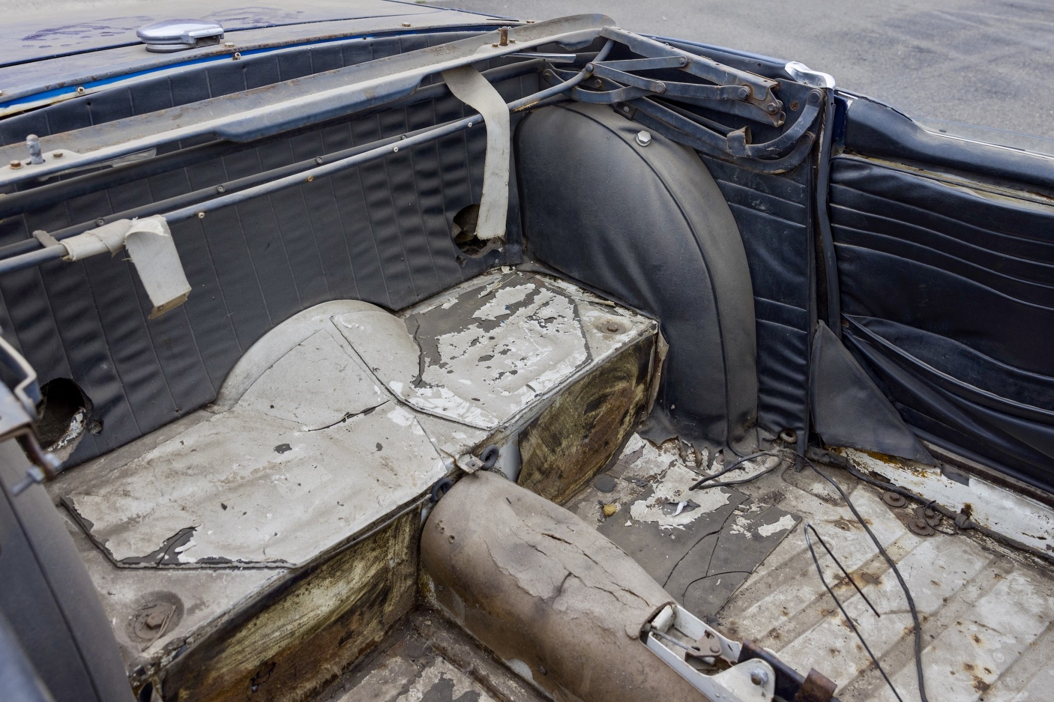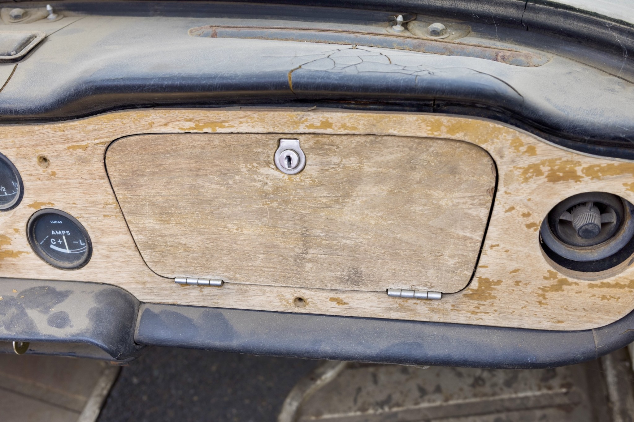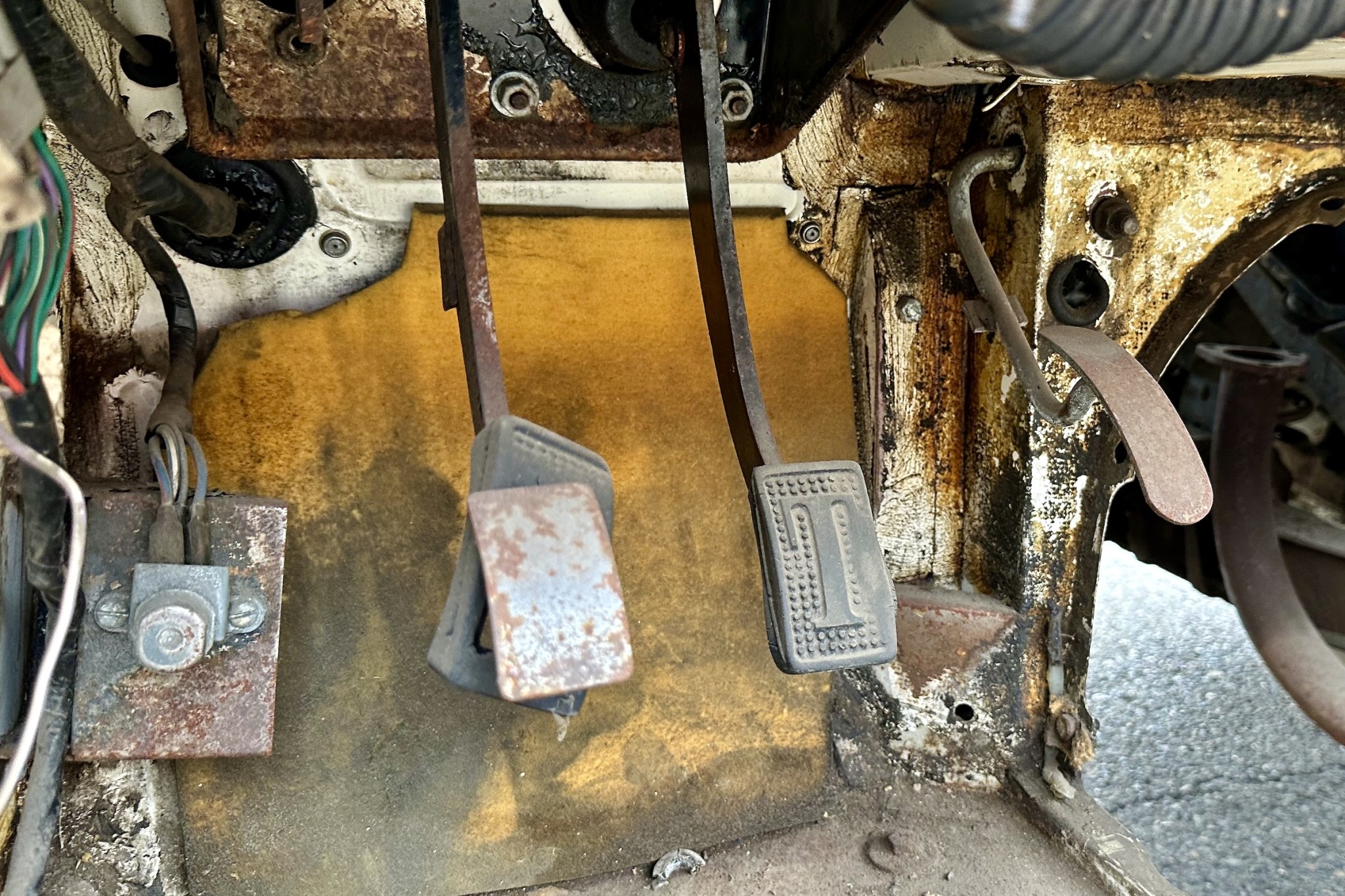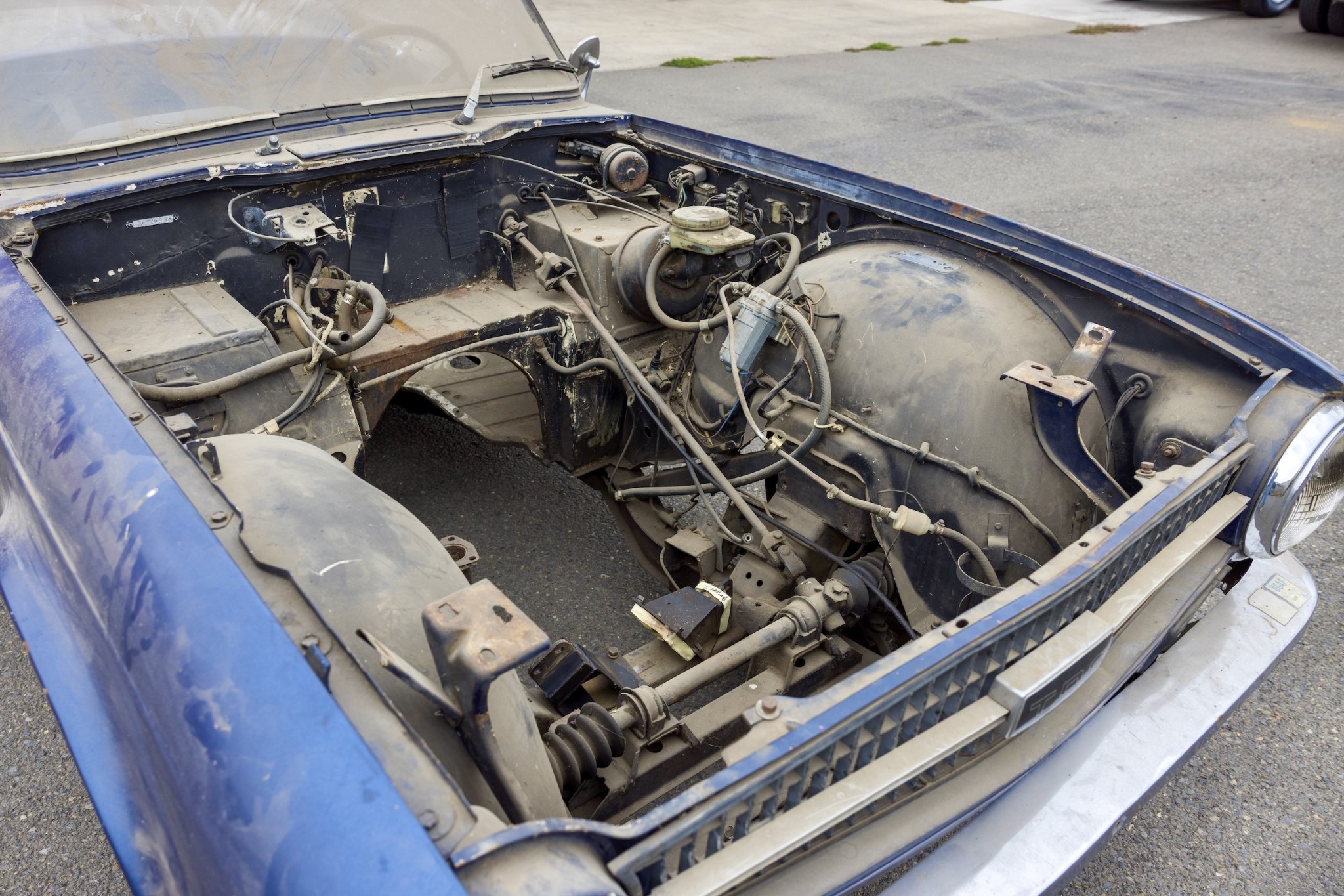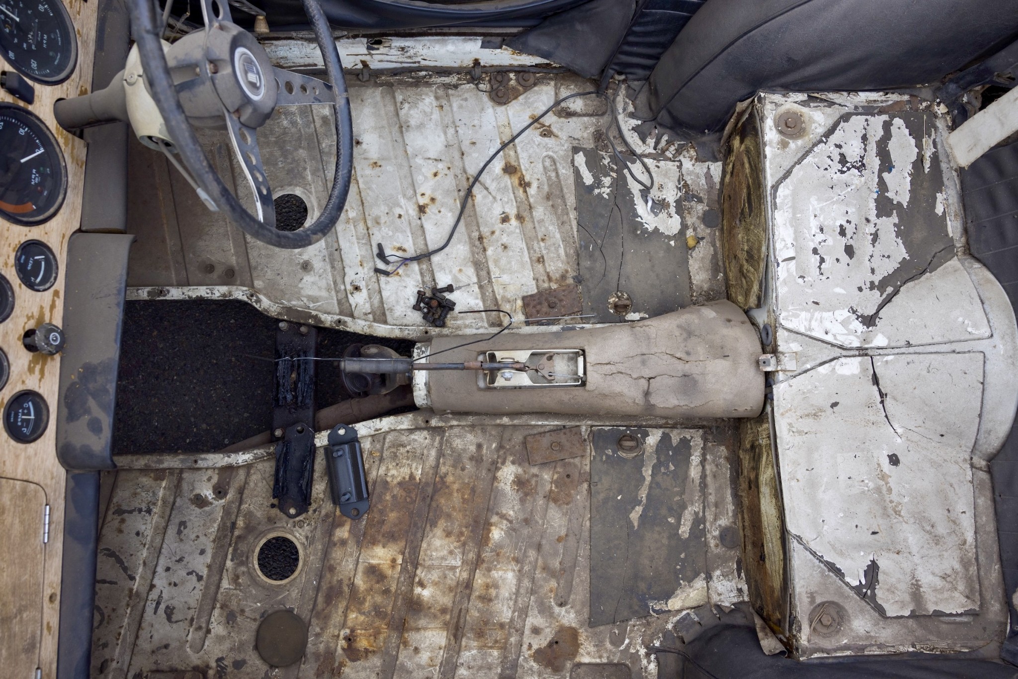 As you can see, the interior is largely disassembled, but the seats and a new dash pad will come with the car. The missing carpet gives us an opportunity to examine the virtually rust-free floor pans. More work will have to be done if you’re giving this car the restoration that such an early build so richly deserves, but parts availability for TRs is not usually a problem.