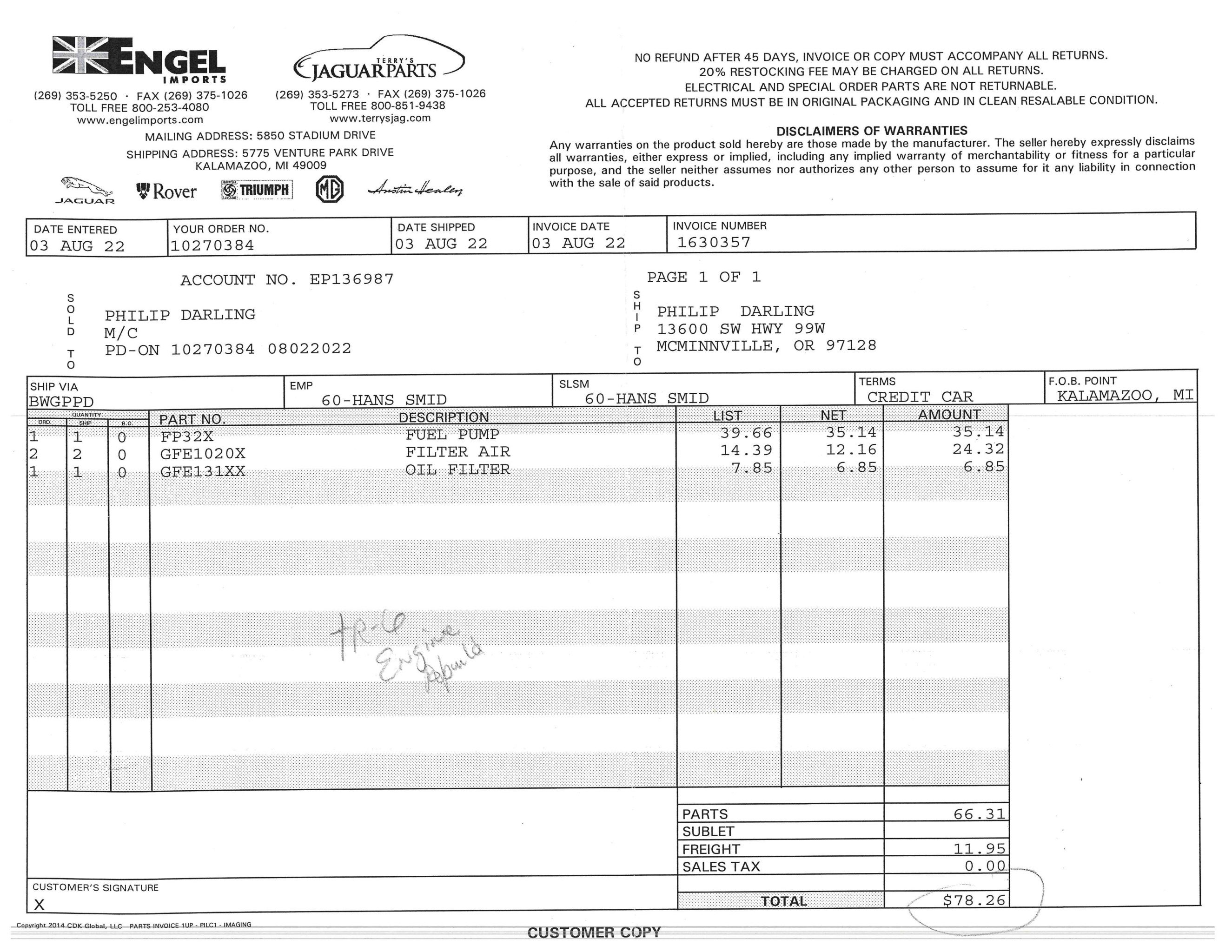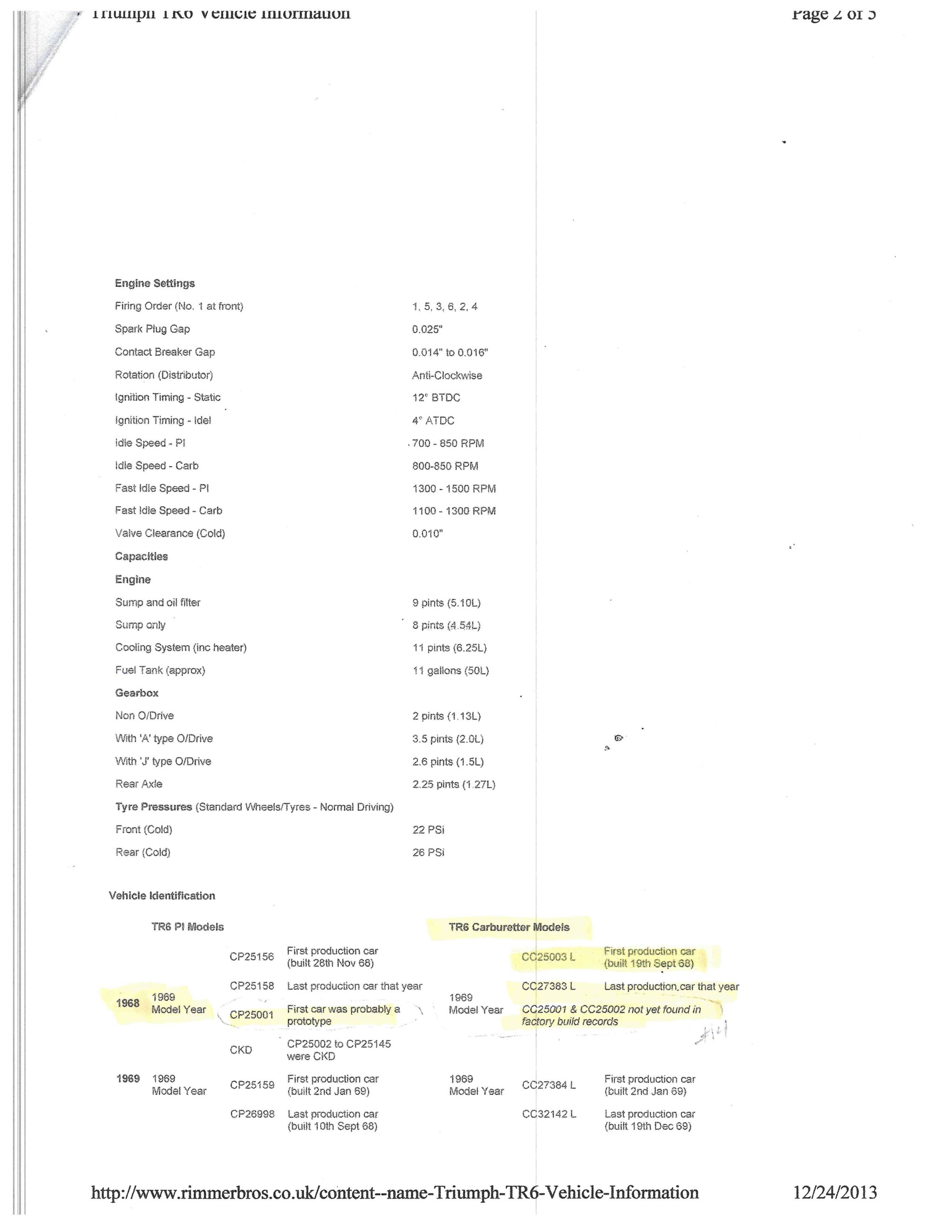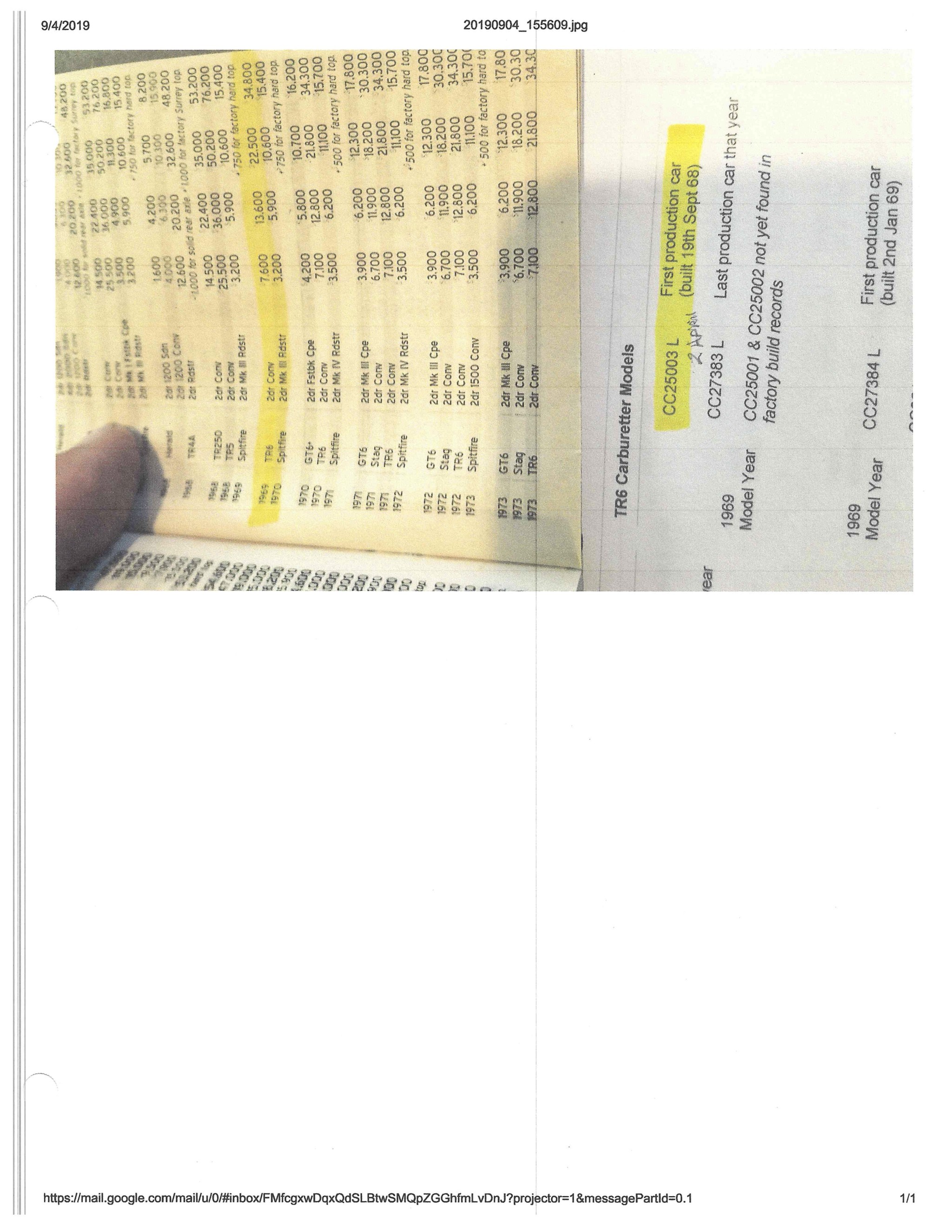 The Petrol Injected cars for for the home market used the CP prefix. CP25001, the first car, was probably a prototype. One thing I’m unsure about is if they would re-use the number sequence between CC and CP cars. If so, it’s possible that CP25001 was car #1, a prototype fuel injection for the UK market, C?25002 unknown, CC25003 the first export TR6, and this car CC25004 #4 car, #2 USA export. Rimmer Brothers has a VIN decoder. I found a post on TRForums that an owner states he has the “oldest surviving production TR6.” His VIN is CC25017L, built 13 cars after this one.