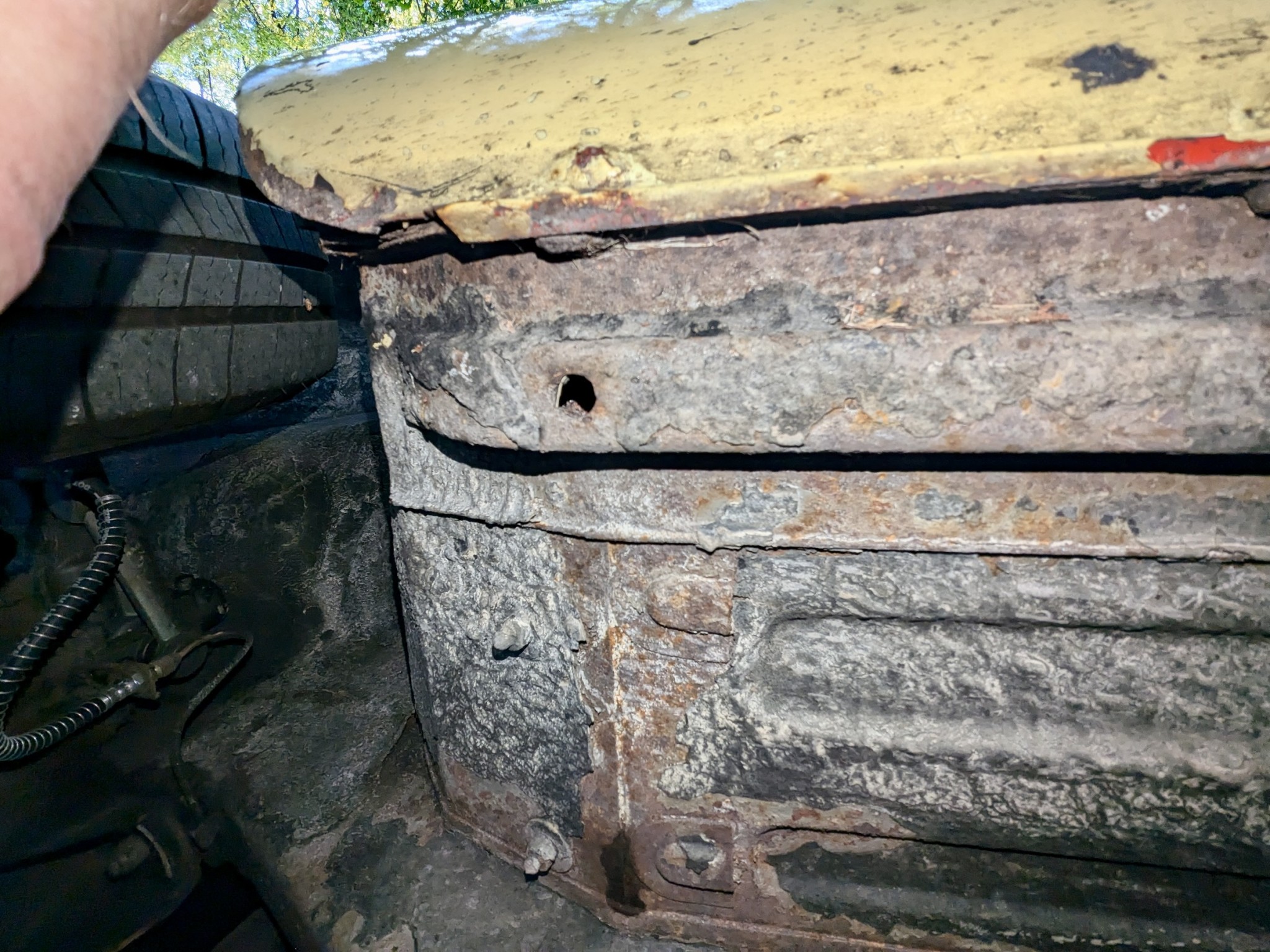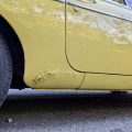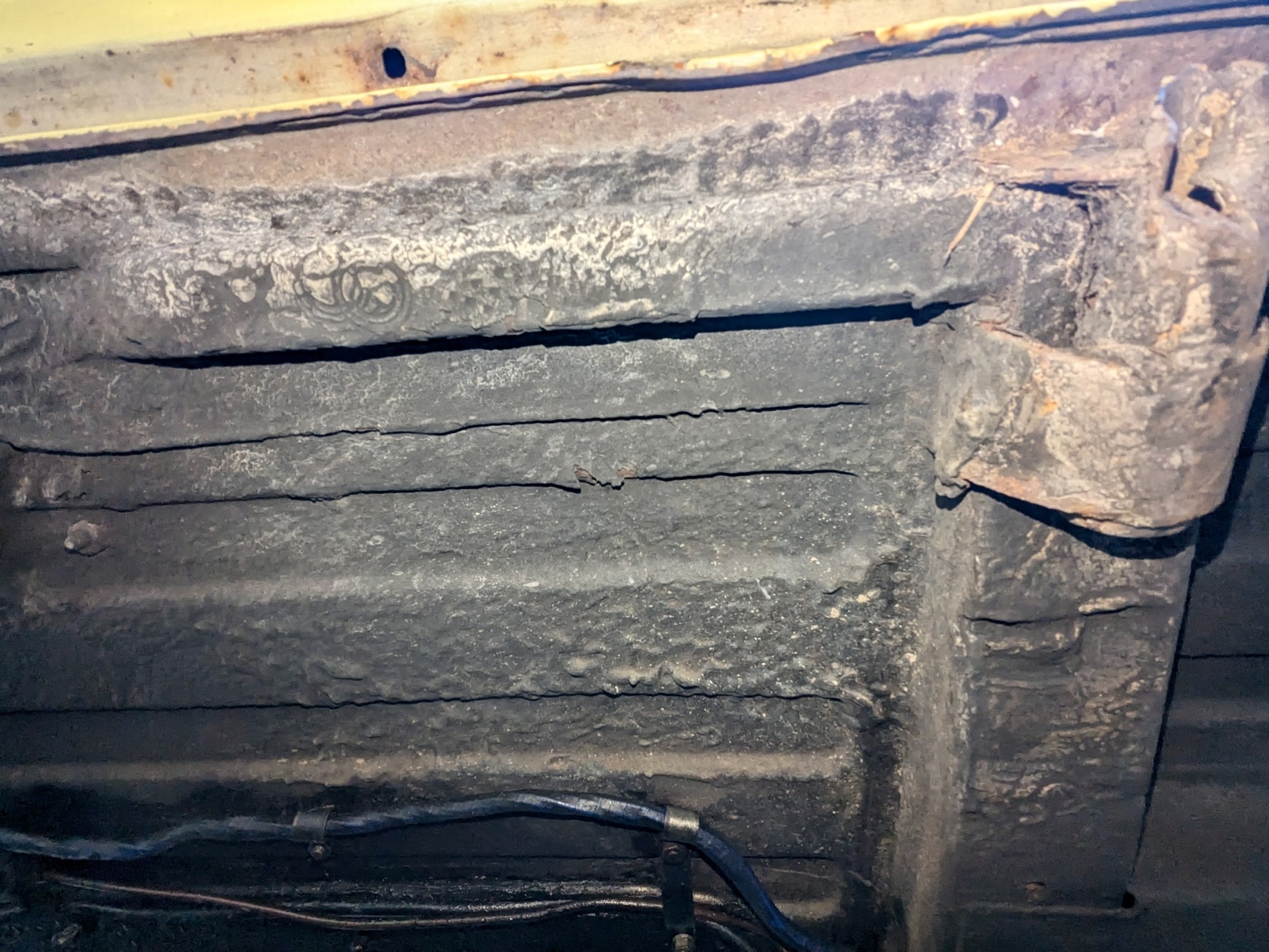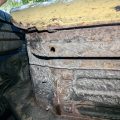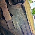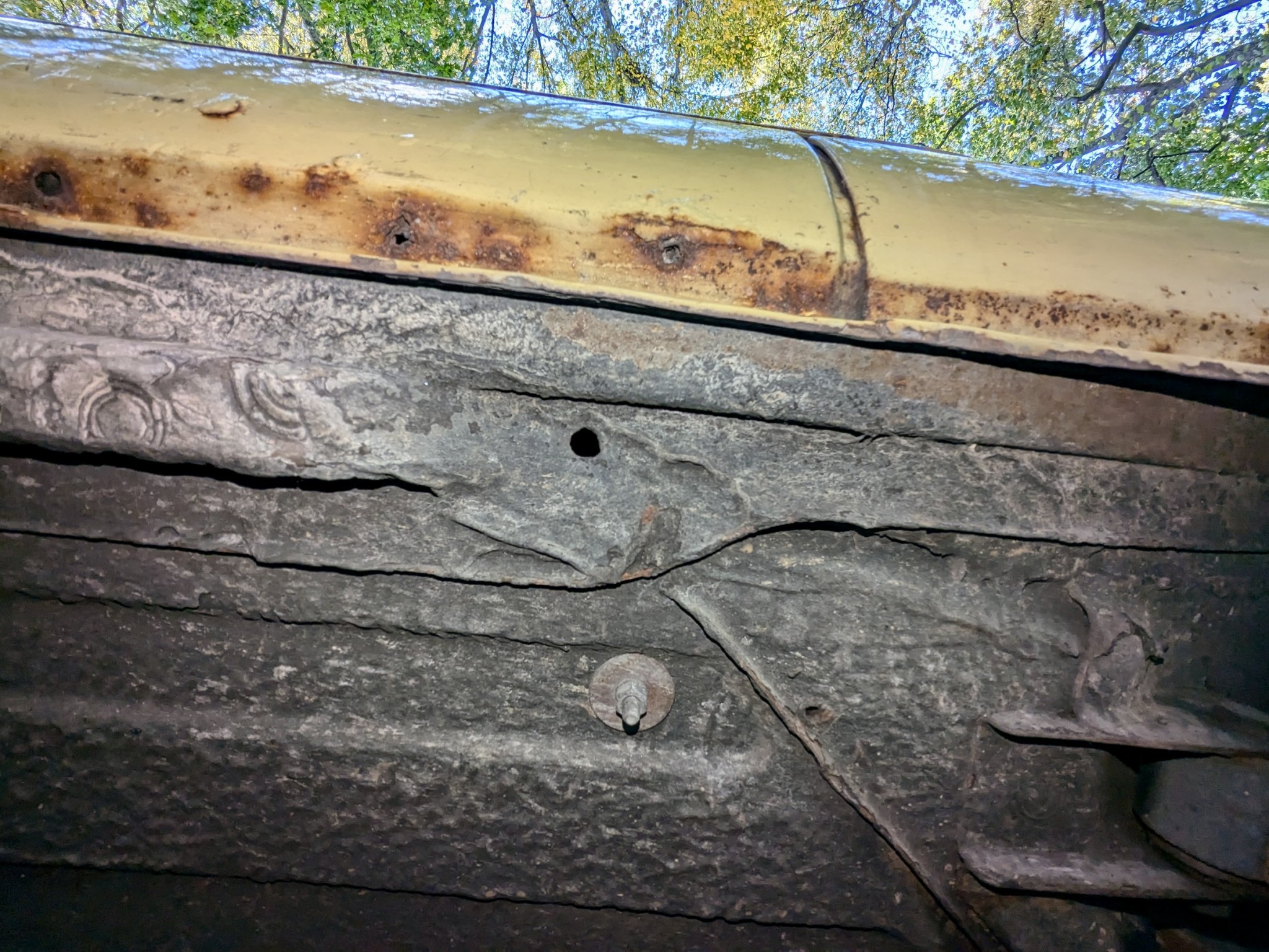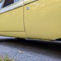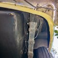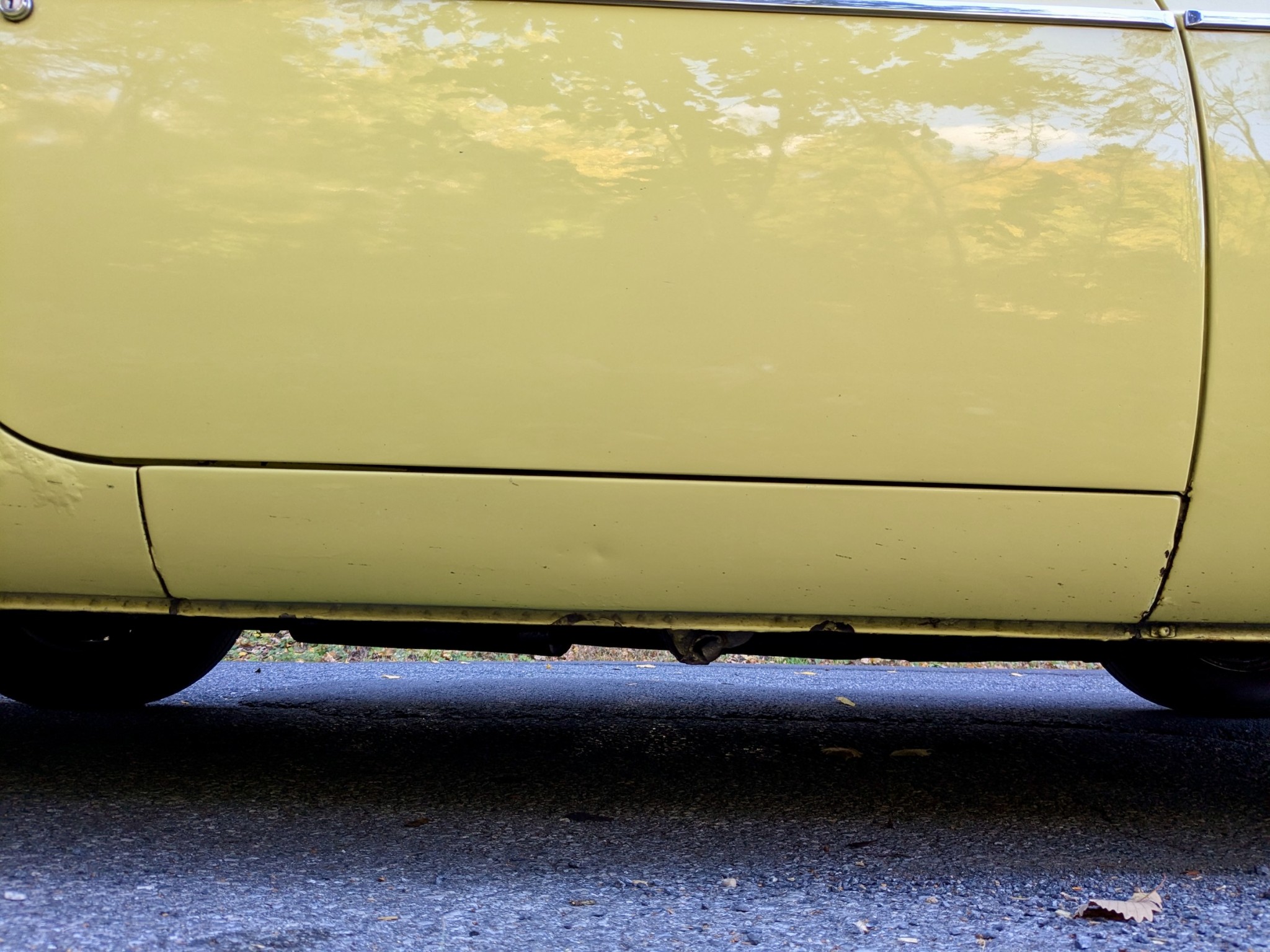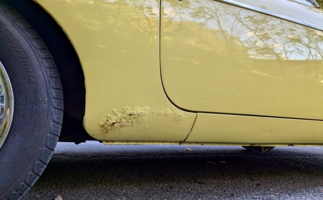 There is no bondo on this car, but there is some paint bubbling and surface corrosion on right rear panel. The frame off primrose yellow paint job is about 25-30 years old – car started out as white. I have some old photos of this in a satchel with the car’s history prior to my owning it.