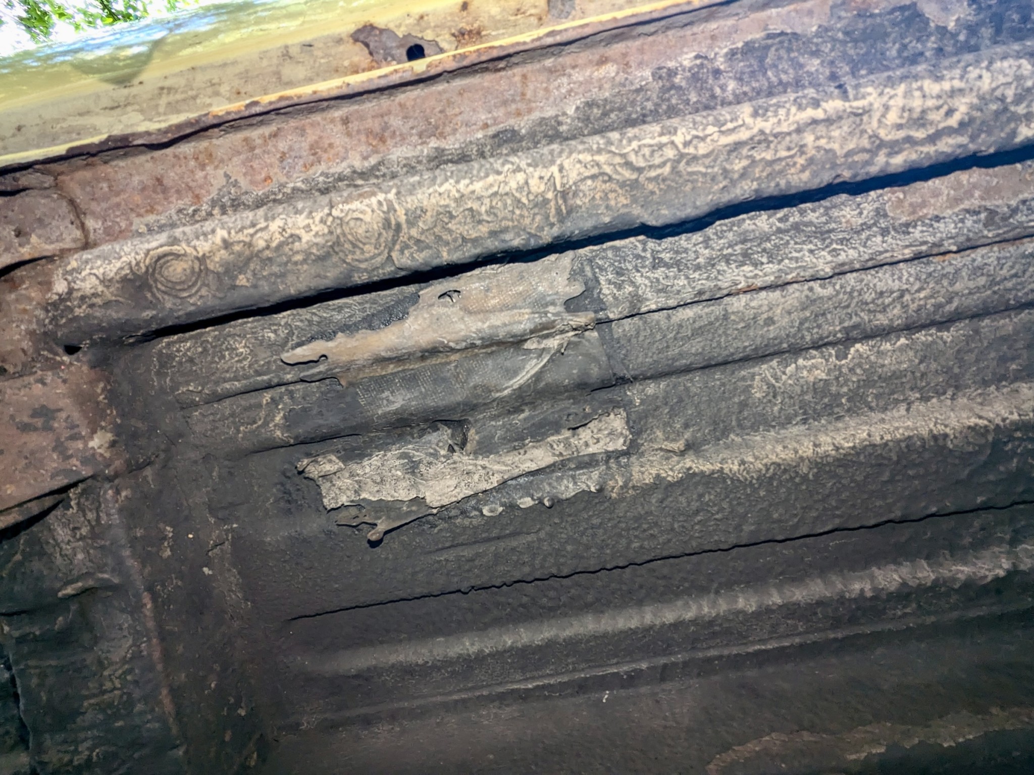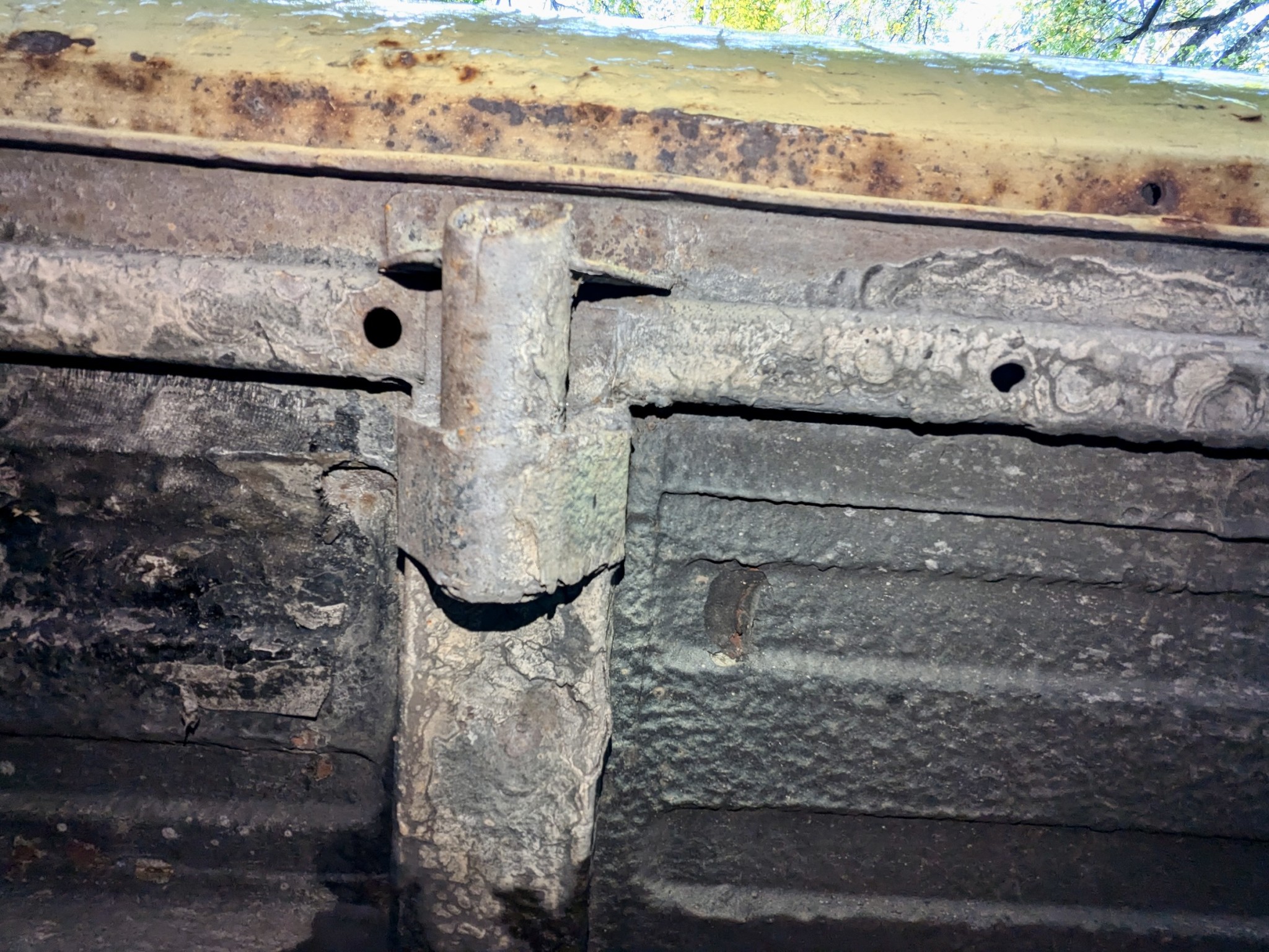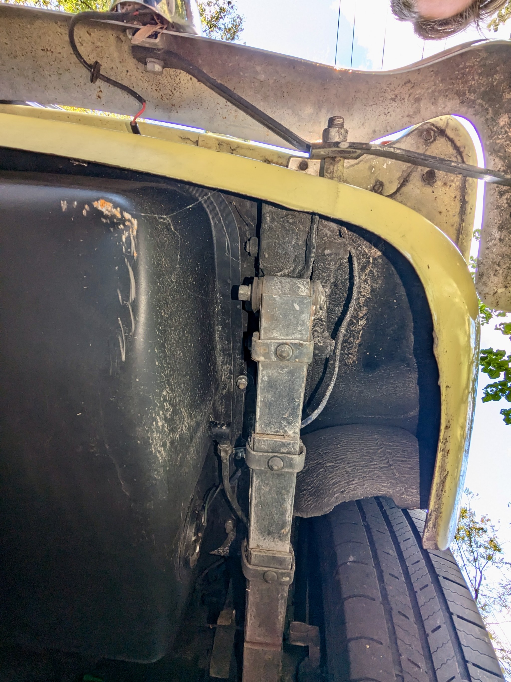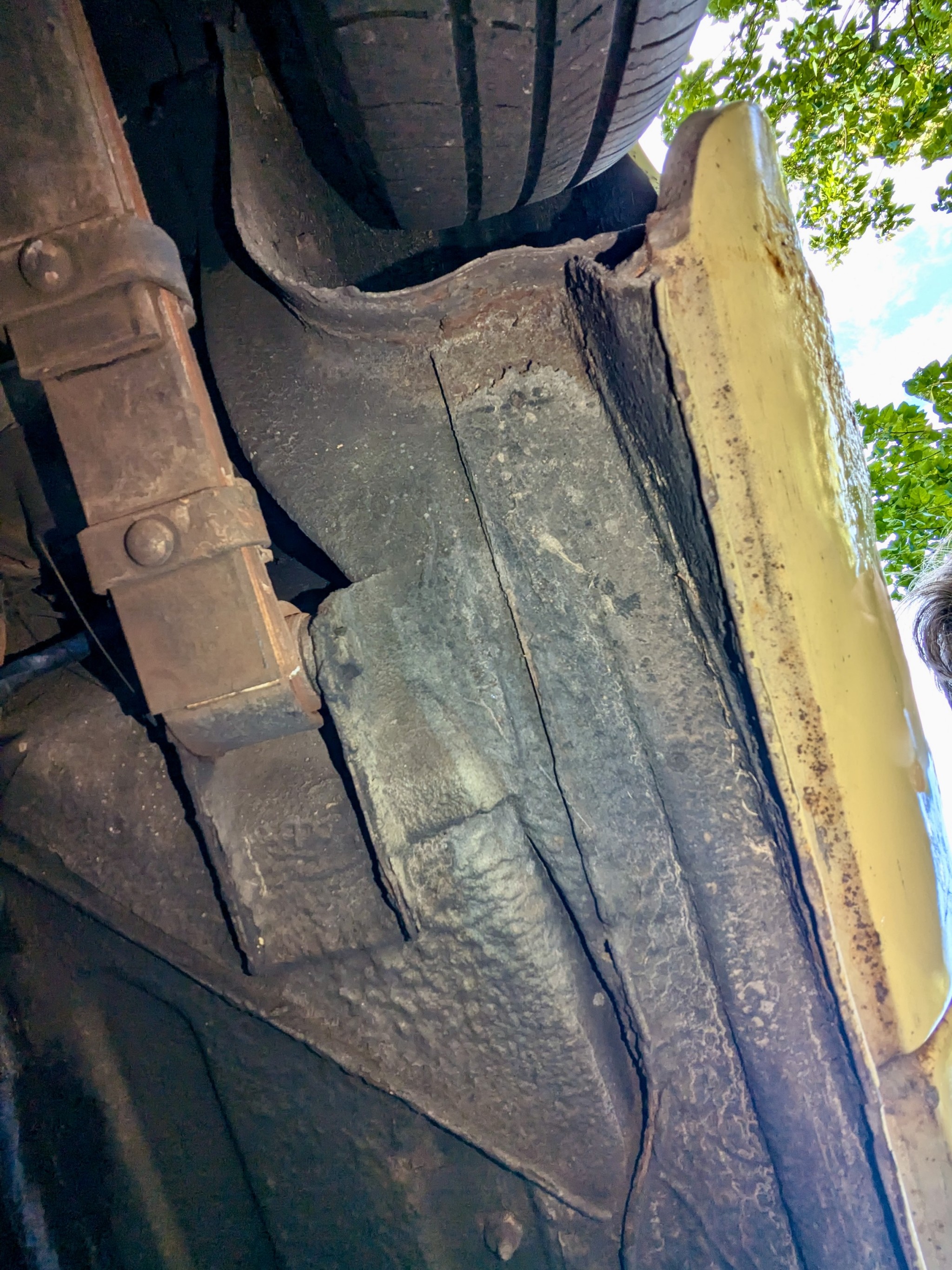 There is no bondo on this car, but there is some paint bubbling and surface corrosion on right rear panel. The frame off primrose yellow paint job is about 25-30 years old – car started out as white. I have some old photos of this in a satchel with the car’s history prior to my owning it.