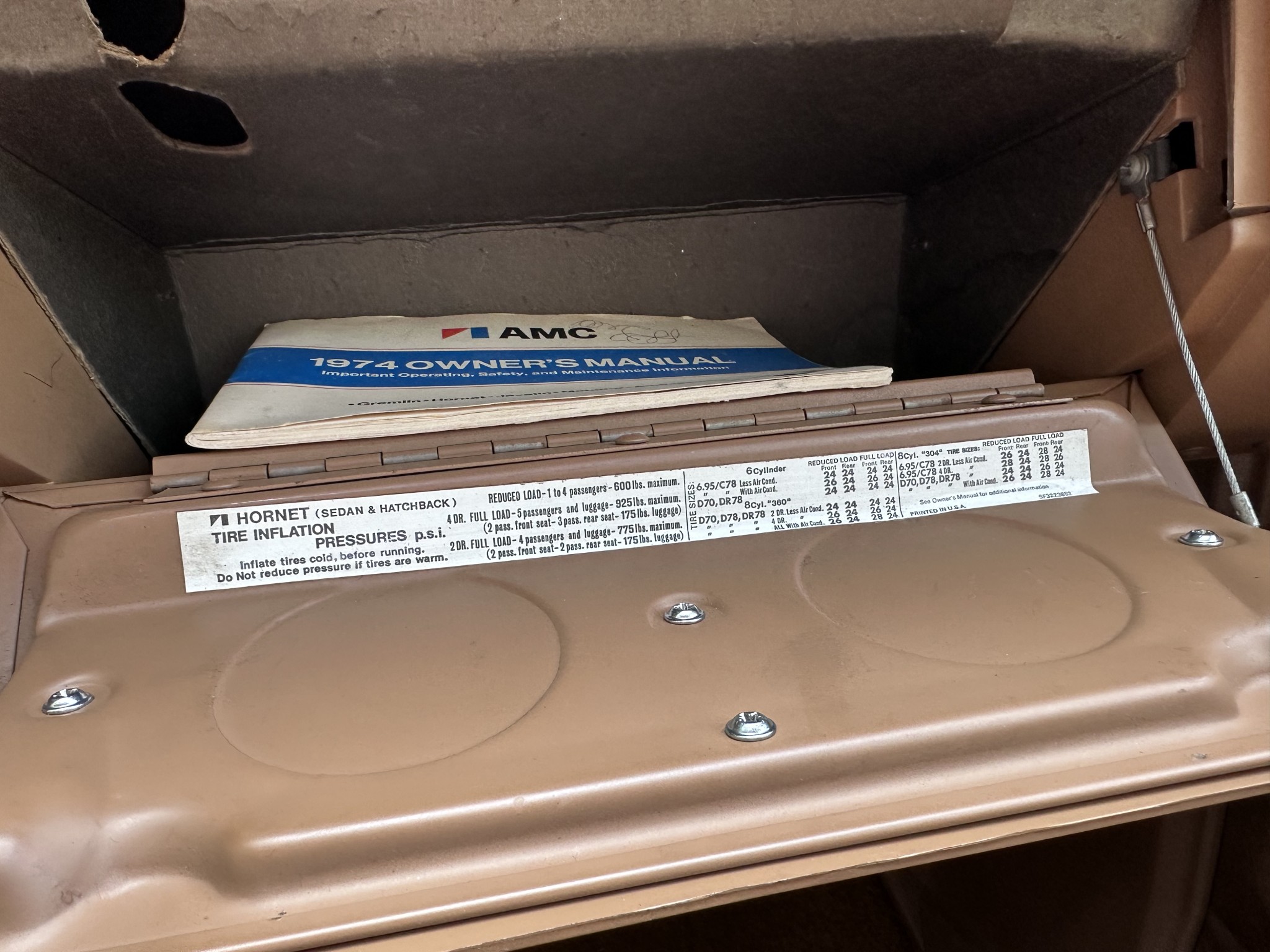 AMC’s trusty 258-cubic-inch six cylinder sits between the spring towers; for 1974, it produced 110 horsepower and 195 lb.-ft. of torque, channeled through the “Torque-Command” automatic with a standard 2.73:1 axle ratio. The original owner (or selling dealer) also opened the wallet quite a bit wider for optional air conditioning, a $400 option (on a car with a $2,774 base price). Unfortunately, the air doesn’t work, but everything else on the car does. The engine compartment looks very clean; the seller appears to have done his homework in getting this Hornet back on the road (it had been sitting for quite some time).