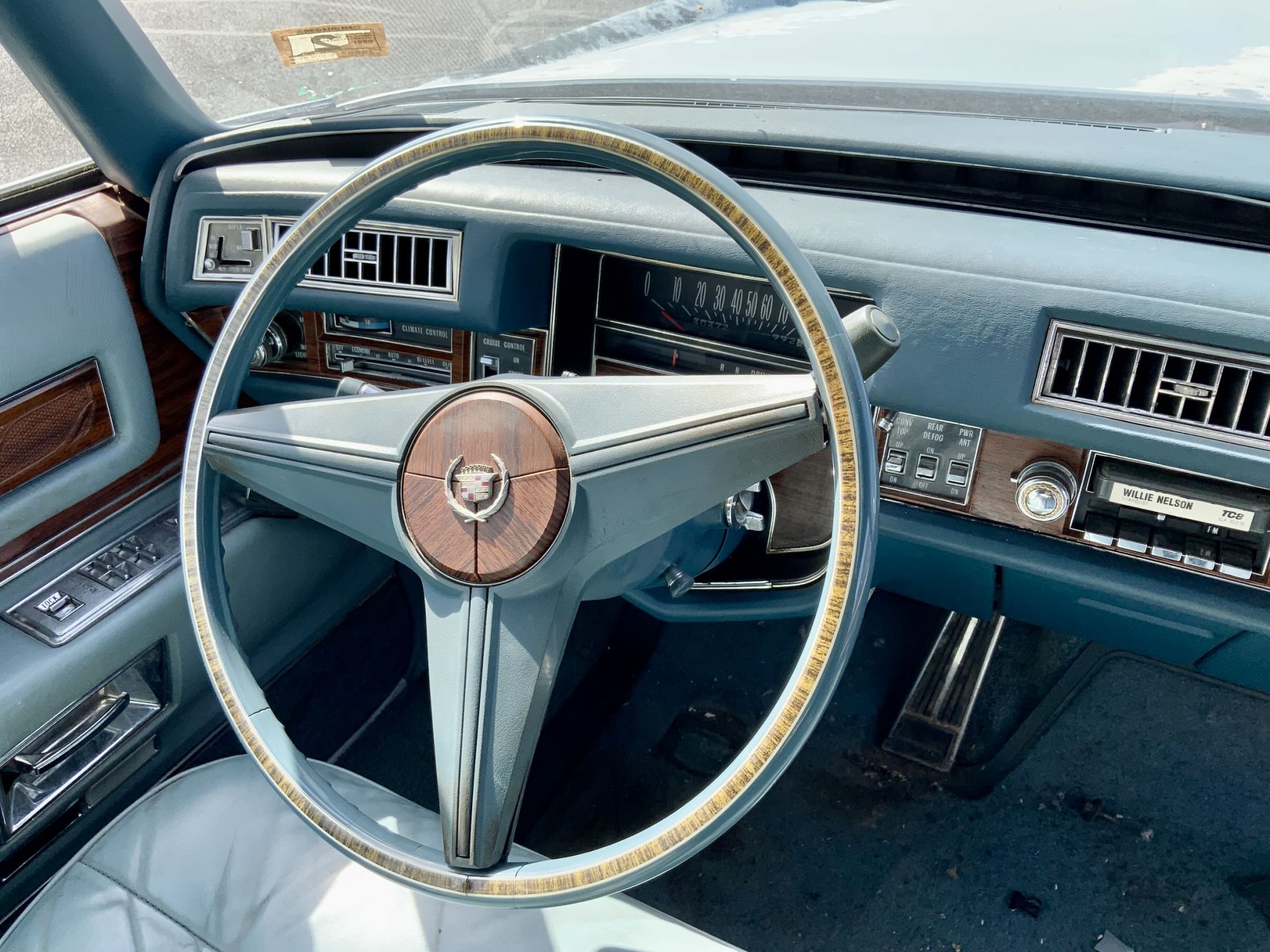 This ’76 Eldo has potential in my book, but the inserts alone are going to run $1500 or more as all 7 need replacing. The chrome is good, the leather is good, the stand up hood ornament us there (a plus), I’m guessing the top works as they are electric and not hydraulic. Not many care for the scissor top system but it allowed GM to use the same rear seat in the convertible as the hardtop. That way they didn’t have to make two different seat backs. Cost cutting I assume.