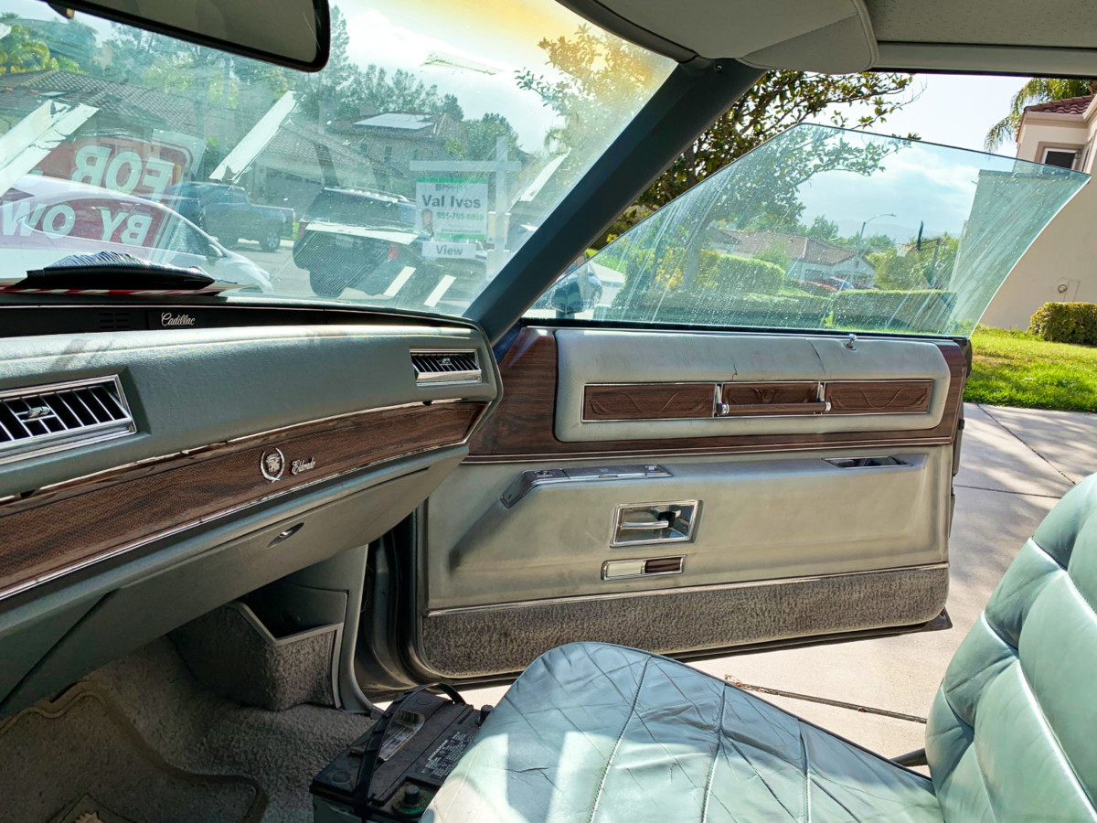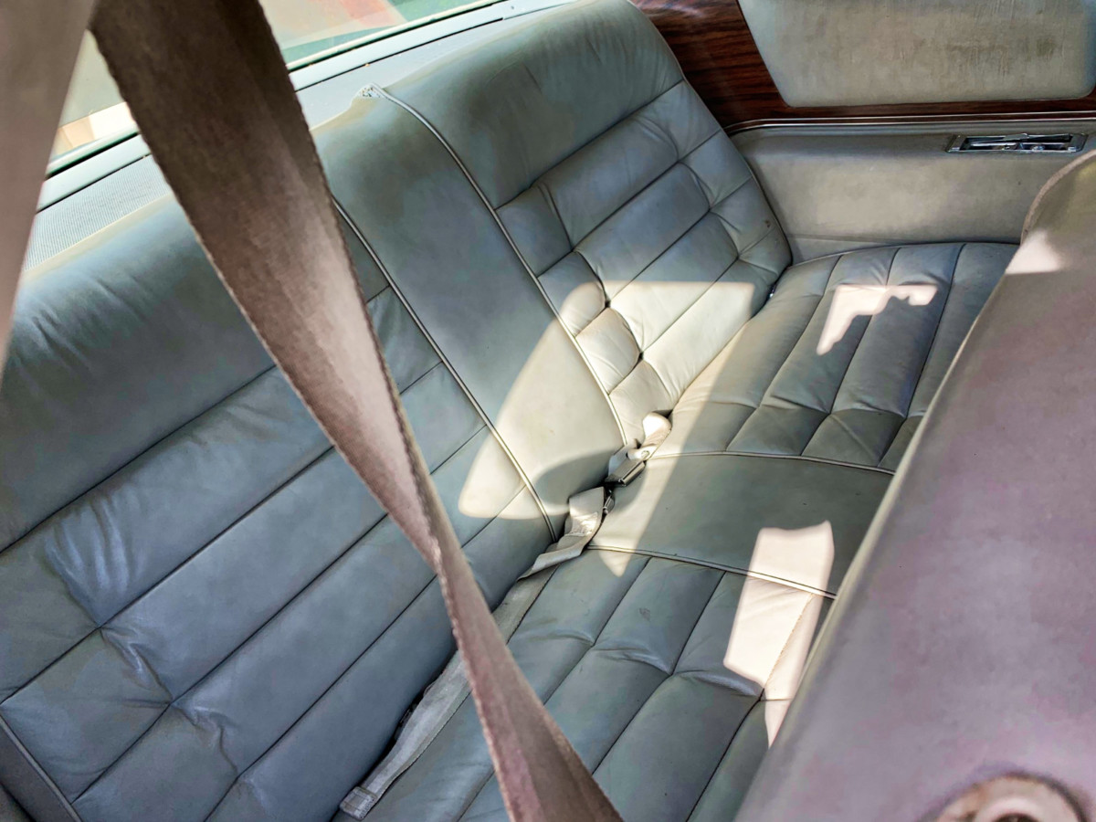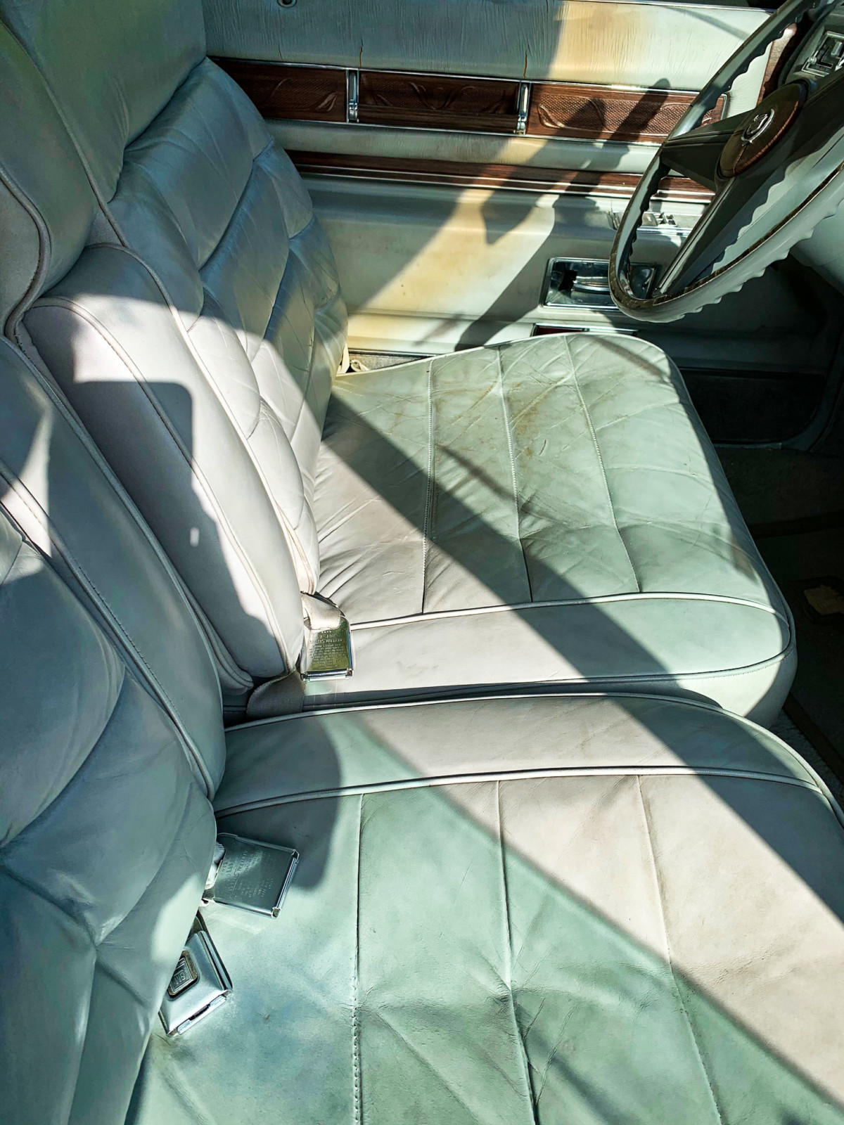 This type of Yachting is all about luxury and comfort. As you can see, that’s exactly what the Eldorado offers. There’s lots of woodgrain and leather here! It’s looking a bit sun-damaged and needs a good detailing, but everything is present, including the original floor mat. The odometer is showing 71,911 and while Olga can’t verify the mileage, the interior looks like a 70k miles car that has just spent a few years outside. The leather doesn’t show signs of being a high mileage car, but it will definitely need to be given some care to make it look and feel great again.