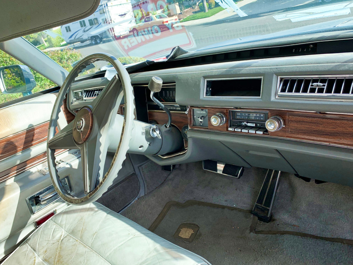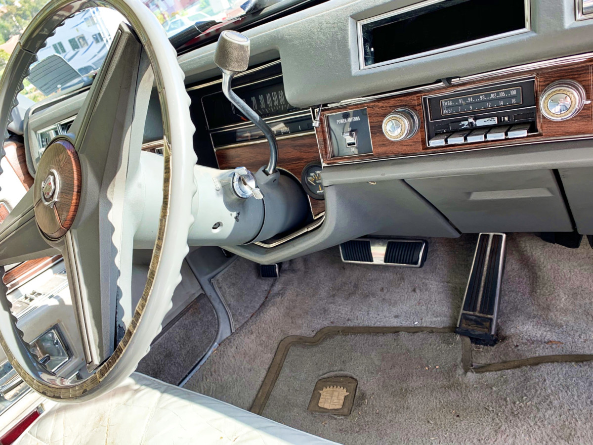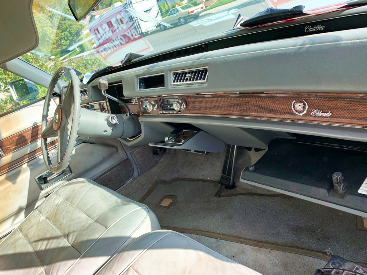 This type of Yachting is all about luxury and comfort. As you can see, that’s exactly what the Eldorado offers. There’s lots of woodgrain and leather here! It’s looking a bit sun-damaged and needs a good detailing, but everything is present, including the original floor mat. The odometer is showing 71,911 and while Olga can’t verify the mileage, the interior looks like a 70k miles car that has just spent a few years outside. The leather doesn’t show signs of being a high mileage car, but it will definitely need to be given some care to make it look and feel great again.
