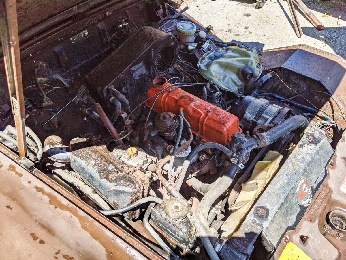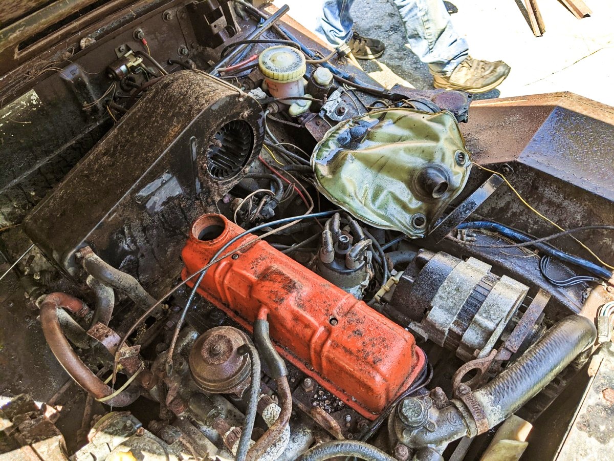 Sorry guys, but this is a pile of parts on wheels. With no cap on the rocker arm cover the engine is probably not worth anything either. The view of the road from the driver’s seat is unique. Spitfire trans and what’s probably a 3.9 or 3.7 rear gear are the only things I can think of that makes buying this feasible. Just don’t put the top down!