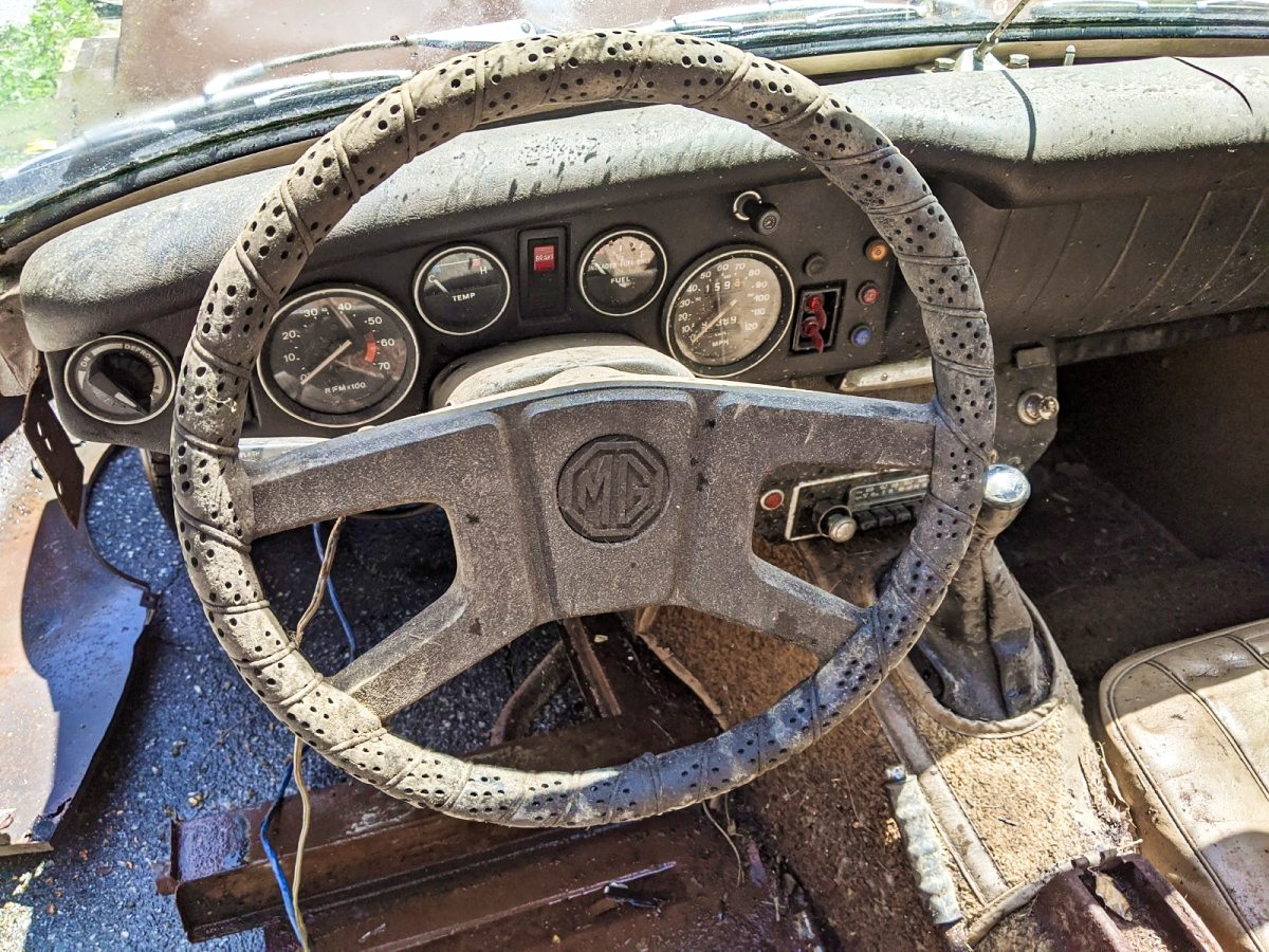 Late Midgets are equipped with MG’s 1500 from the Triumph Spitfire. It’s paired to a 4-speed with full synchromesh. Horsepower was similar to the 1275 cui engine found in earlier cars but offered more torque, which helped with top speed and acceleration. The seller drove the car into their garage when they purchased it, but it hasn’t been started in years. They tried to turn it over using the auxiliary belt but didn’t have any luck getting it to turn. Assume that it’s seized, but a little ATF in the cylinders and a breaker bar might be all it takes to get it moving freely.