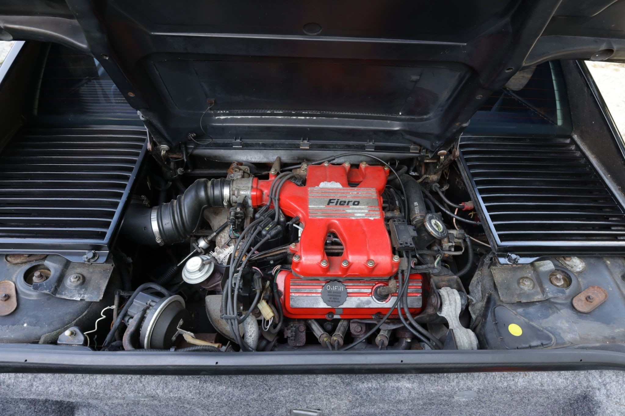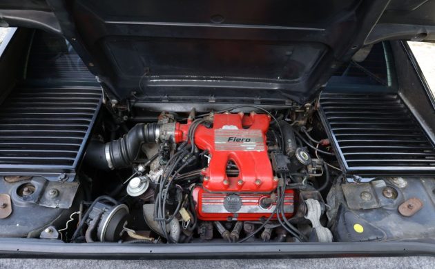 Under the rear deck sits the 2.8-liter V6, the highest-output engine available in the Fiero lineup at the time. With a lightweight chassis and manual transmission, the V6-powered cars offered significantly more performance than the original four-cylinder models and remain the most desirable among early Fieros.