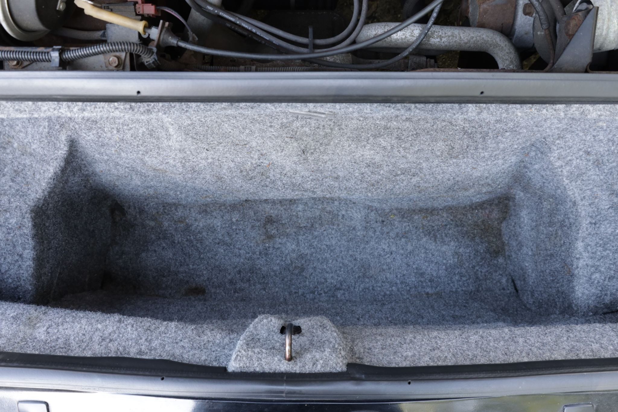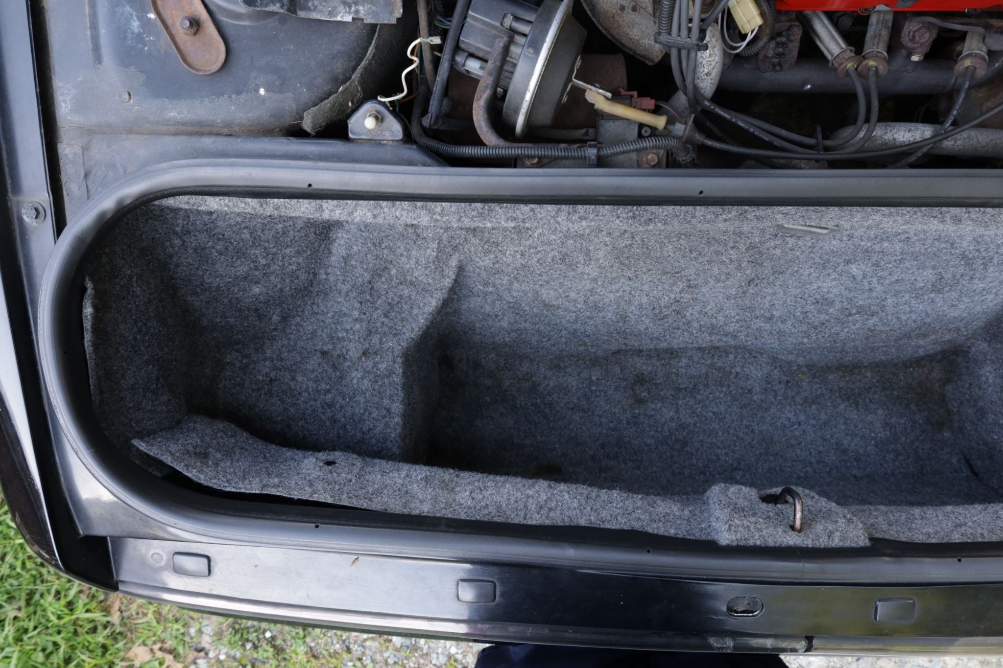 Cosmetically, the car shows its age with scratches, chips, and areas of missing paint. The seller notes that a new battery tray will be needed as the original has rotted, and the trunk lock will also need replacement. Underneath, there is some light surface rust, but nothing beyond typical wear for a car of this era.