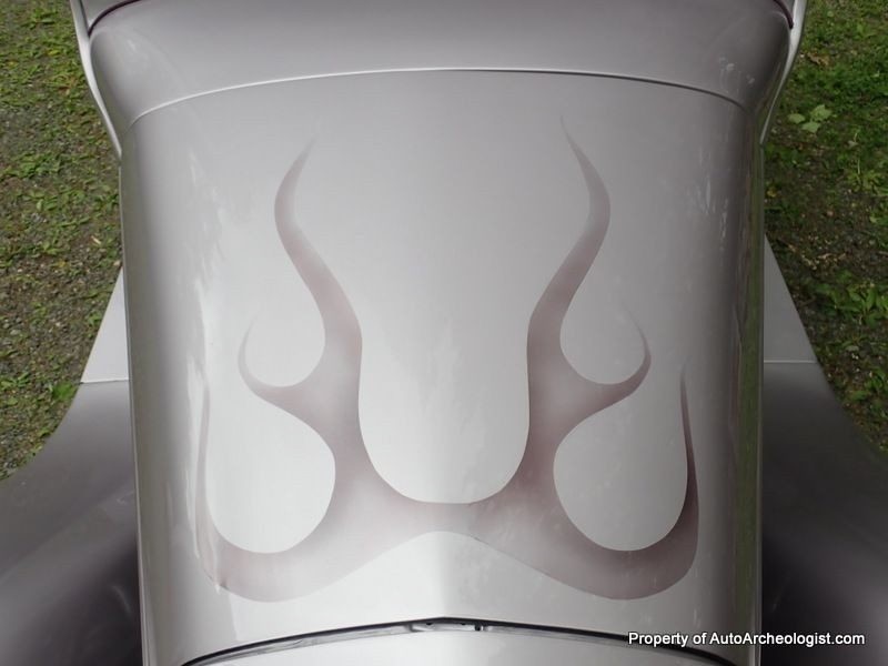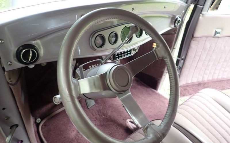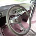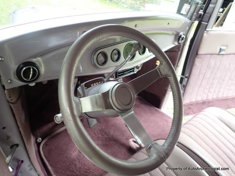 The interior has been custom built to match the Vicky’s Orchid Mist paint (a beautiful choice, by the way). It has a GM tilt column, aftermarket air conditioning, stereo, Cool-It Insulation, leather and tweed upholstery, and an overhead console. The electronics, battery, and aluminum fuel cell all are hidden beneath the rear seat, and the doors open by solenoid.