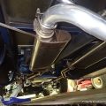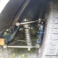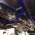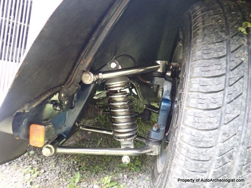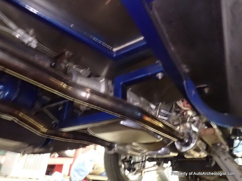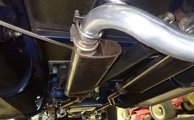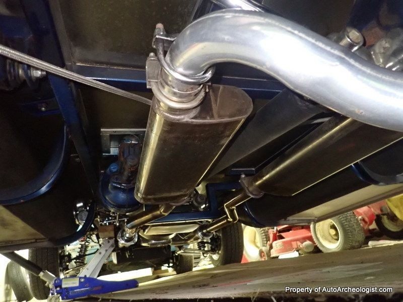 The chassis is fabricated from square tubing and is painted metallic blue. Up front is a Heidt’s Mustang II suspension with rack-and-pinion steering, in addition to Wilwood power disc brakes. The rear suspension is the aforementioned Corvette setup with chromed drum brakes.
