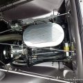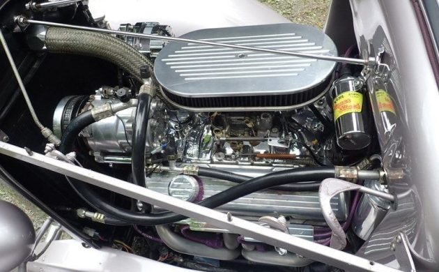 Another mainstay of hot rodding is the Chevy small block. Some people are tired of seeing them under the hoods of customs and hot rods, but they’re under there for a reason; they are powerful, easy to repair, and reliable. This one was apparently rebuilt by the previous owner and comes from a ’77 C20. It’s been dressed up with billet and chrome pieces, a polished Edelbrock aluminum intake manifold and carburetor, and a set of HPC coated headers. The transmission is a Turbo 350 and the rear differential is a limited-slip unit from a Corvette (the rear suspension is an independent setup from a Corvette, as well).