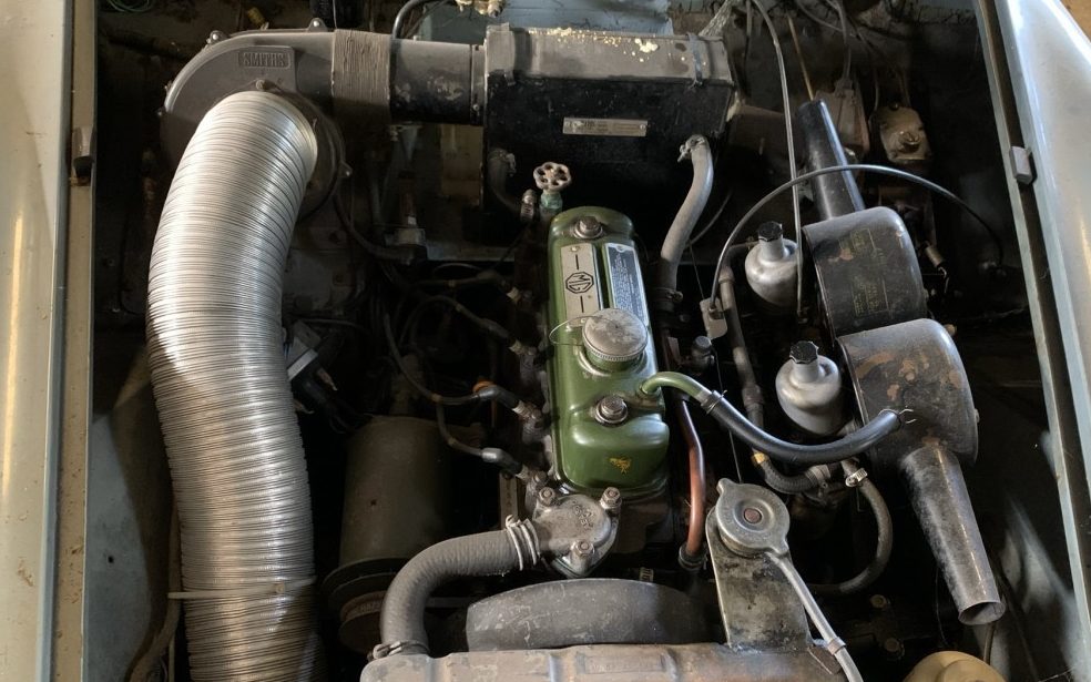 This particular Midget is showing the signs of wear that one would typically expect on a 58-year-old car. The seller indicates that there is some rust present on the driver’s side door and some small dents on the front fender line. All in all, this Midget presents well, the gray-blue finish is a bit dull but very passable. All of the stainless steel trim is in place where it belongs, not dented, and still in possession of a shine. From every angle, the body panels appear well-aligned. The seller advises that the top and rear window are in good nick.