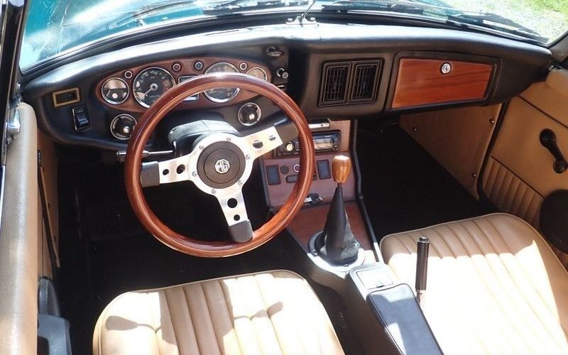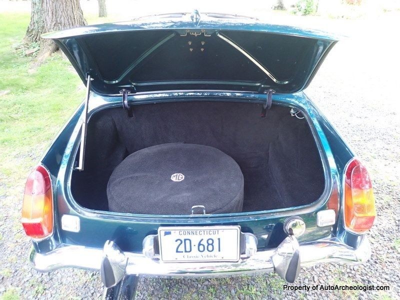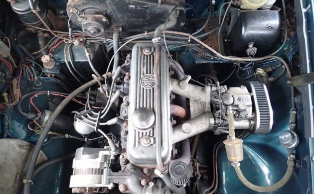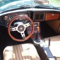 The car has been used regularly in the 15 to 20 years it’s been completed, so it’s not perfect, but it’s still very nice. The interior is handsome, with a nice aftermarket steering wheel and wood trim, and everything works except the windshield wipers (and the heater fan works only on one speed). This MGB has the optional overdrive, which reduces the final drive ratio from 3.91:1 in fourth gear to a calm 3.20:1 for cruising (and a useful split ratio in third: 4.43:1). There’s no power steering or power brakes, but MGBs have discs up front, so this one will stop well with a little leg muscle.