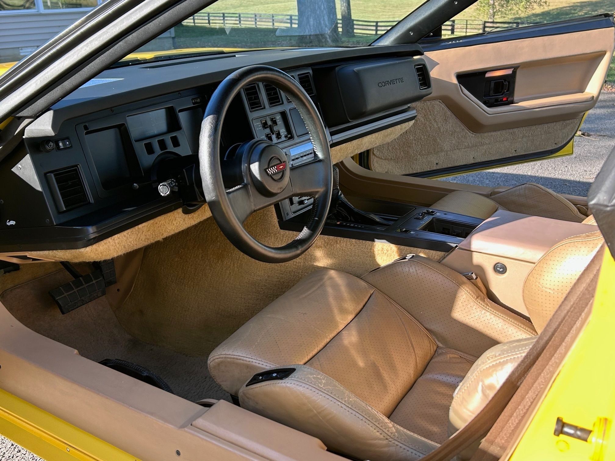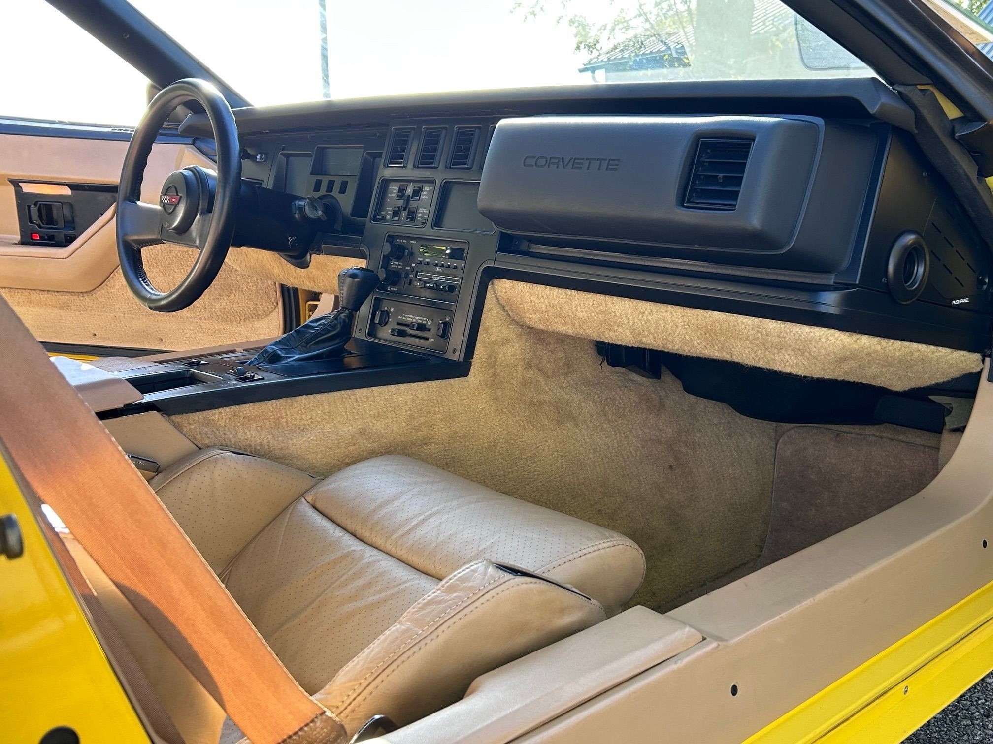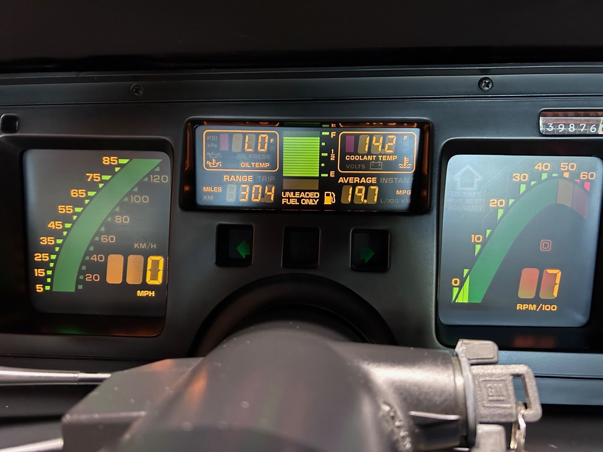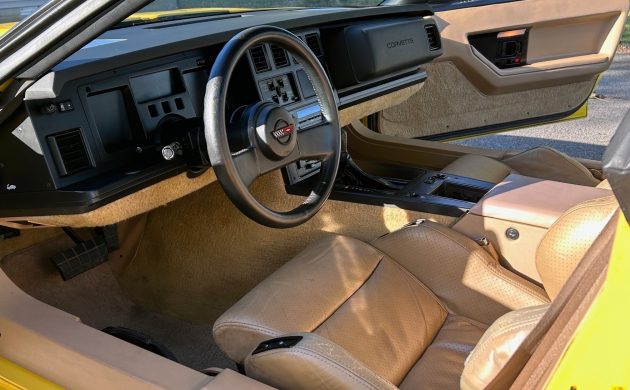 Behind the 350 was GM’s 700-R4 four-speed automatic, whose 3:06:1 first gear ratio helped the Corvette leave a couple wide black patches on the pavement if the owner was feeling like letting off a little steam. With a standard 2.59:1 rear axle ratio and a .070:1 overdrive fourth gear, it would also loaf on the highway and have plenty of revs available for a 150+ mph top speed. This Corvette’s cockpit in no way looks like it has 38 years between it and Bowling Green. The saddle interior looks great with the Yellow (that’s it’s name!) paint, and the digital dashboard will always be cool (at least if you were 10 in 1987 as I was). Yes, that’s still my favorite part of 1980s Corvettes.
