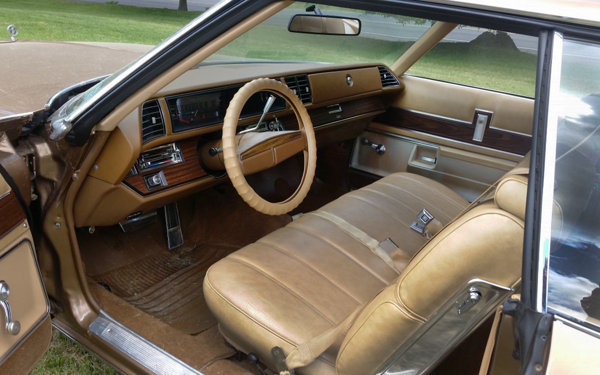 The interior is pretty typical for most American cars from the 1970s, vast expanses of hot-in-the-summer-cold-in-the-winter vinyl seating surfaces, and they look great here. For those of you who have had enough of green cars from the 1970s, here you go! And, it’s a two-door to boot!