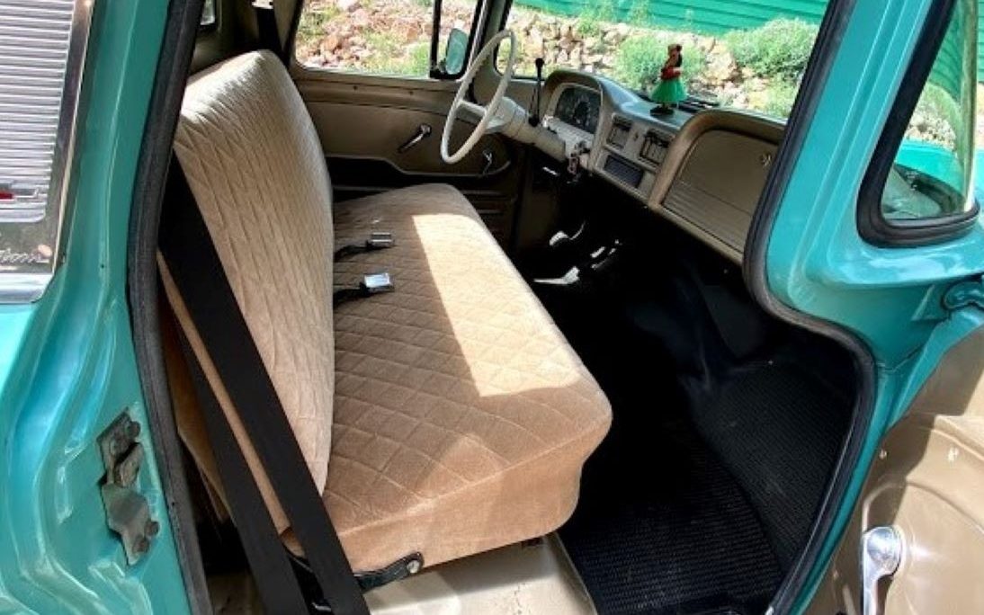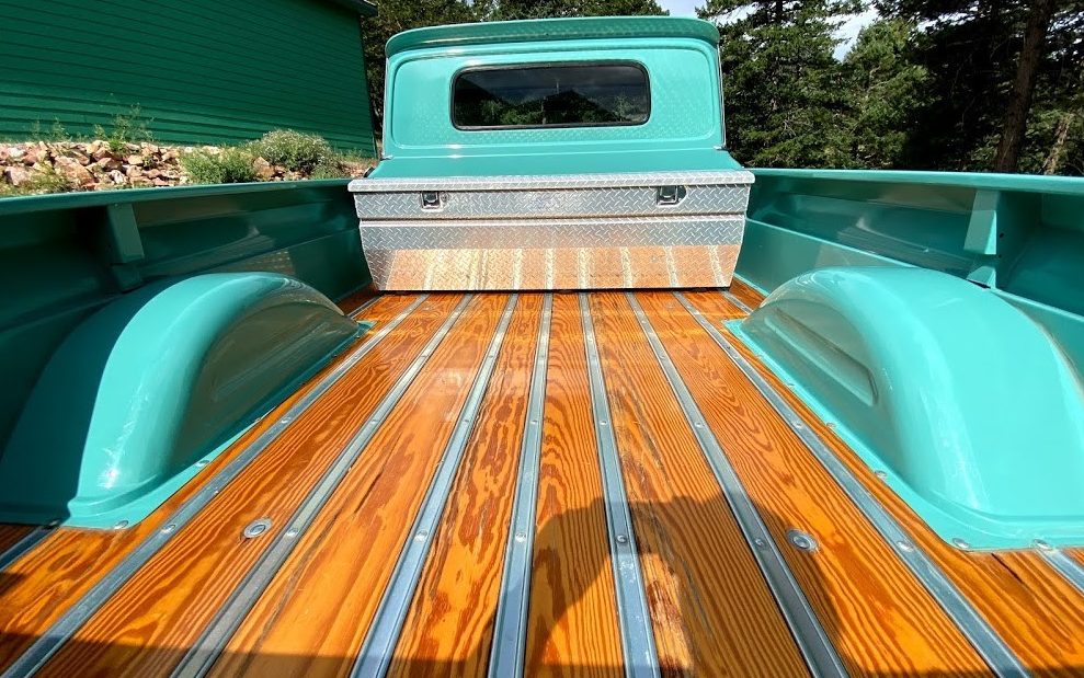 So what’s been done to this beauty? It would be easier to explain what hasn’t. The seller tells us that this is not a 99 point show truck as it has a few small paint chips; they have to be very minor as this C10 presents so well. The deep aqua finish was applied in 1989 and still looks spectacular 31 years later. Forget about rust or corrosion, there isn’t any. The cargo bed is believed to have been replaced when the truck was repainted and it shows as unused, there are no visible scratches or gouges – very sharp woodwork. To add to the effect, late model rally-style truck wheels have been added which work perfectly with the white stripe tires.